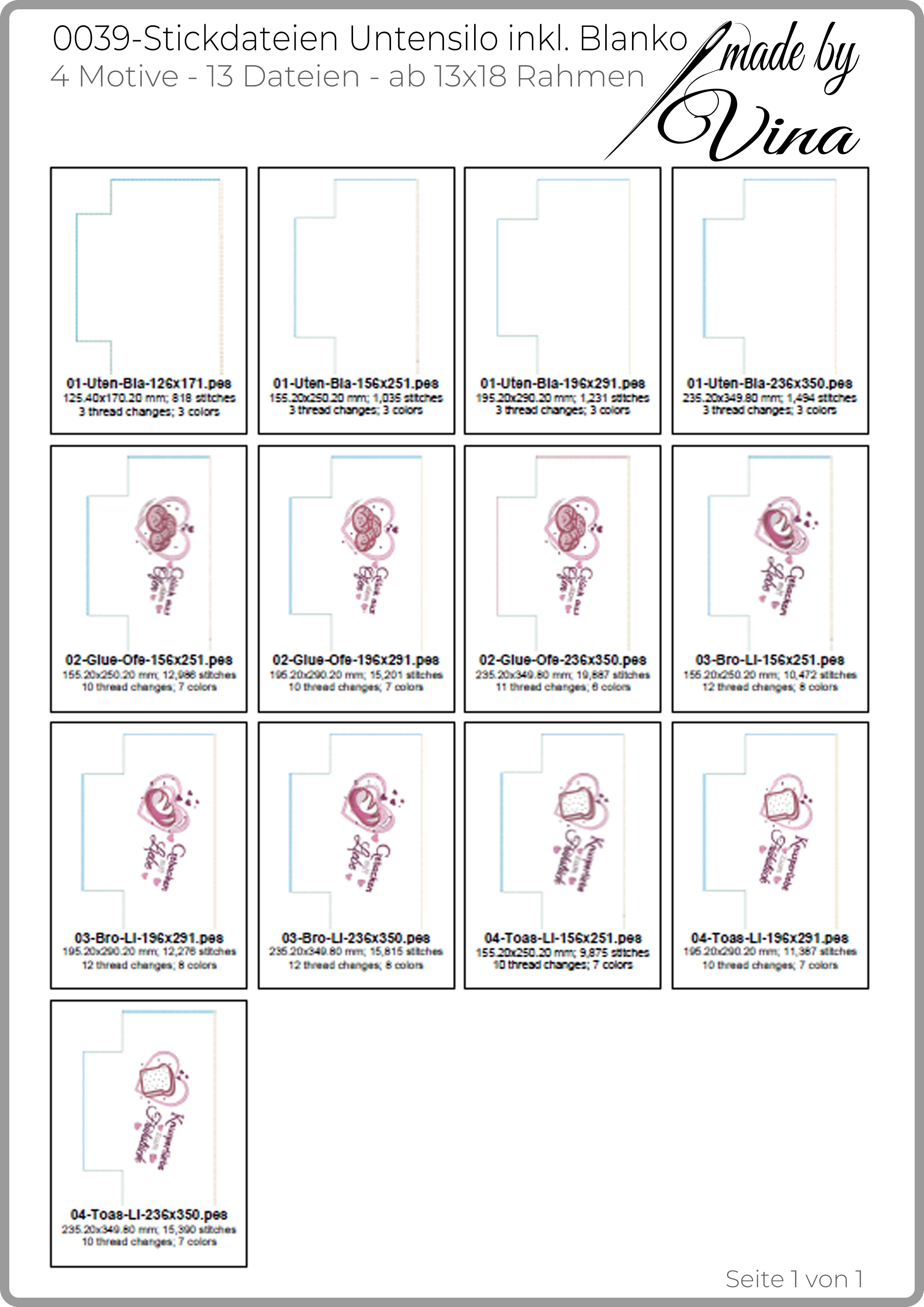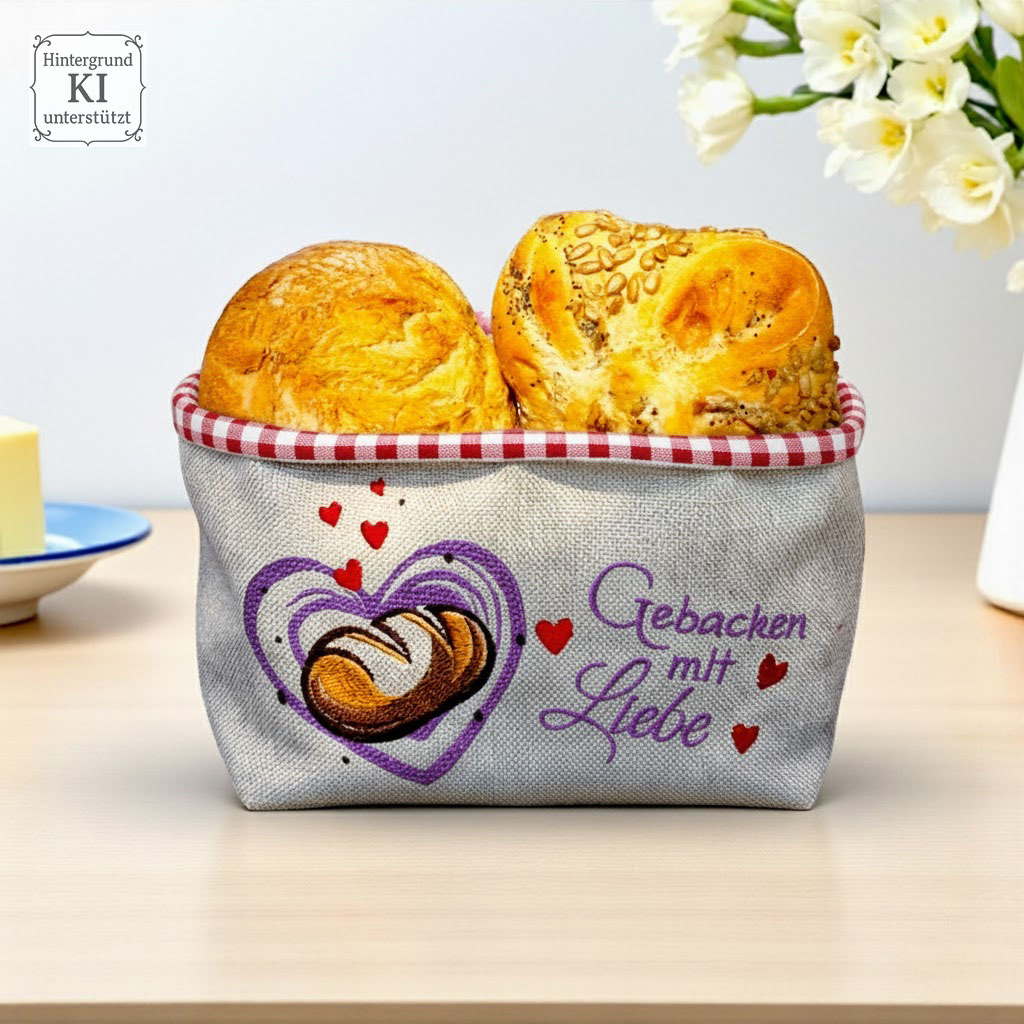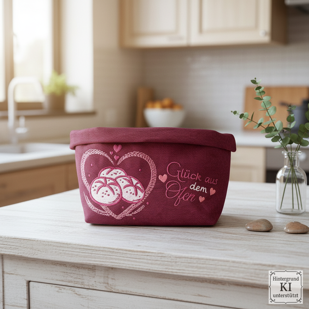 Ordnung trifft Herz: Mit diesen Dateien stickst du im Handumdrehen hübsche Utensilos – wahlweise schlicht (Blanko) oder mit liebevollen Frühstücks-Motiven wie Brot/Toast & Herzornamenten. Perfekt für Brötchenkorb, Badezimmer, Nähzimmer oder Kinderzimmer.