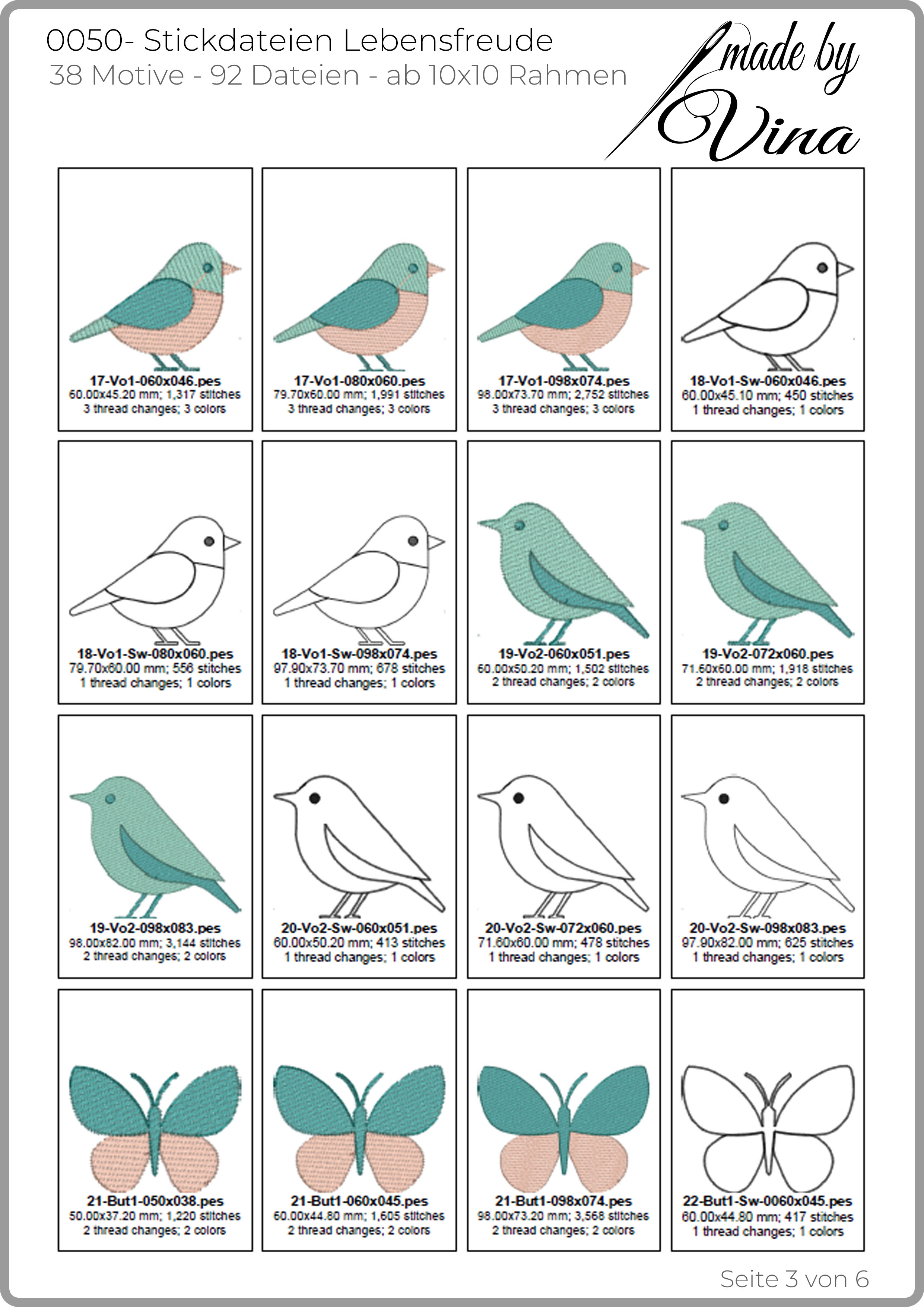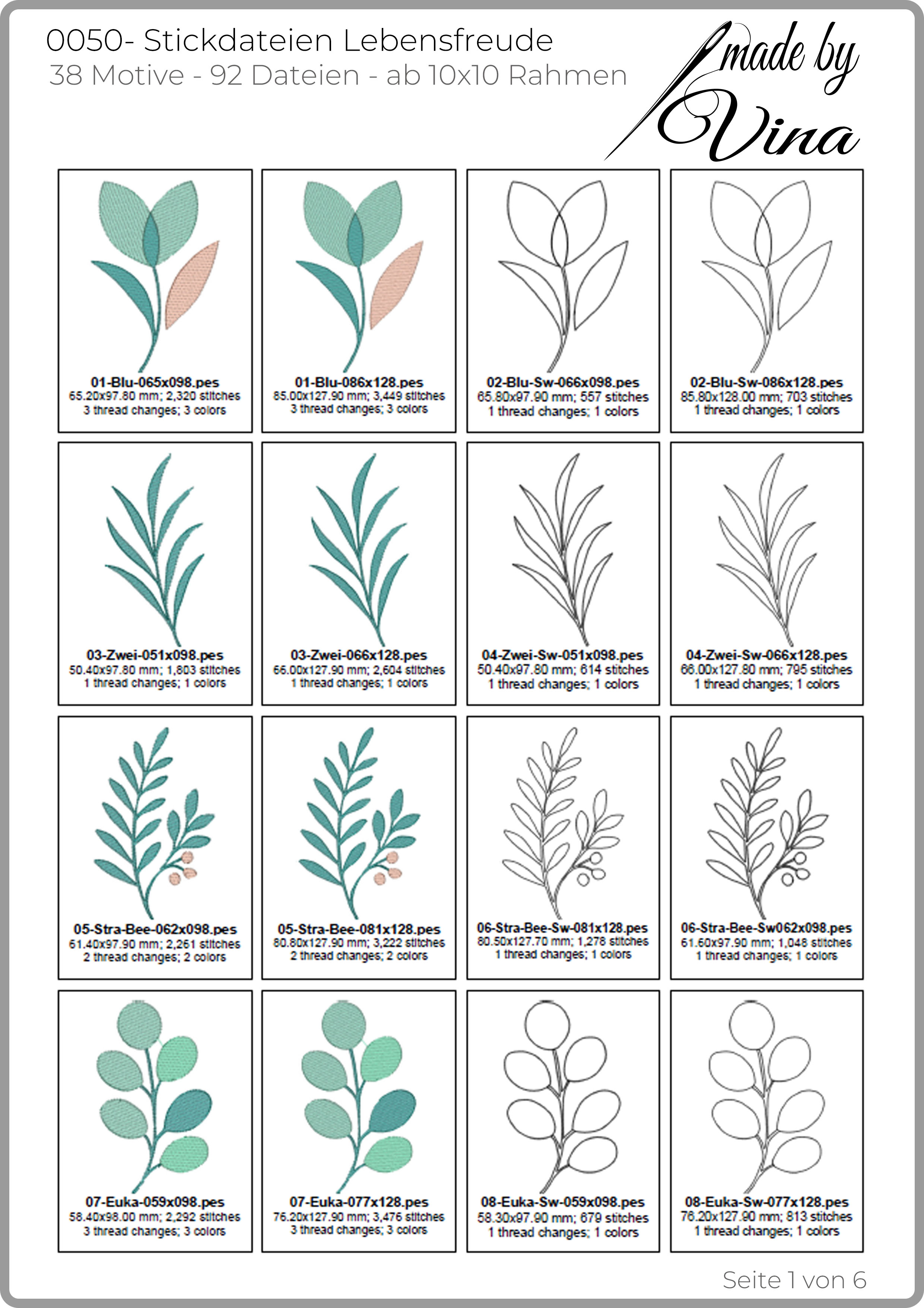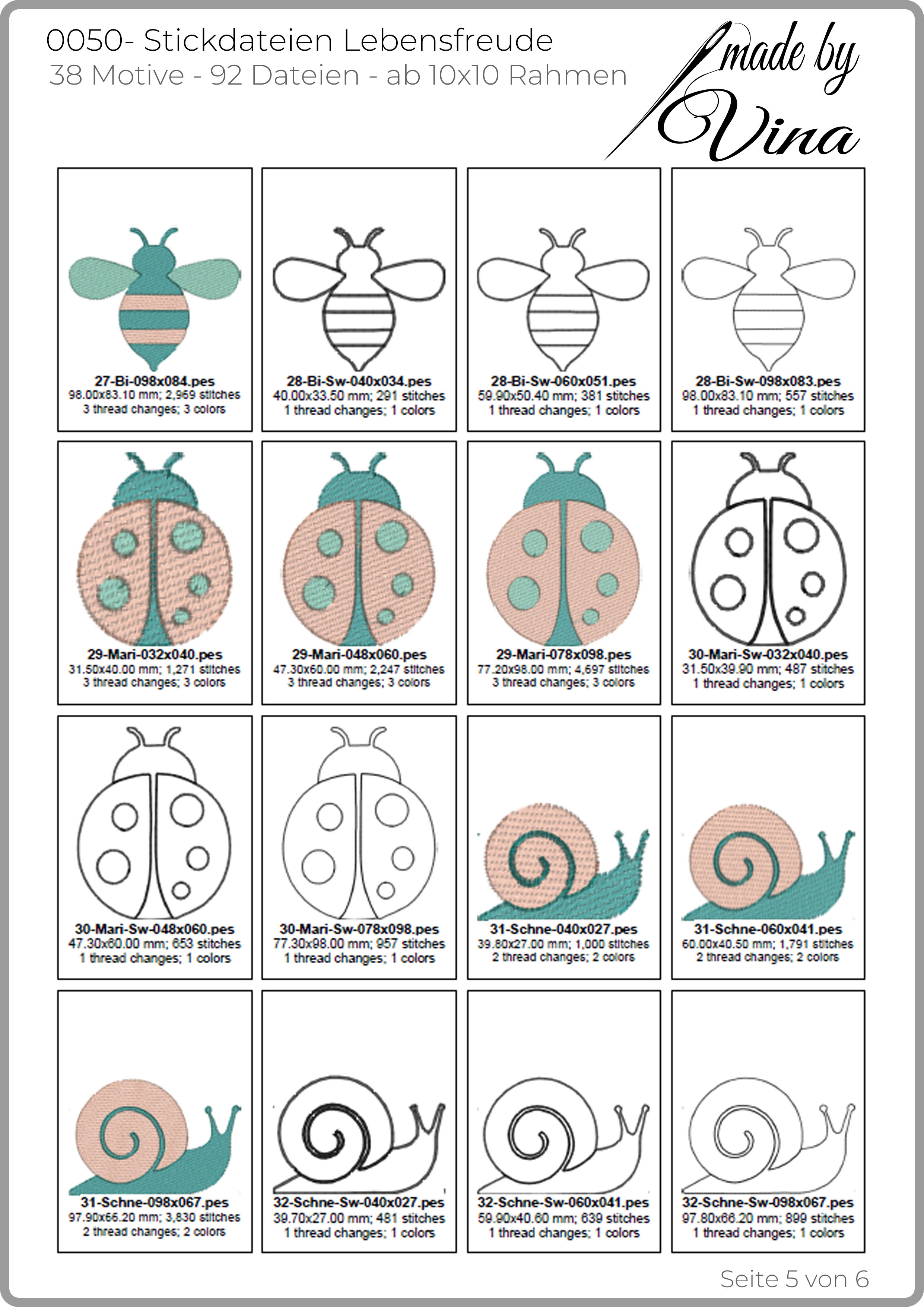 Die vollständigen Übersichten aller enthaltenen Stickdateien findest du in den Produktbildern auf mehreren Seiten.