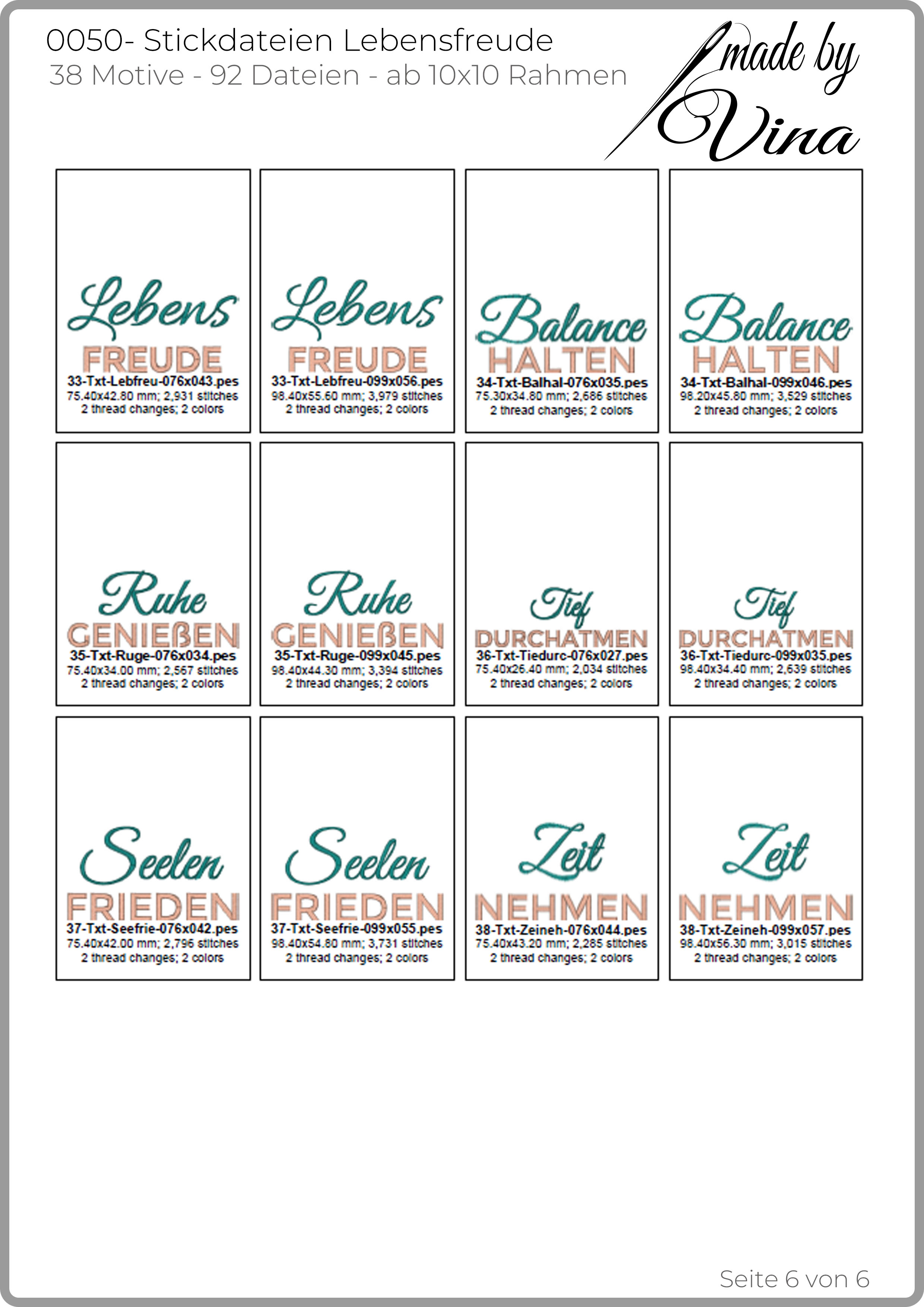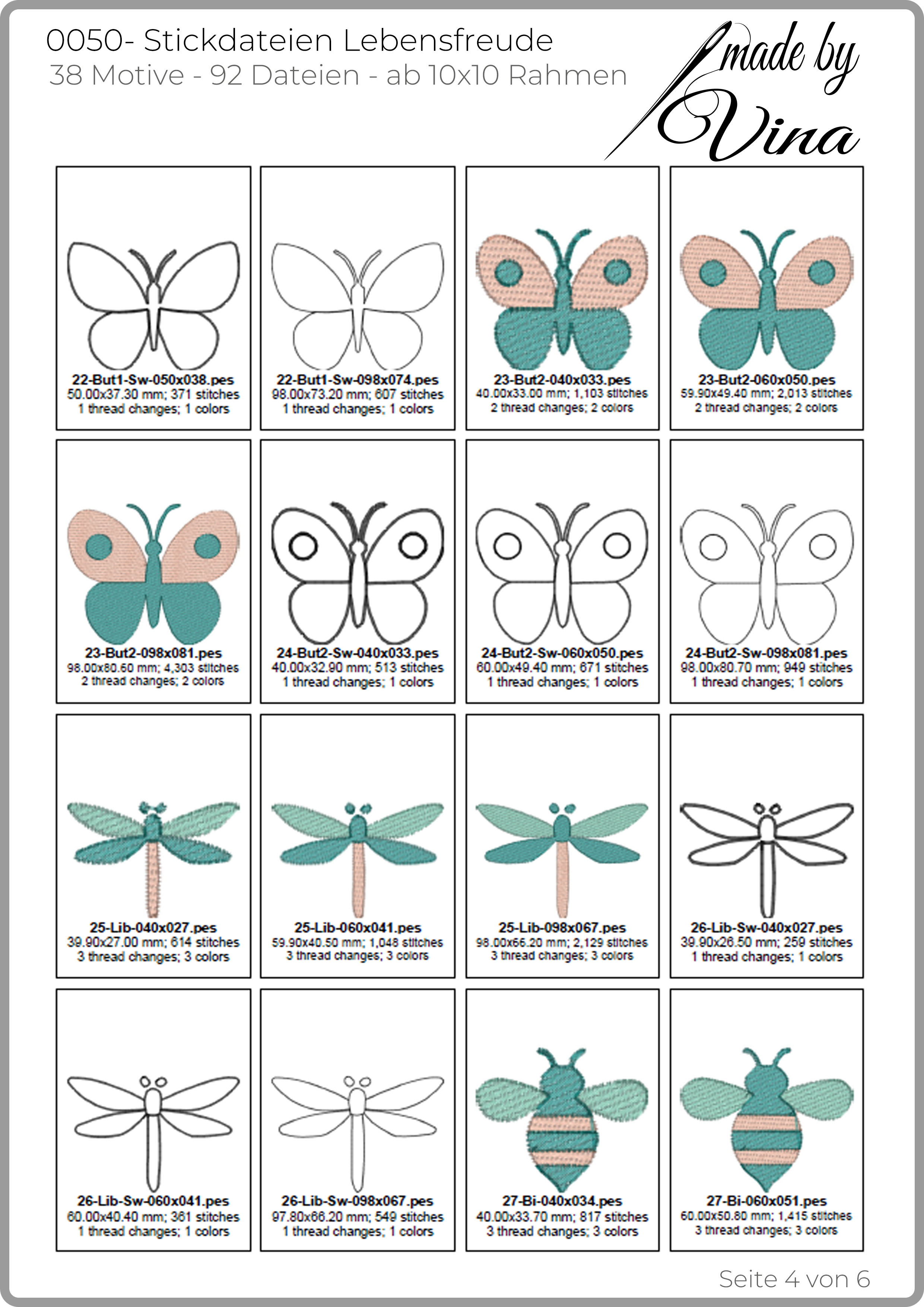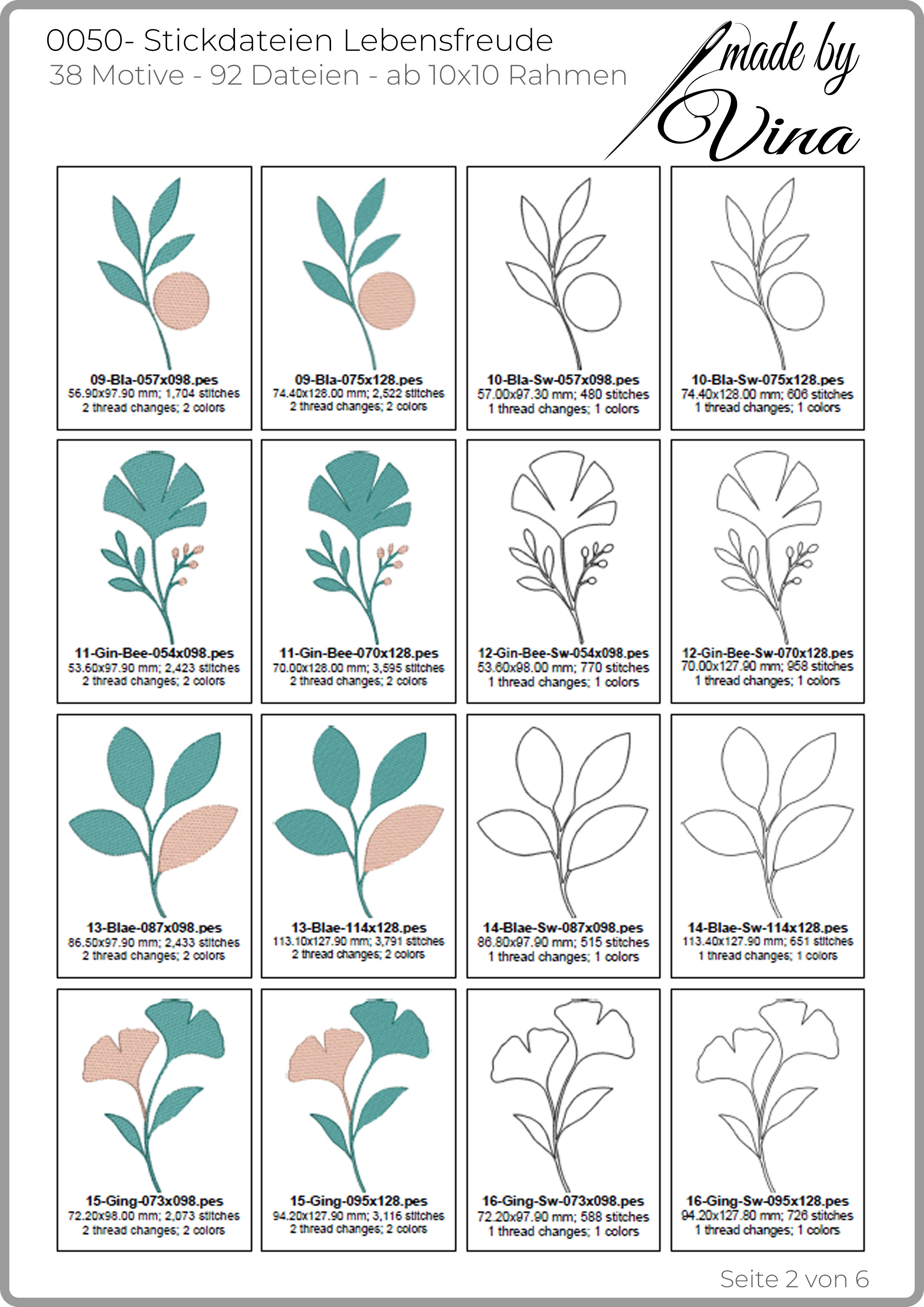 Die vollständigen Übersichten aller enthaltenen Stickdateien findest du in den Produktbildern auf mehreren Seiten.