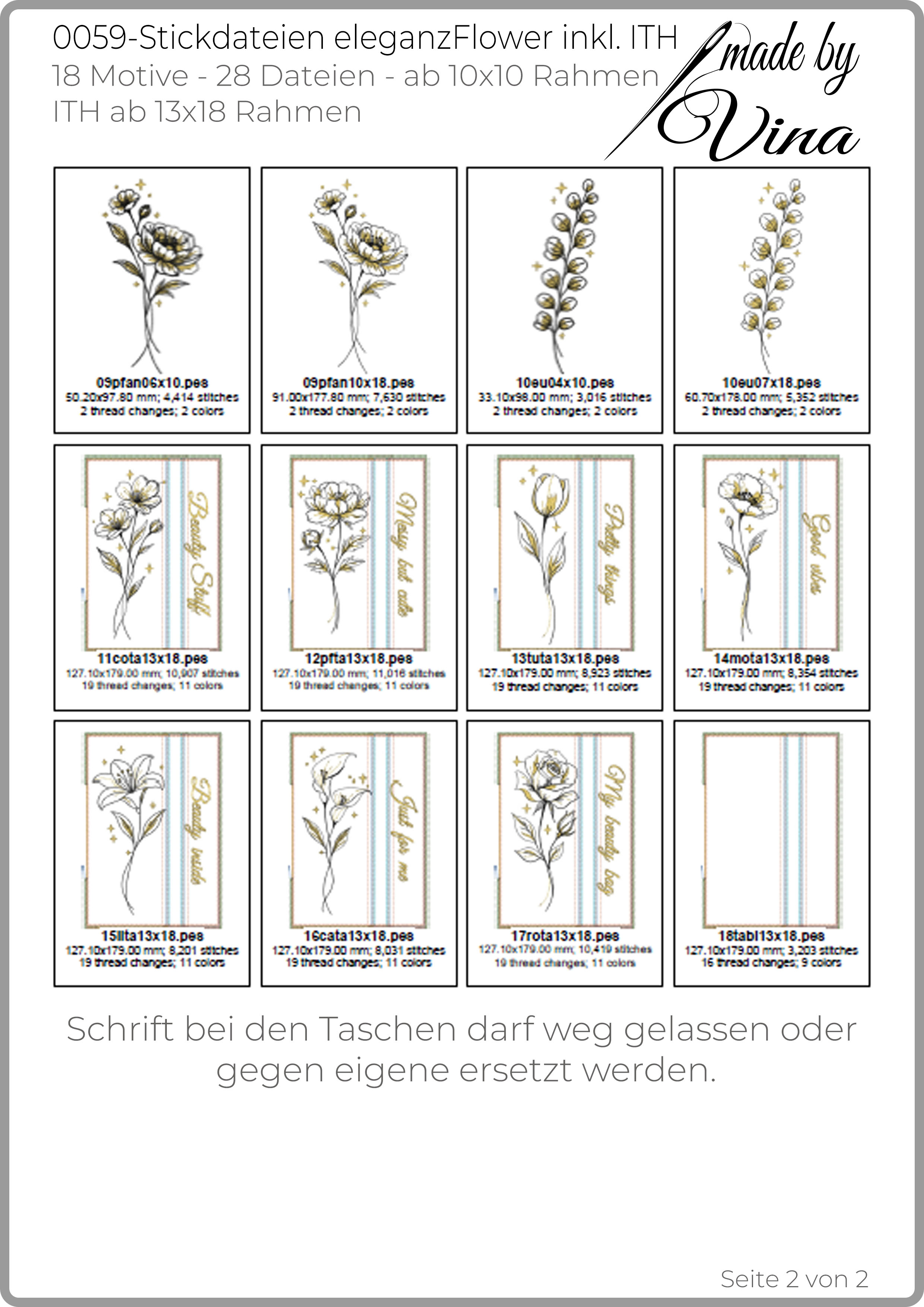 Die vollständigen Übersichten aller enthaltenen Stickdateien findest du in den Produktbildern auf mehreren Seiten.
