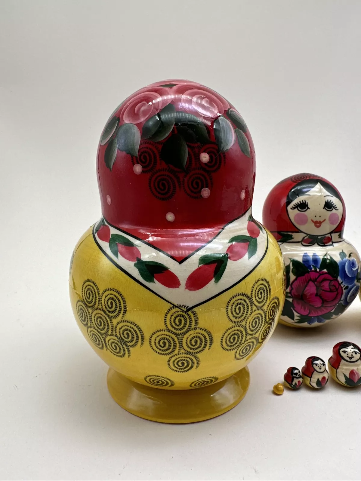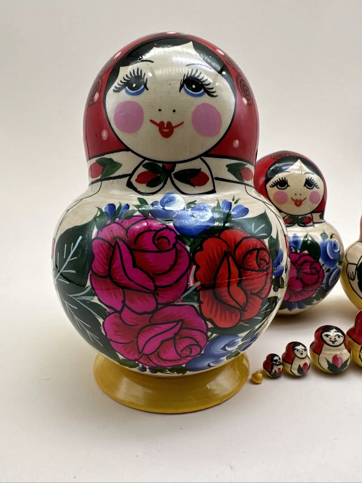 Die Püppchen können jeweils in die nächstgrößere ineinandergesteckt werden. Man bezeichnet sie auch als "Steckpuppen", "Russische Puppen" oder "Babuschkas".