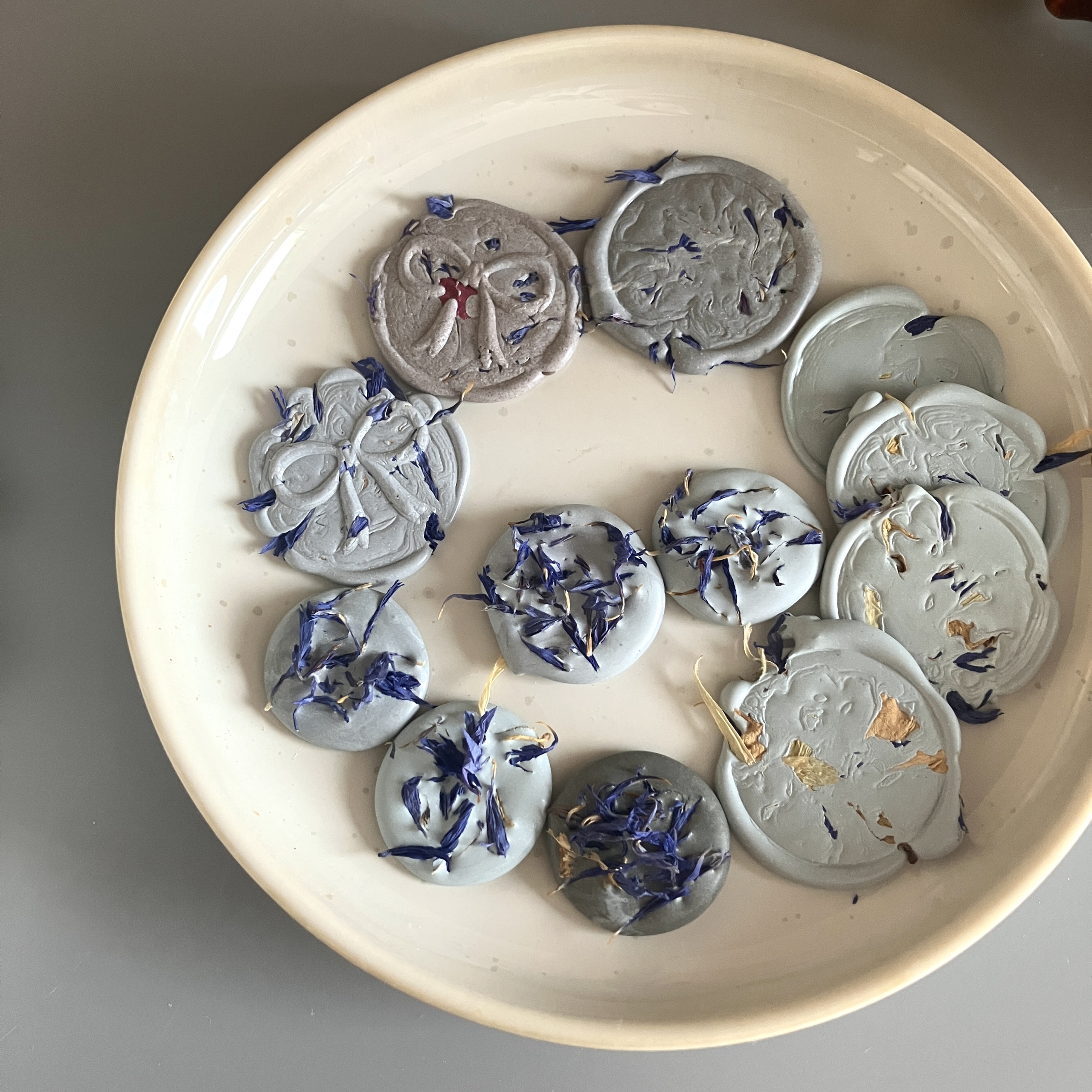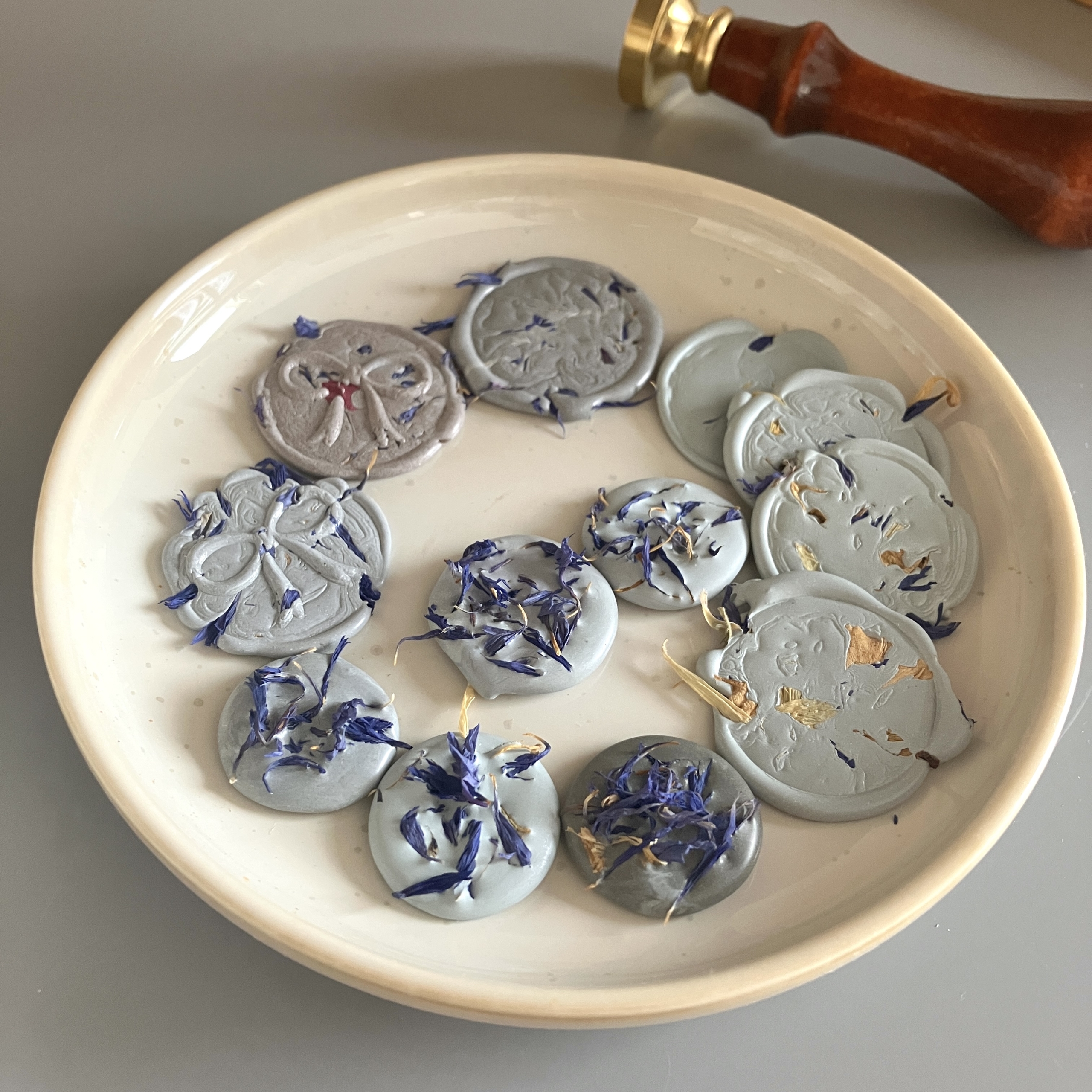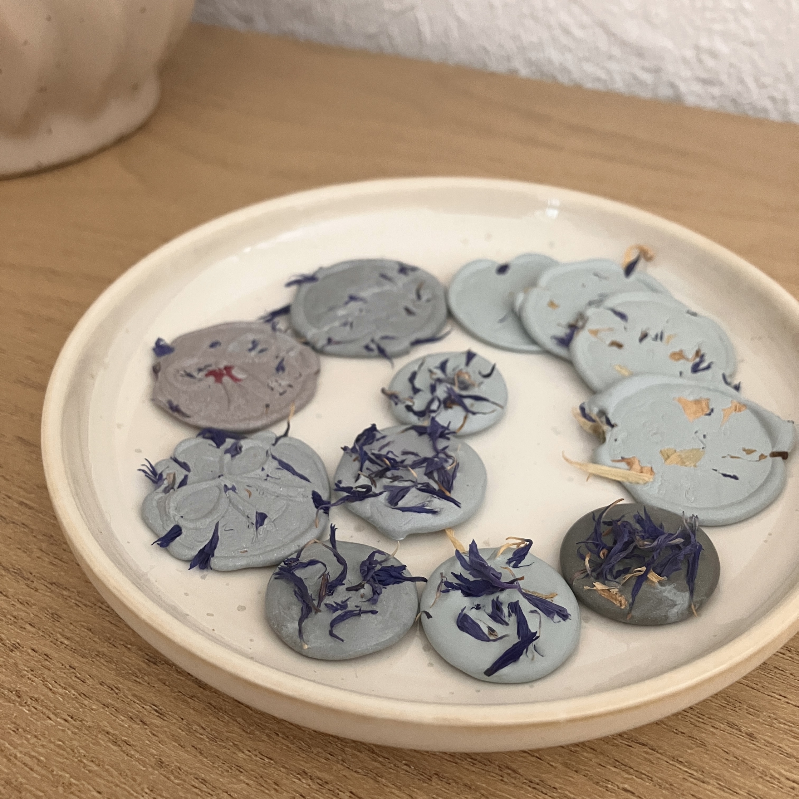 Set aus 12 Wachssiegeln mit getrockneten Blüten