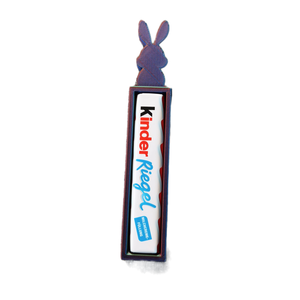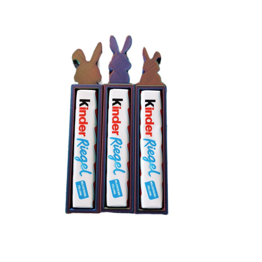 Glänzender Osterhasenhalter mit Farbverlauf in Rot/Blau/Grün, kompatibel mit Kinderschokolade und Duplo. Drei Versionen der Hase-Ohr-Form, Farbverlauf pro Exemplar variiert leicht. Bitte im Bestellprozess die gewünschte Farbe angeben.