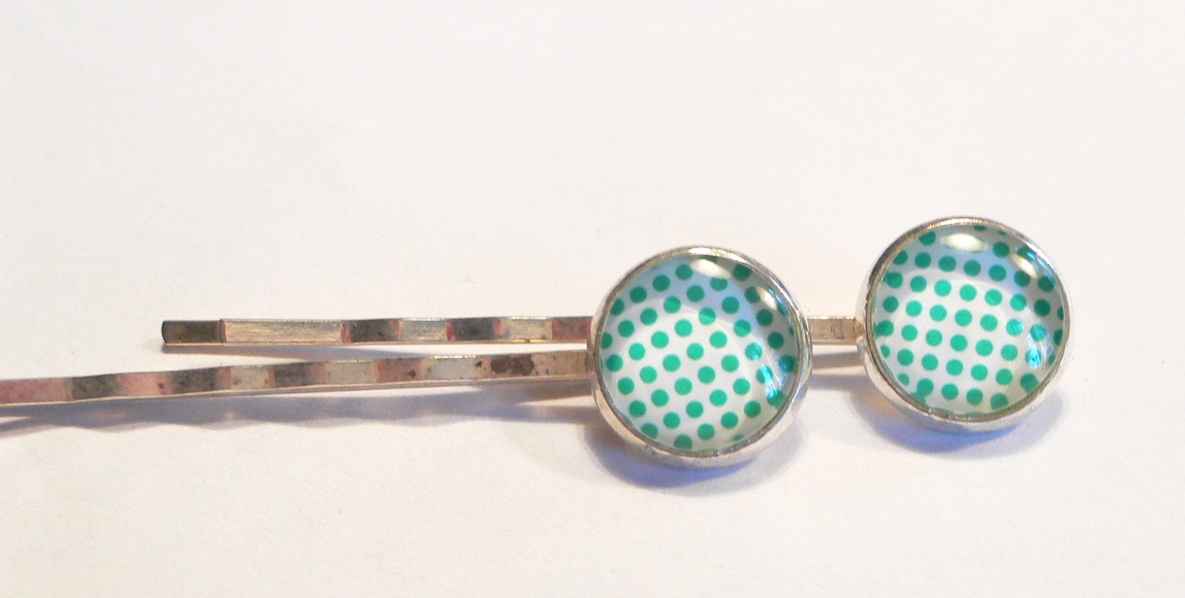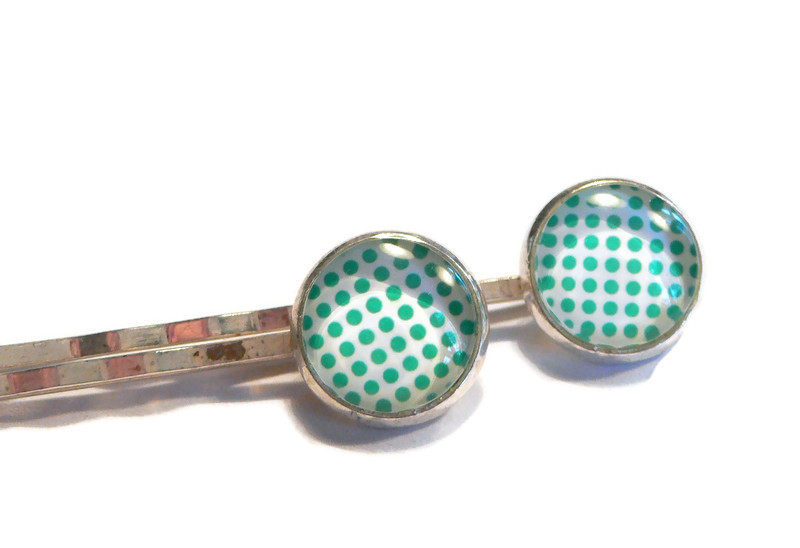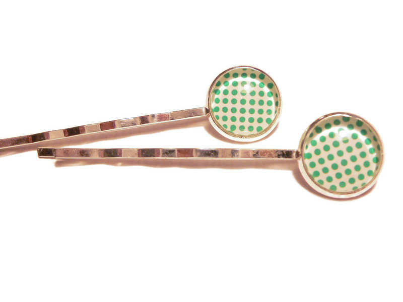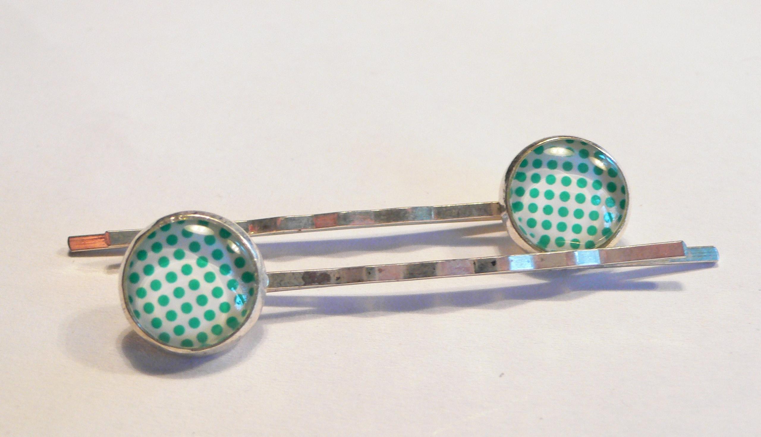 Diese beiden silberfarbenen Haarklammern sind mit Glassteinen geschmückt. Sie haben ein grünes Punktemuster auf weißem Untergrund. Die Cabochons sind 12mm groß, die Klammern sind 6cm lang.