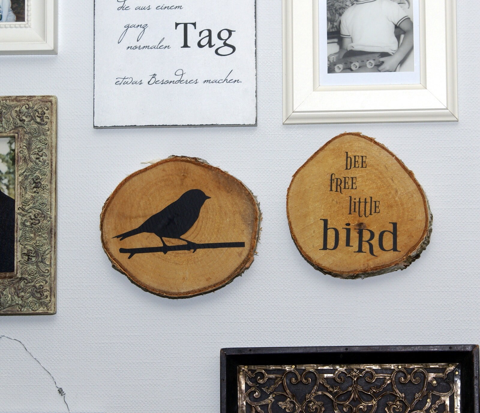 Mit Vinylfolie haben wir zwei Holzscheiben in Handarbeit mit passendem Motiv und Spruch versehen. Es sieht z.B. besonders hübsch in einer Bildergarie (siehe Foto) aus.