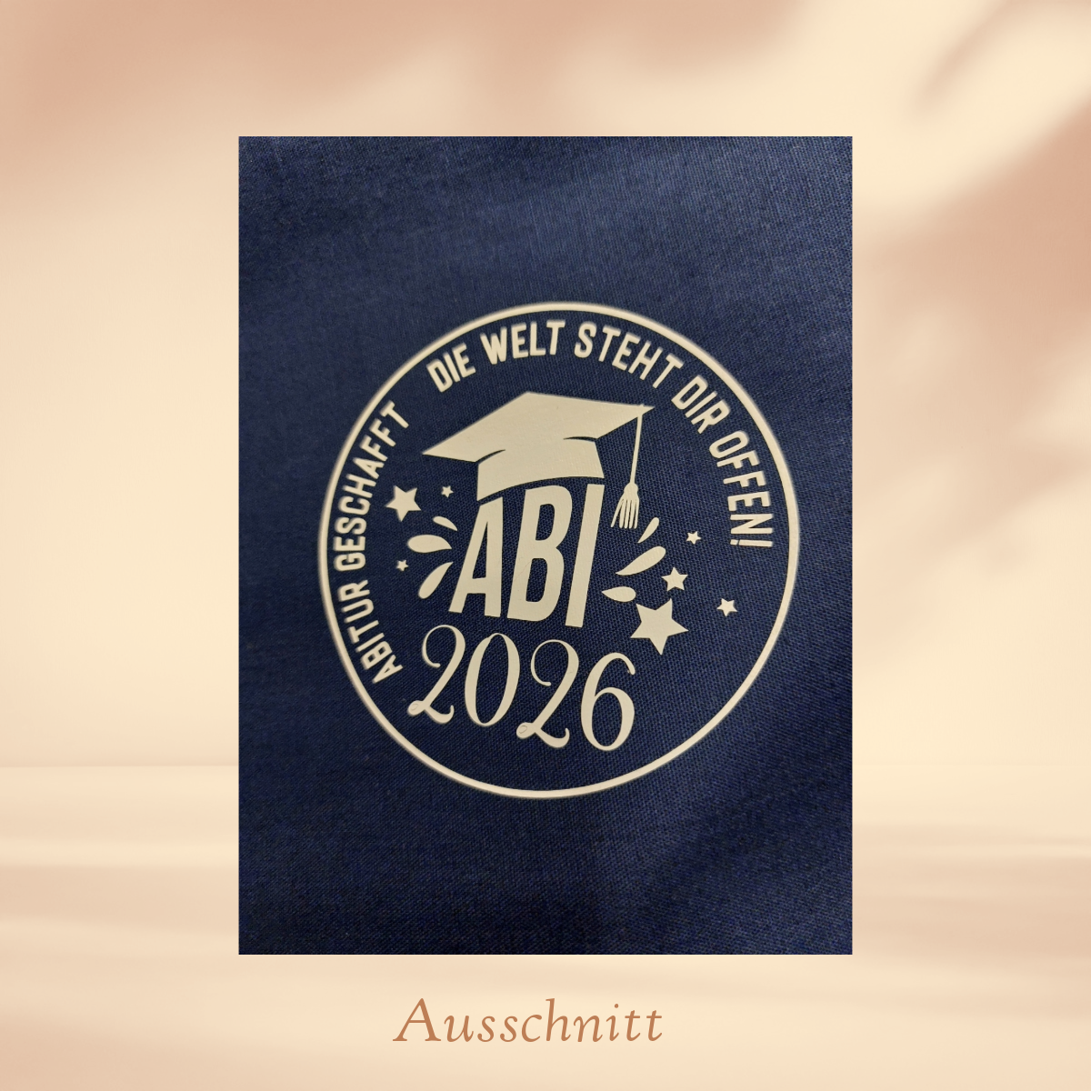 ➡ Standardmäßig wird angedruckt:„ABI“, der Professorenhut und die aktuelle Jahreszahl, mit Spruch "Abitur geschafft - Die Welt steht dir offen!"