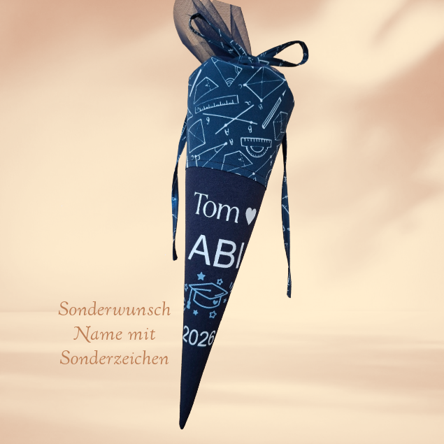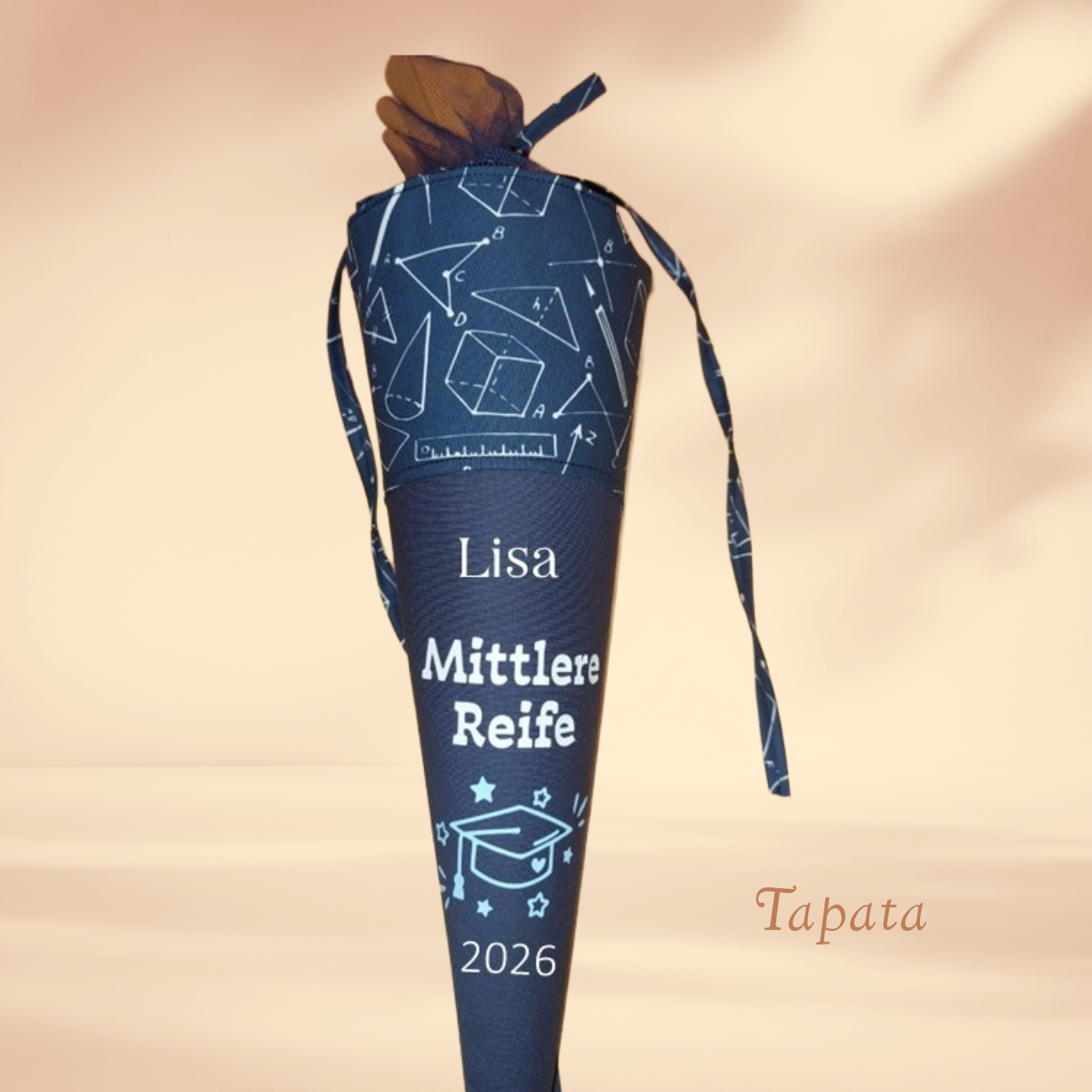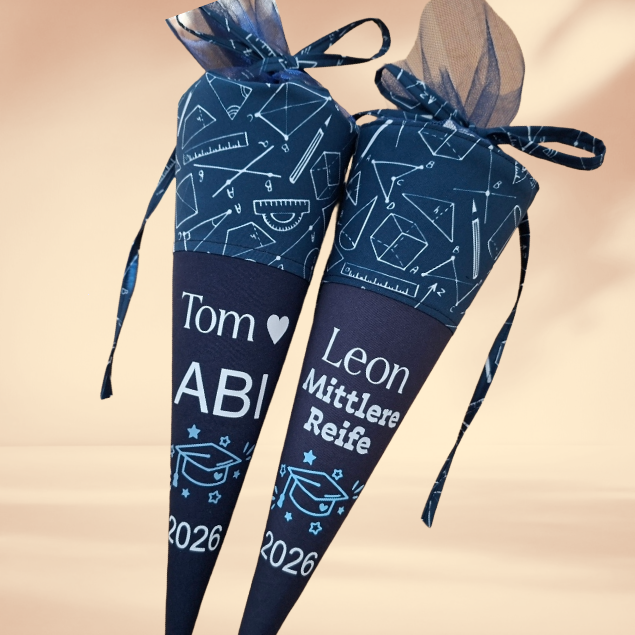Angeboten wird eine Schultüte mit einem passenden Spruch zum Abitur oder zur Mittleren Reife. Jahreszahl wird entsprechend angepasst. Erhältlich ist die Schultüte als kleine Schultüte als Mitbringsel zum Abschlussfest