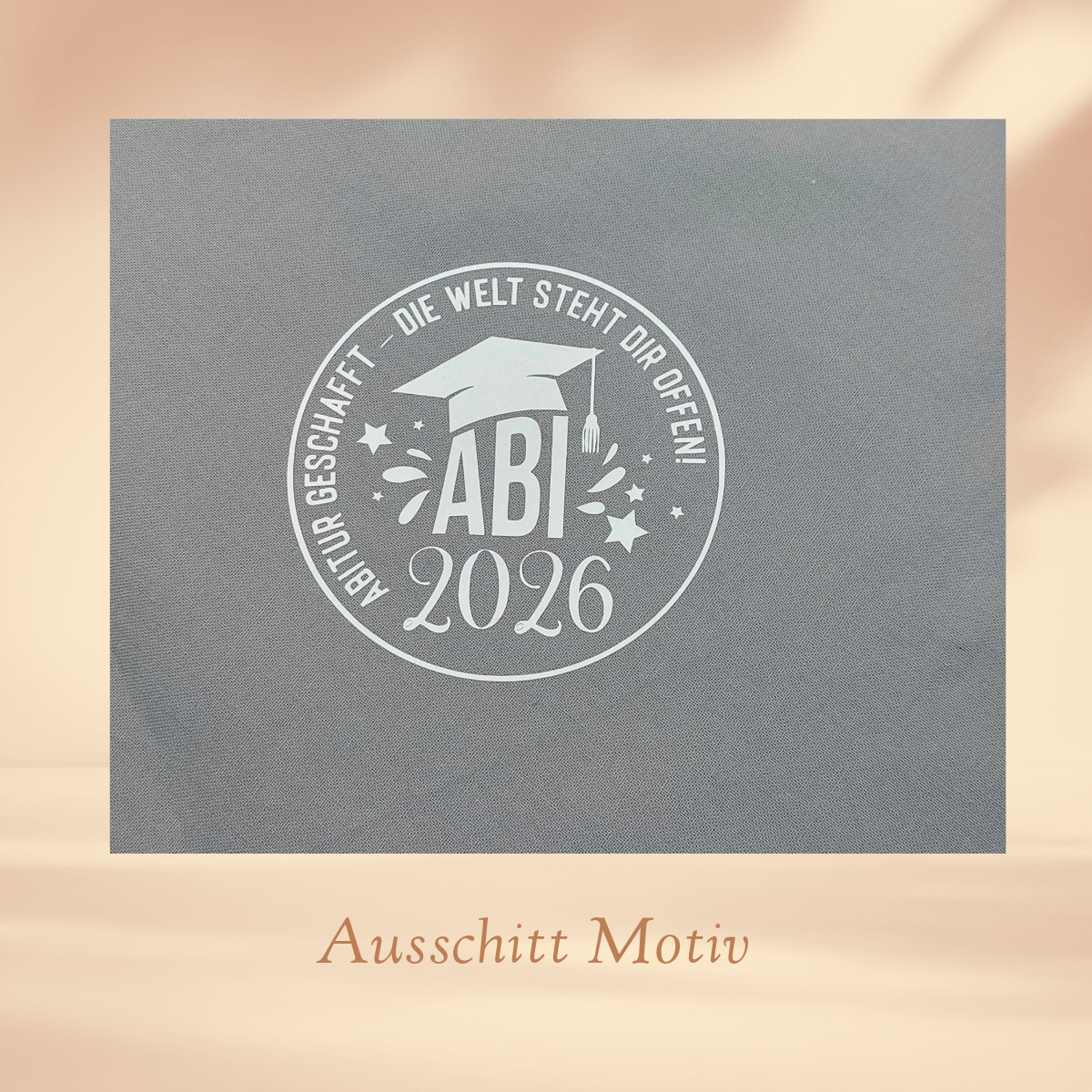Bitte geben Sie in das Feld Personalisierungswünsche den Namen des Absolventen ein. Max. 10 Zeichen (Sonderzeichen/Emojis nur nach Rücksprache). Je nach Länge wird die Schriftgröße entsprechend angepasst. (Fehlt das Personalisierungsfeld, dann bitte im Freitextfeld der Bestellabwicklung den Wunschnamen vermerken.)