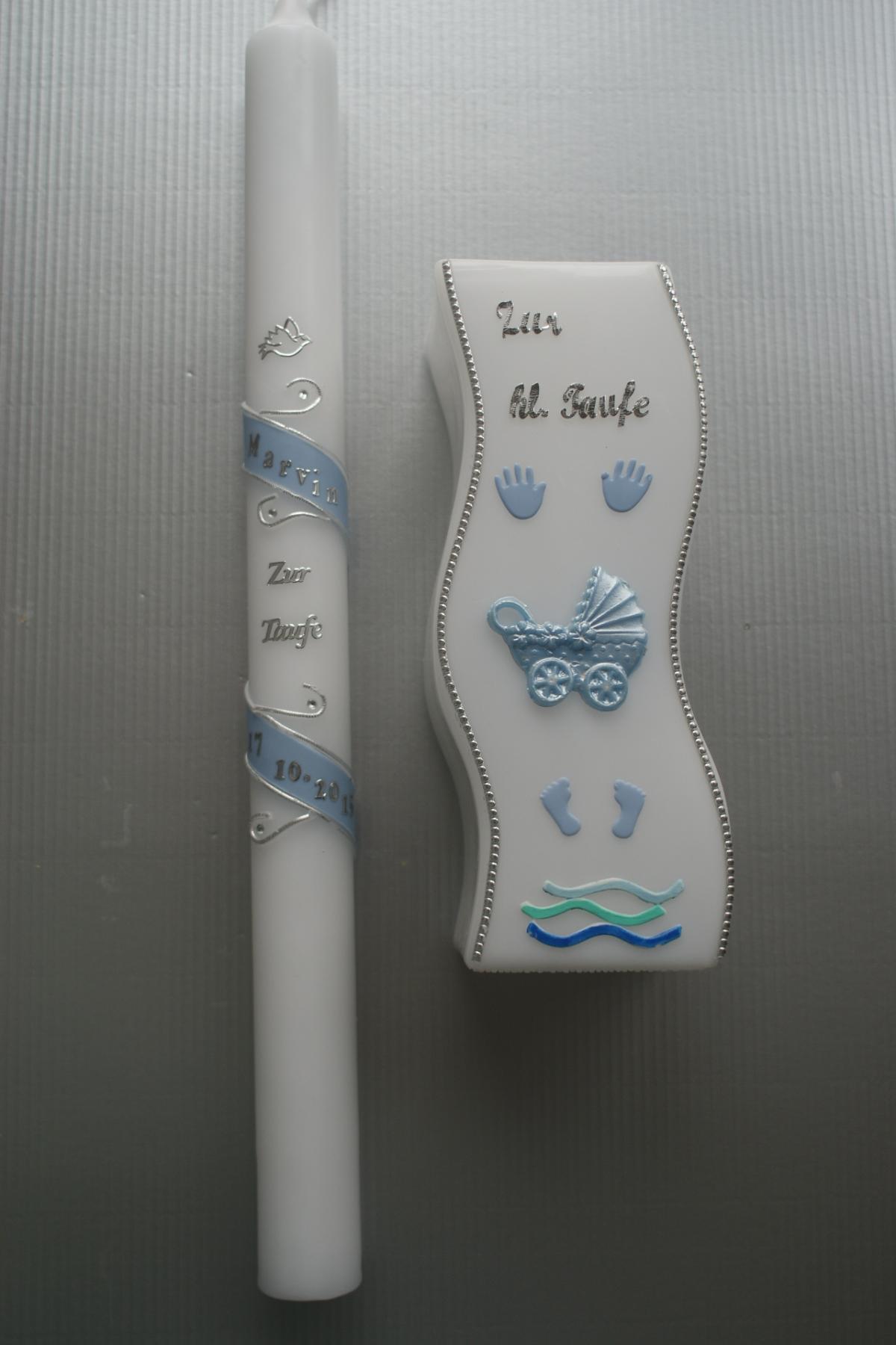 Die Taufkerze ist mit dem Namen und dem Taufdatum verziert, die Lebenskerze mit Namen und Geburtsdatum.