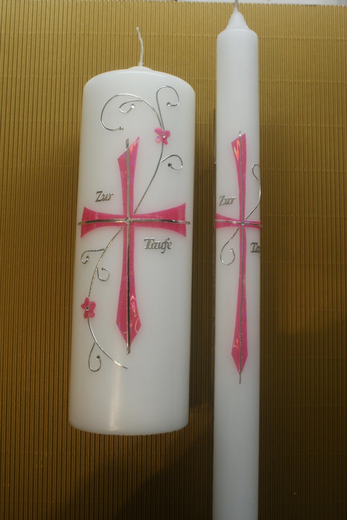 Die Taufkerze ist mit dem Namen und dem Taufdatum verziert, die Lebenskerze mit Namen und Geburtsdatum.