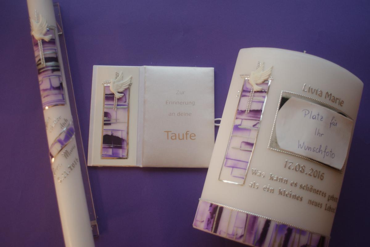 Die Taufkerze ist mit dem Namen und dem Taufdatum verziert, die Lebenskerze mit Namen und Geburtsdatum. Der Taufbrief wird von uns im gleichen Design, aber ohne Namen und Datum hergestellt. Dieses wird dann persönlich vom Paten innen ausgefüllt, auch ein Briefchen für Geldgeschenke liegt bei.