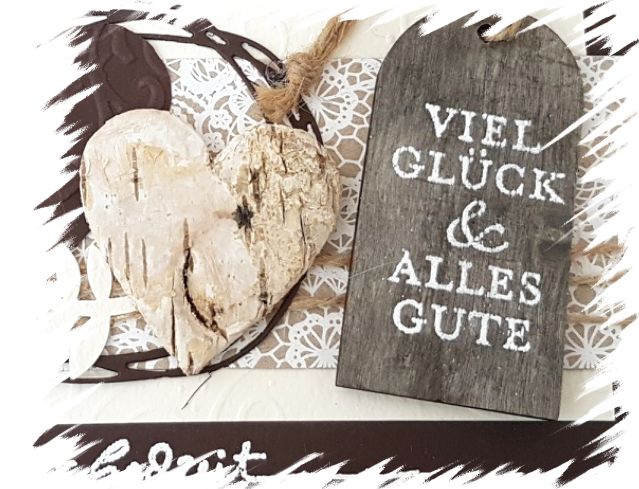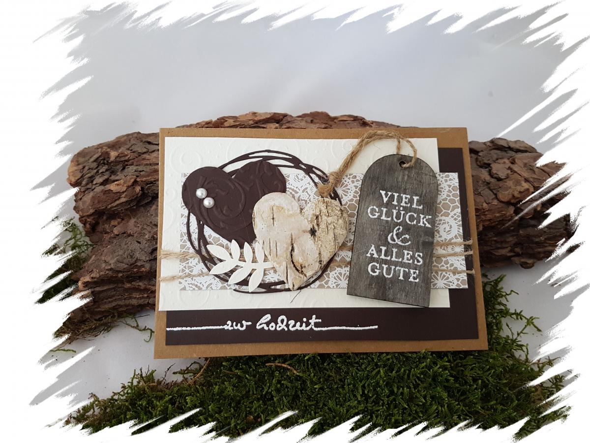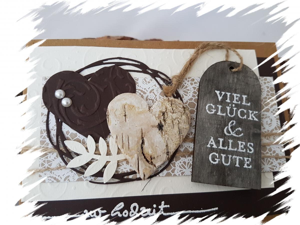 ♥ Glückwunschkarte auf der ich "zur Hochzeit" auf die Karte und "Viel Glück & Alles Gute" aif einen Holztag gestempelt und embosst habe. Verziert habe ich sie mit einem Papier- und Birkenherz, Perlen, einer Kordel und passendem Motiv- und Fotokarton. Den Hintergrund habe ich per Hand gemalt.