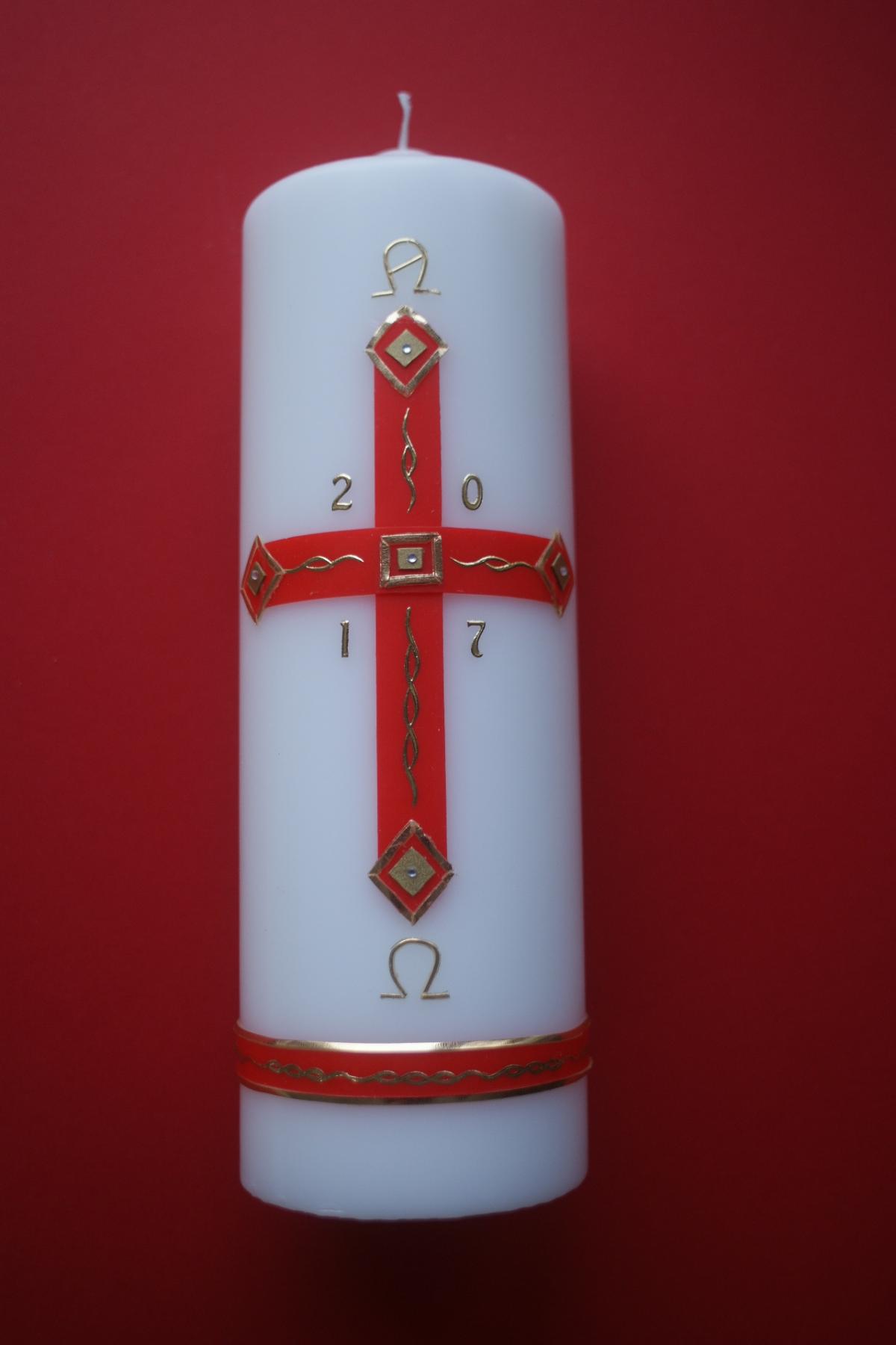 Große Osterkerze für Laternen, Kapellen oder einfach nur für den Ostertisch. Selbstverständlich immer mit dem aktuellen Jahresdatum.