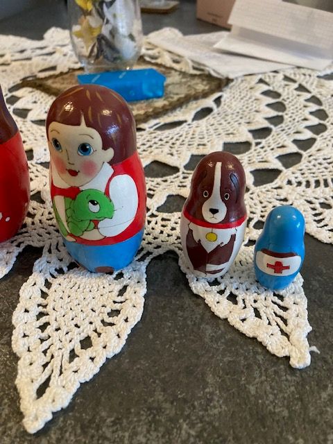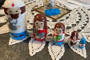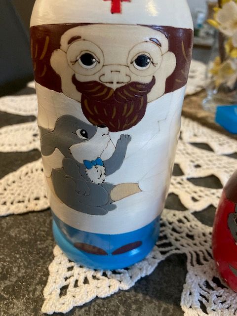 Diese Matroschka Design "Doktor Doolittle", besteht aus 5 Einzelpüppchen, die ineinandergesetzt werden können, ist handgearbeitet und handbemalt. Sie hat ihren Ursprung in Osteuropa und ist ein Unikat.