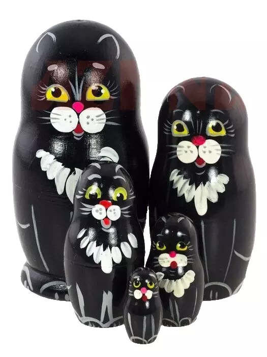 Diese Tier-Matroschka "schwarzer Kater", besteht aus 5 Einzelpüppchen, die ineinandergesetzt werden können, ist handgearbeitet und handbemalt. Unikat. Sie hat ihren Ursprung in Osteuropa.