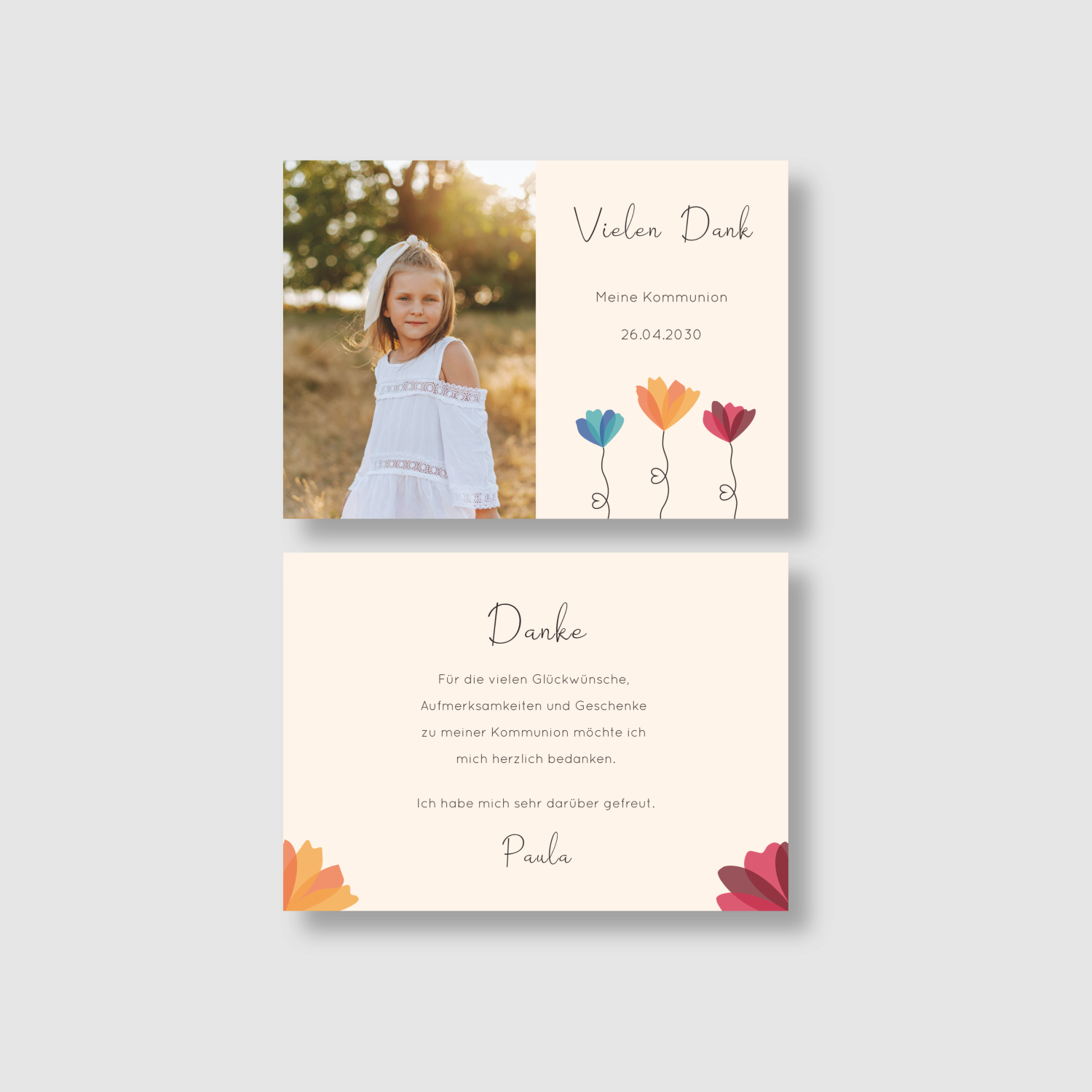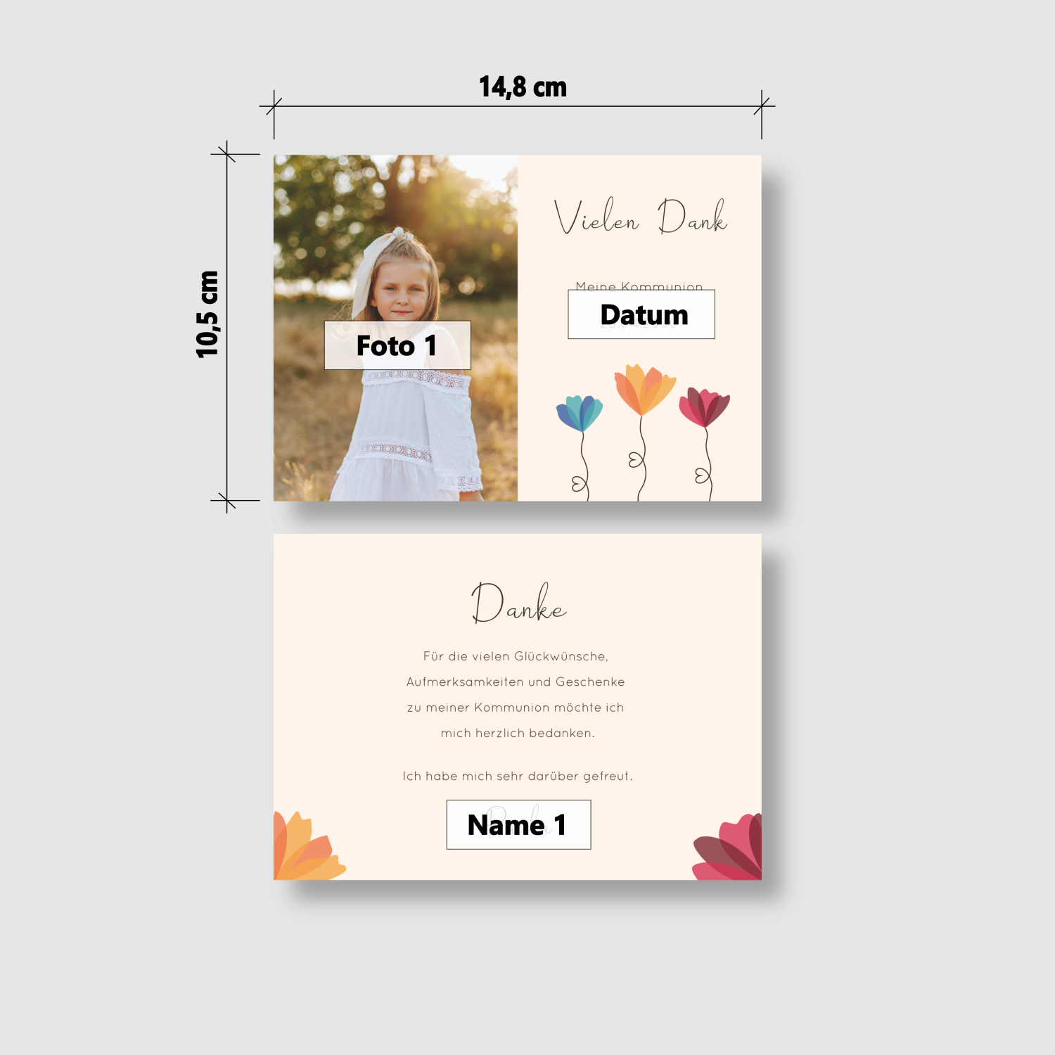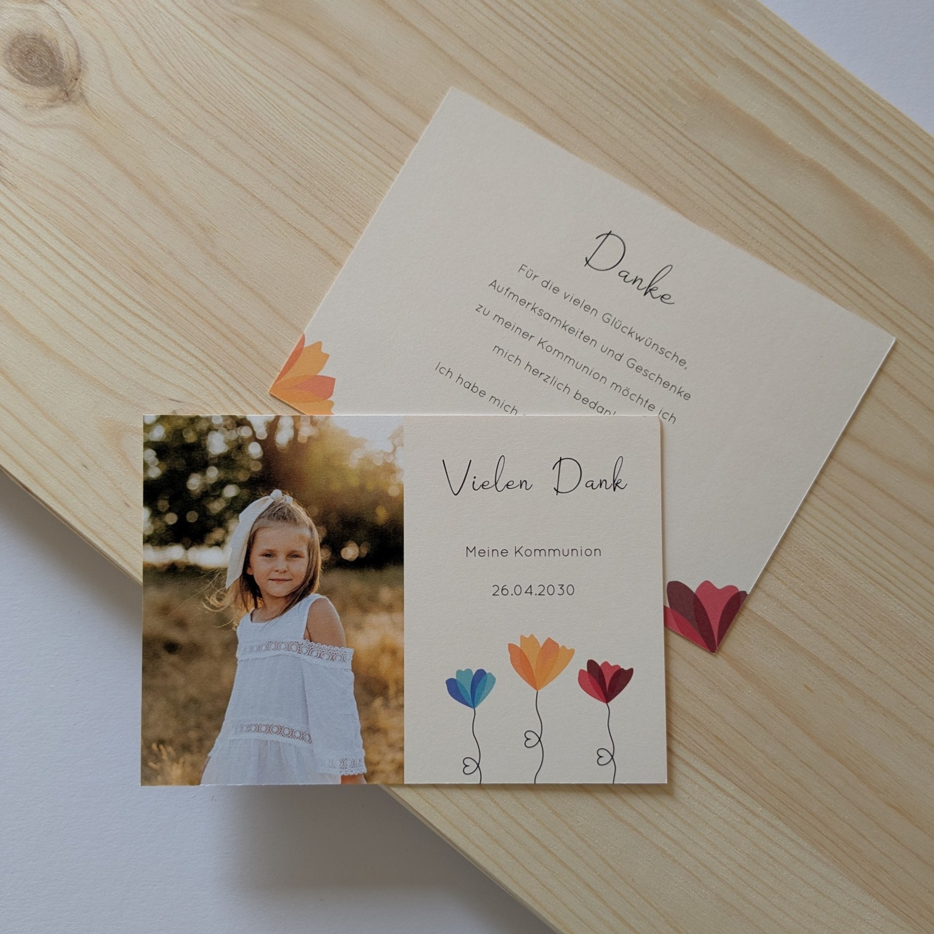 Bedanke dich auf besondere Weise bei Familie, Freunden und Bekannten mit dieser wunderschönen Dankeskarte zur Kommunion/Konfirmation. Ein liebevoller Gruß, der von Herzen kommt und lange in Erinnerung bleibt.