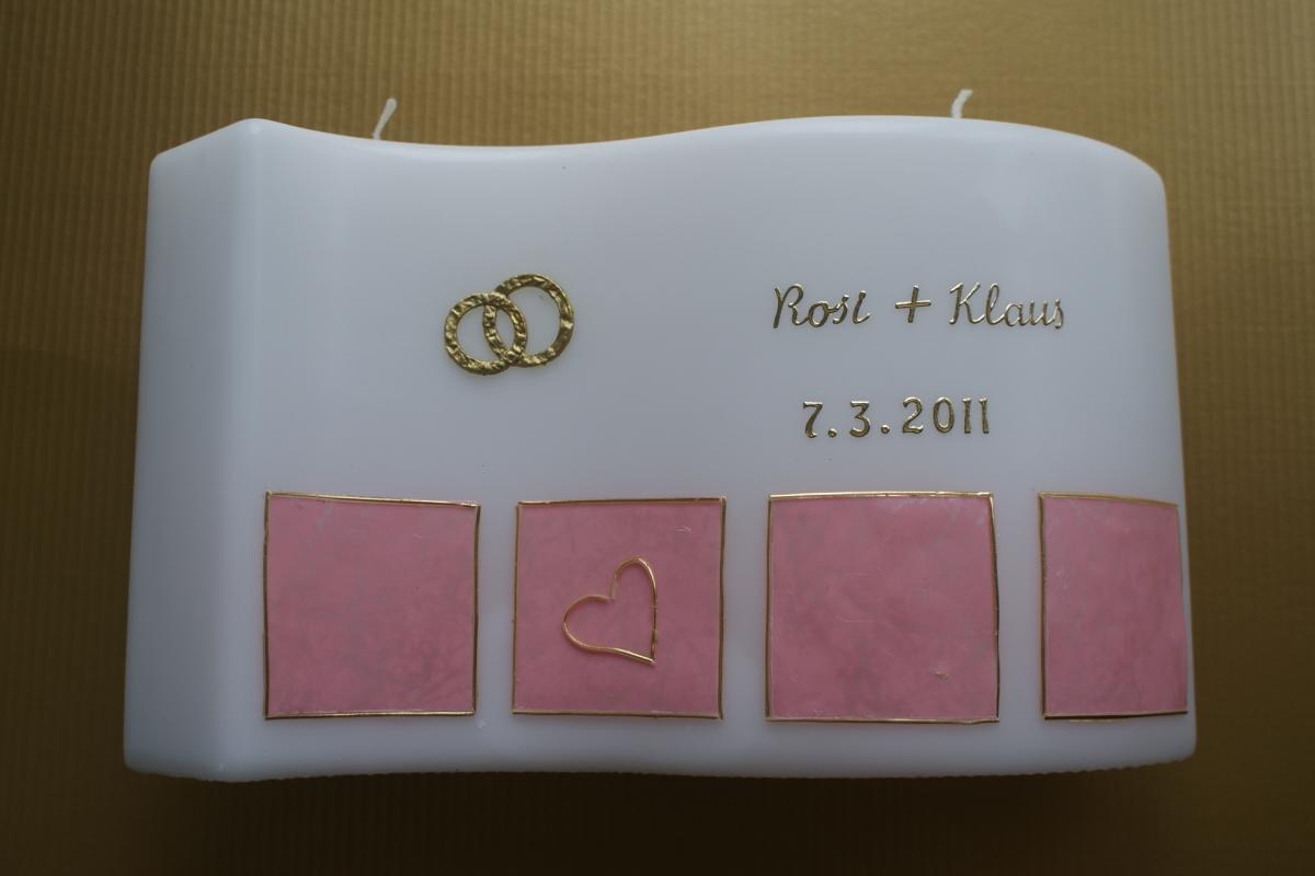 Gerne stellen wir für Sie diese Kerze mit Ihren persönlichen Daten wie Namen und Hochzeitsdatum her. Sie ist auch in Ihren Wunschfarben erhältlich, bitte geben Sie bei einer Bestellung diese Wünsche bekannt.
