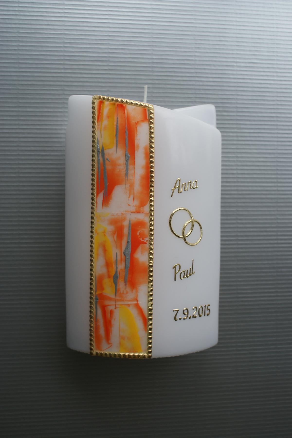 Gerne stellen wir für Sie diese Kerze mit Ihren persönlichen Daten wie Namen und Hochzeitsdatum her. Sie ist auch in Ihren Wunschfarben erhältlich, bitte geben Sie bei einer Bestellung diese Wünsche bekannt.