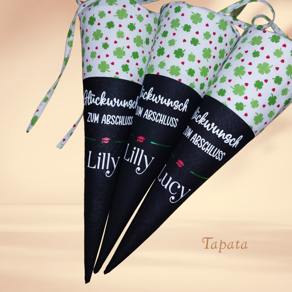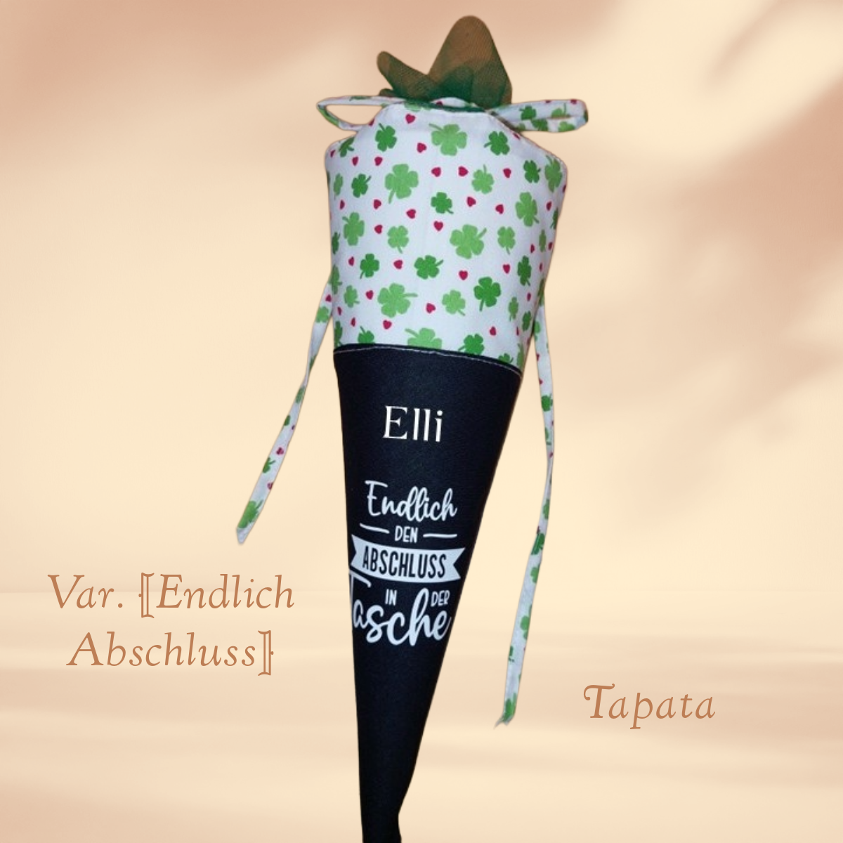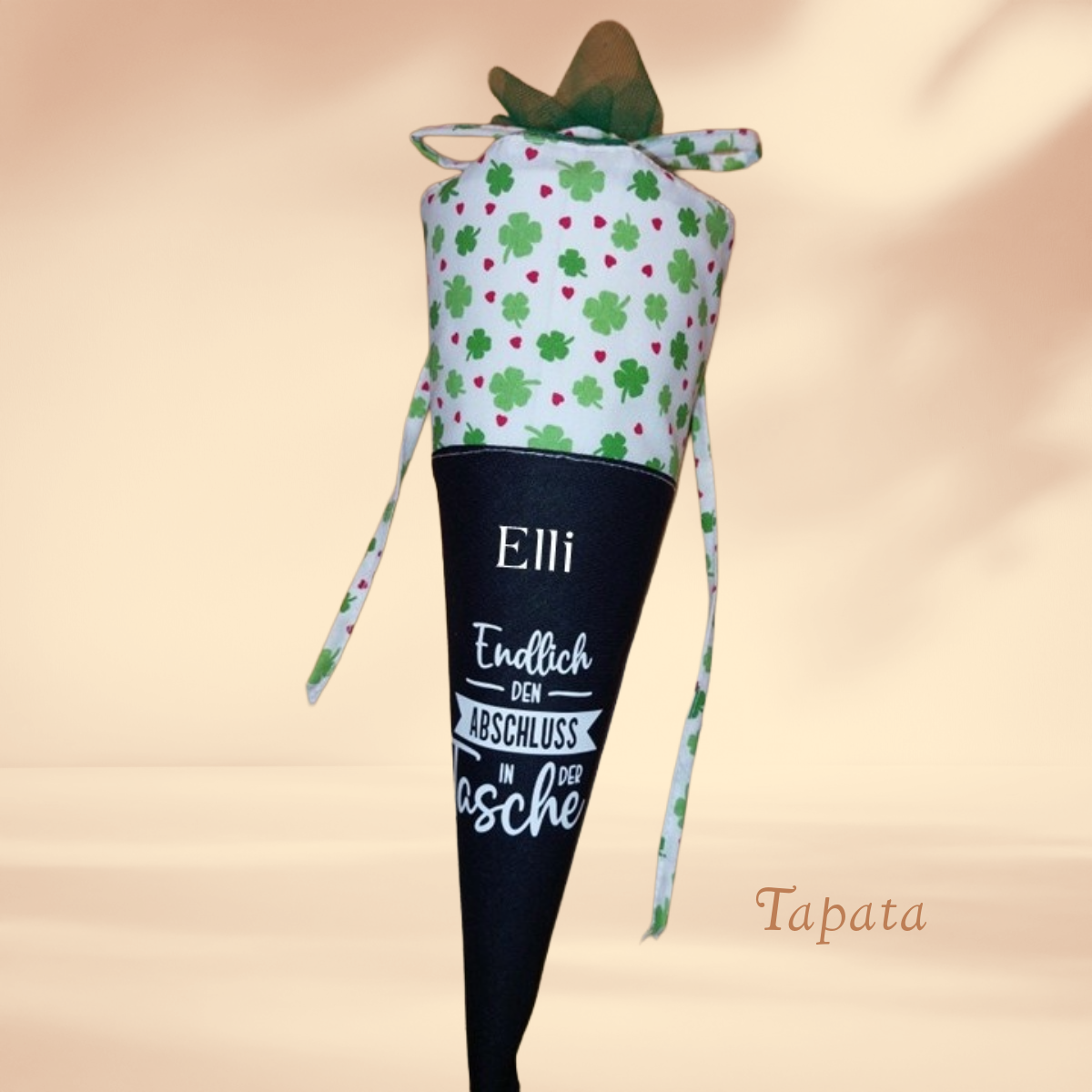 ➡ Namenswunsch: Auf Wunsch kann die Abschlusstüte mit dem Namen des Absolventen versehen werden. Bitte geben Sie in das Feld Personalisierungswünsche den Namen ein. Max. 20 Zeichen (Sonderzeichen nur nach Rücksprache). Je nach Länge wird die Positionierung des Namens und die Größe angepasst.