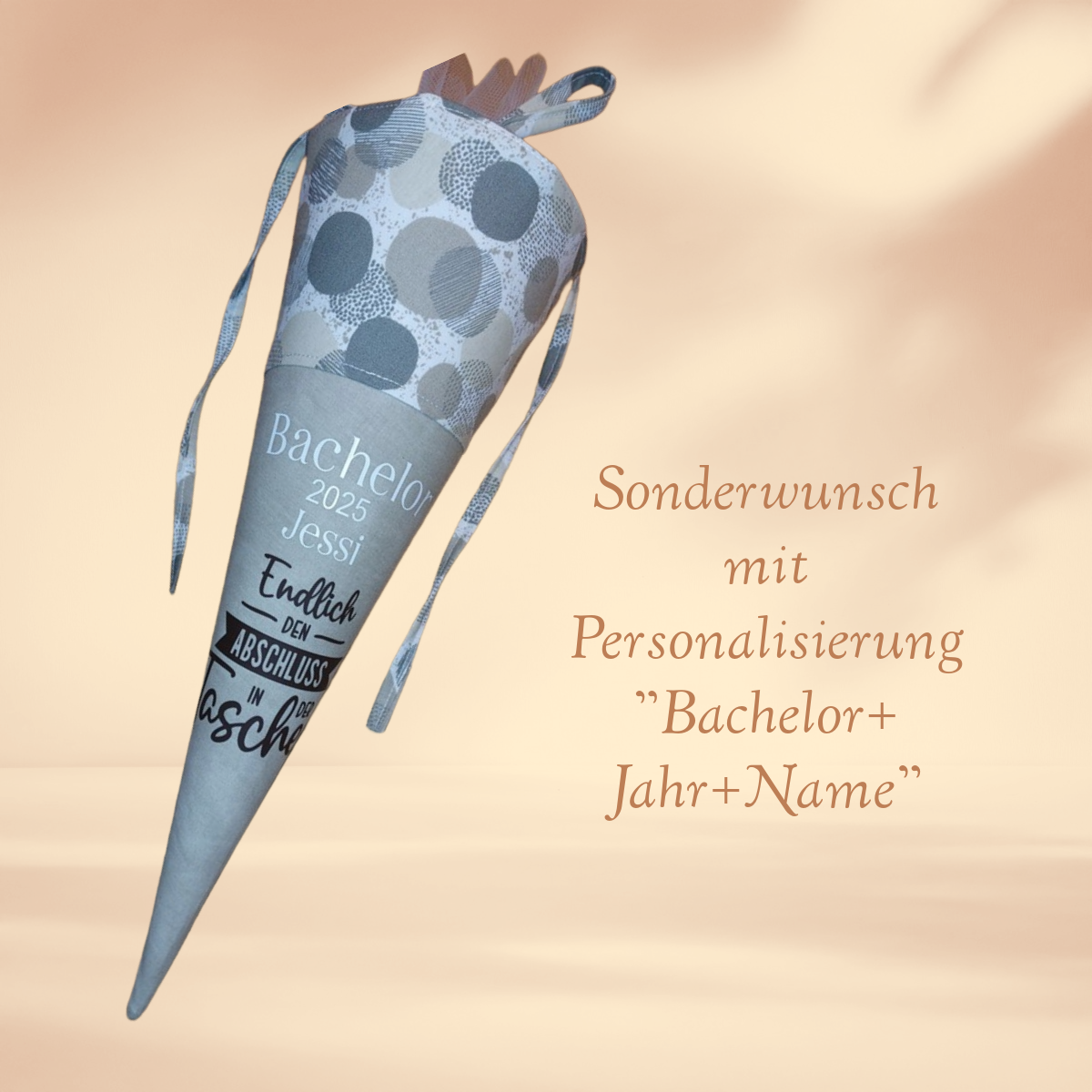 ➡ Namenswunsch: Auf Wunsch kann die Schultüte mit dem Namen oder den Titel (z.B. Dipl., Master oder Bachelor) des Absolventen versehen werden. Bitte geben Sie in das Feld Personalisierungswünsche den Wunschtext ein. Max. 20 Zeichen. Je nach Länge wird die Schriftgröße angepasst.