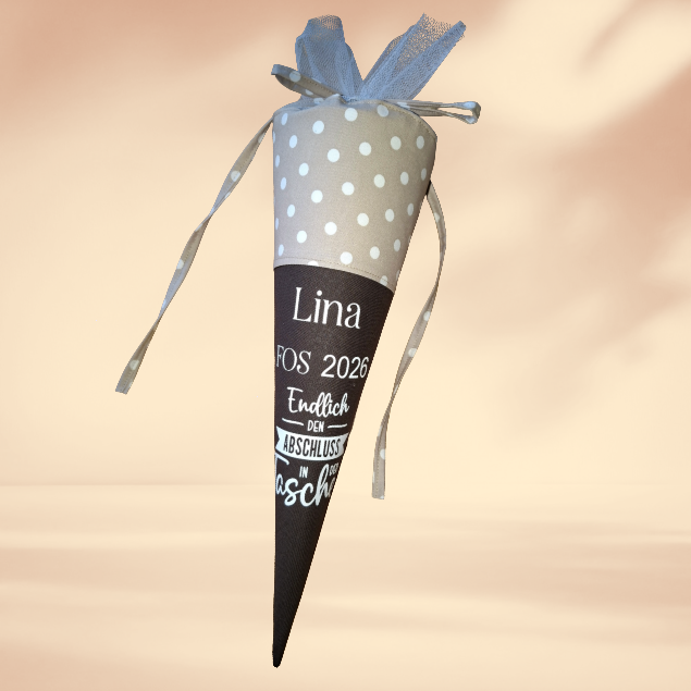 ➡ Namenswunsch: Auf Wunsch kann die Schultüte mit dem Namen oder den Titel (z.B. Dipl., Master oder Bachelor) des Absolventen versehen werden. Bitte geben Sie in das Feld Personalisierungswünsche den Wunschtext ein. Max. 20 Zeichen. Je nach Länge wird die Schriftgröße angepasst.