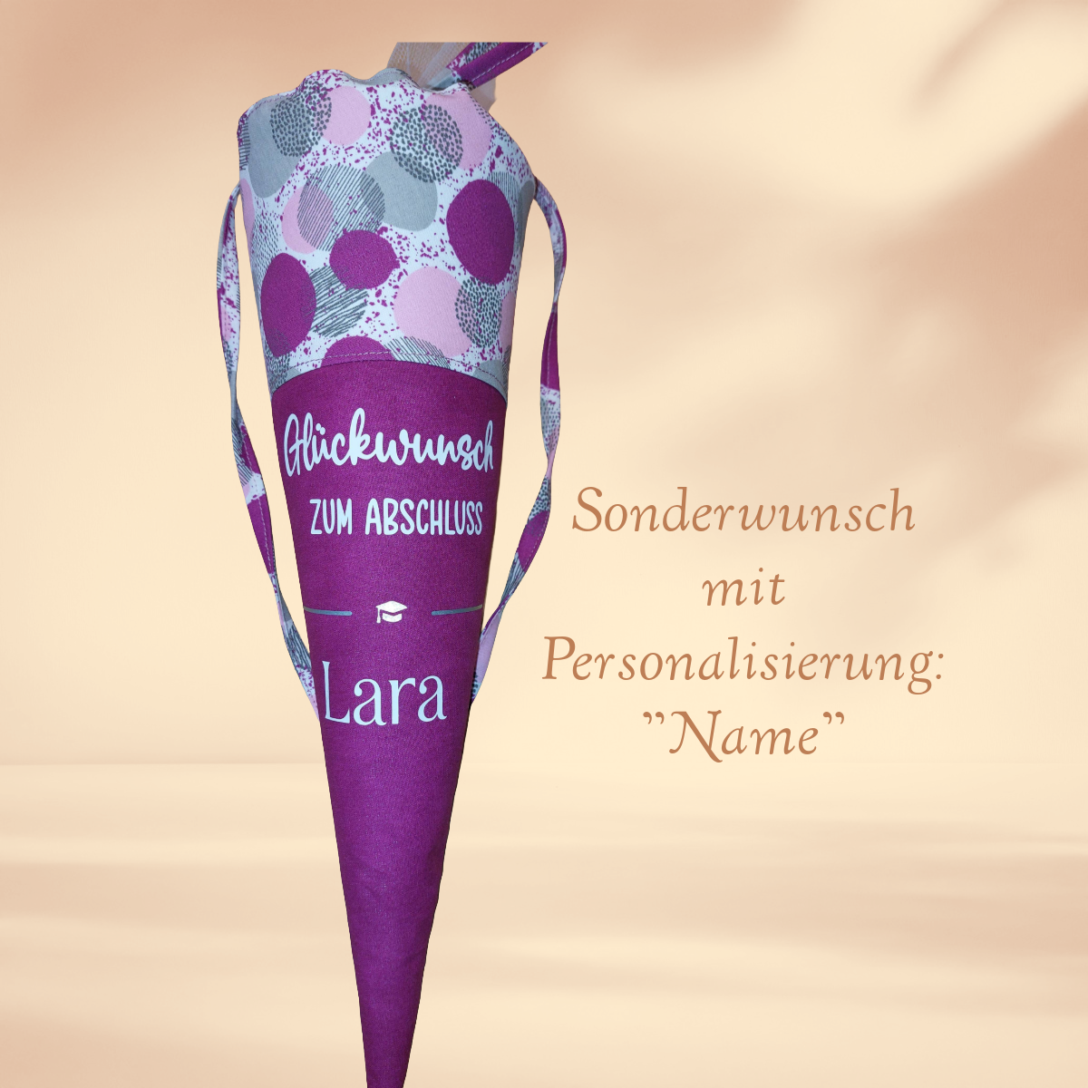 ➡ Namenswunsch: Auf Wunsch kann die Abschlusstüte mit dem Namen des Absolventen versehen werden. Bitte geben Sie in das Feld Personalisierungswünsche den Namen ein. Max. 12 Zeichen. Je nach Länge wird die Positionierung des Namens und die Größe angepasst.