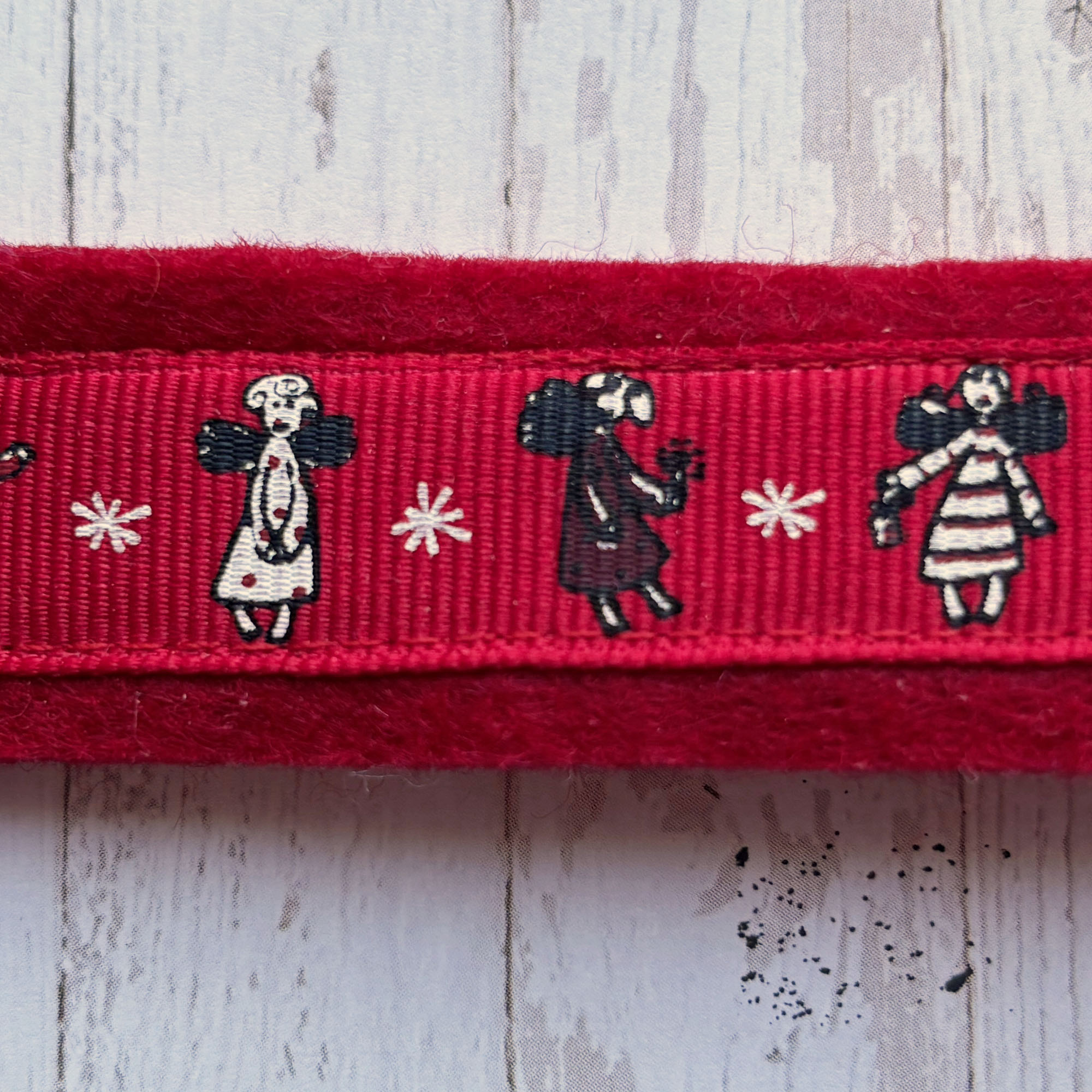 Süße Schlüsselbänder mit Engeln auf rotem Ripsband bzw Geschenken auf beigefarbenem Polyestersatin.