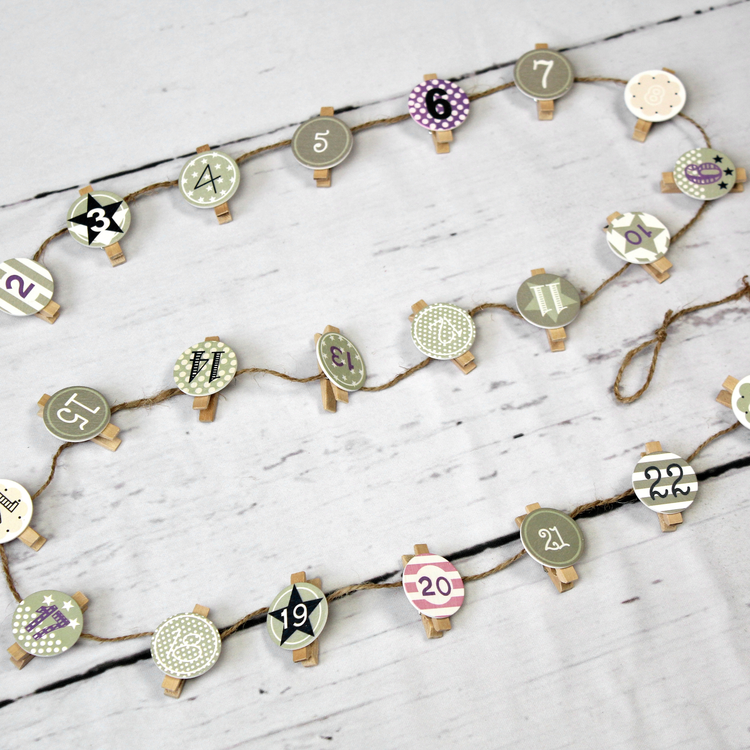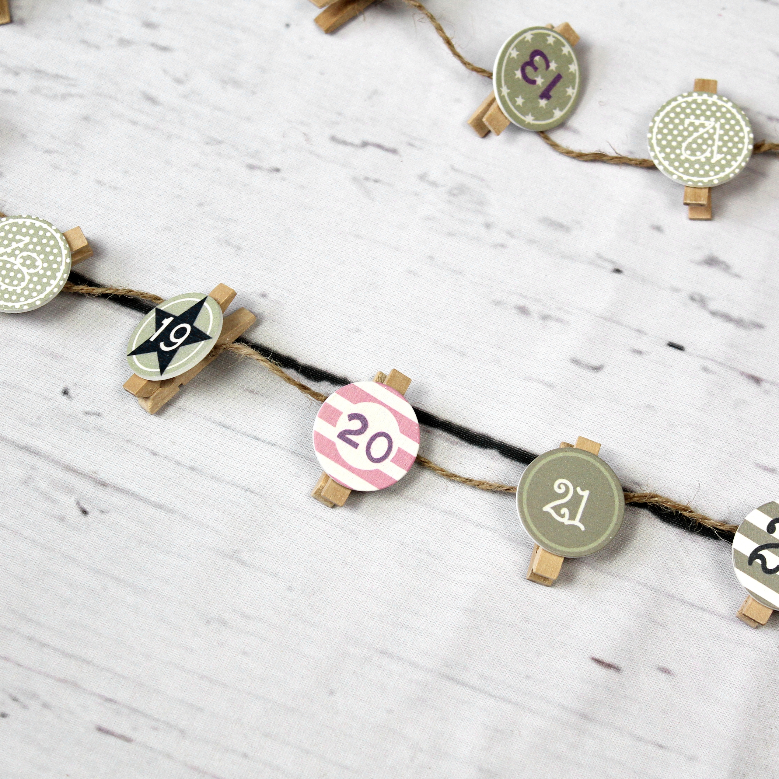 Die Aufhängung besteht aus einer ca. 170cm langen Kordel, an der 24 charmante Holzklammern befestigt sind. Jede Holzklammer ist mit einer Zahl auf einer hübschen Holzscheibe bedruckt, um die Tage bis Weihnachten zu zählen.