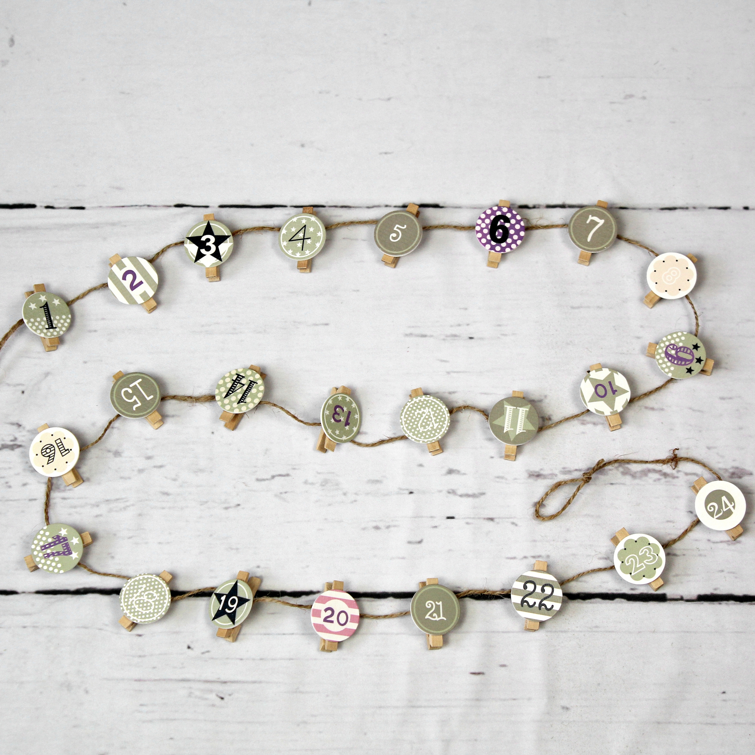 - Adventskalenderaufhängung aus Holzscheiben und Holzklammern; Gesamtlänge: ca. 170cm