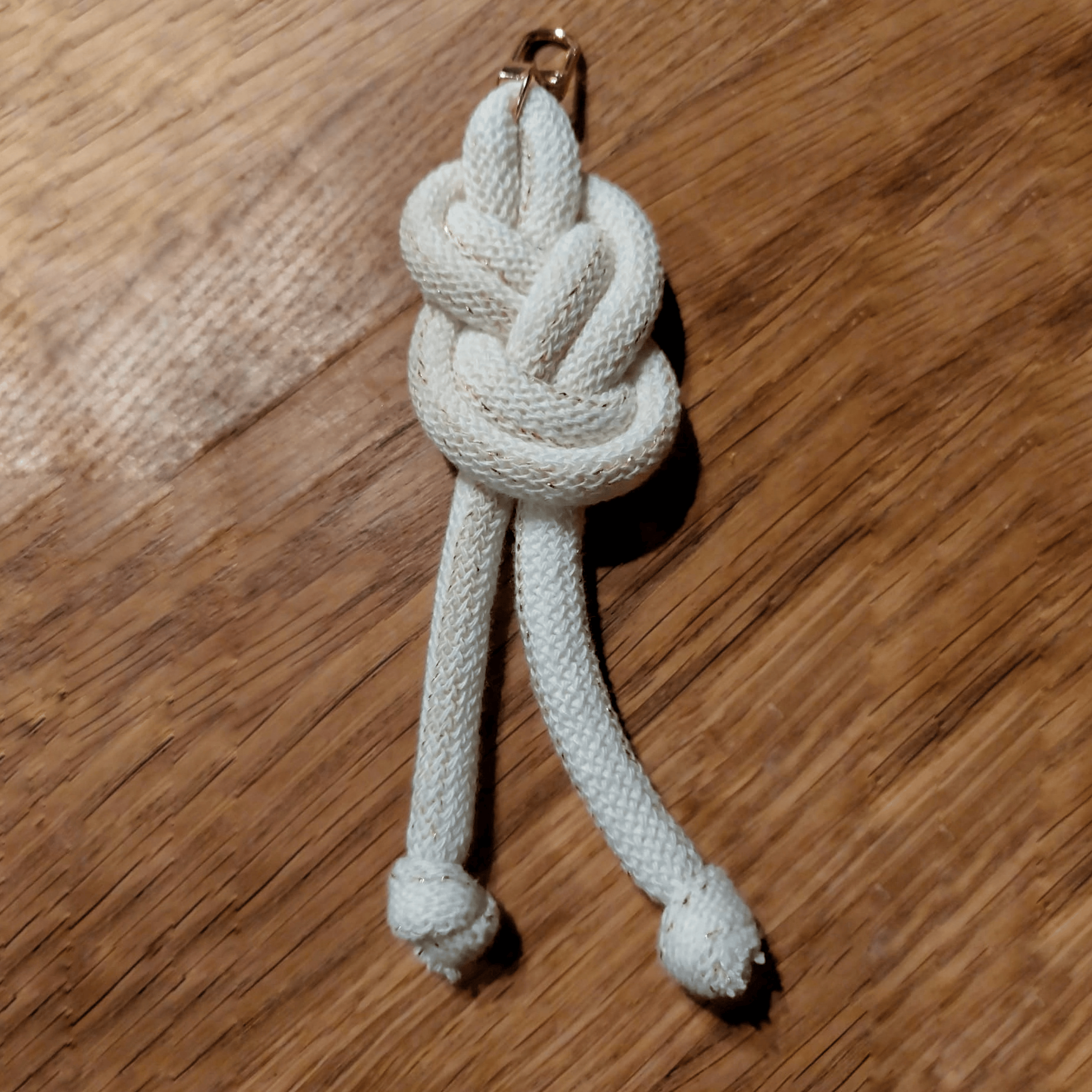 Geknoteter Anhhänger für Taschen oder als Schlüsselanhänger mit goldener Hängeschnalle.