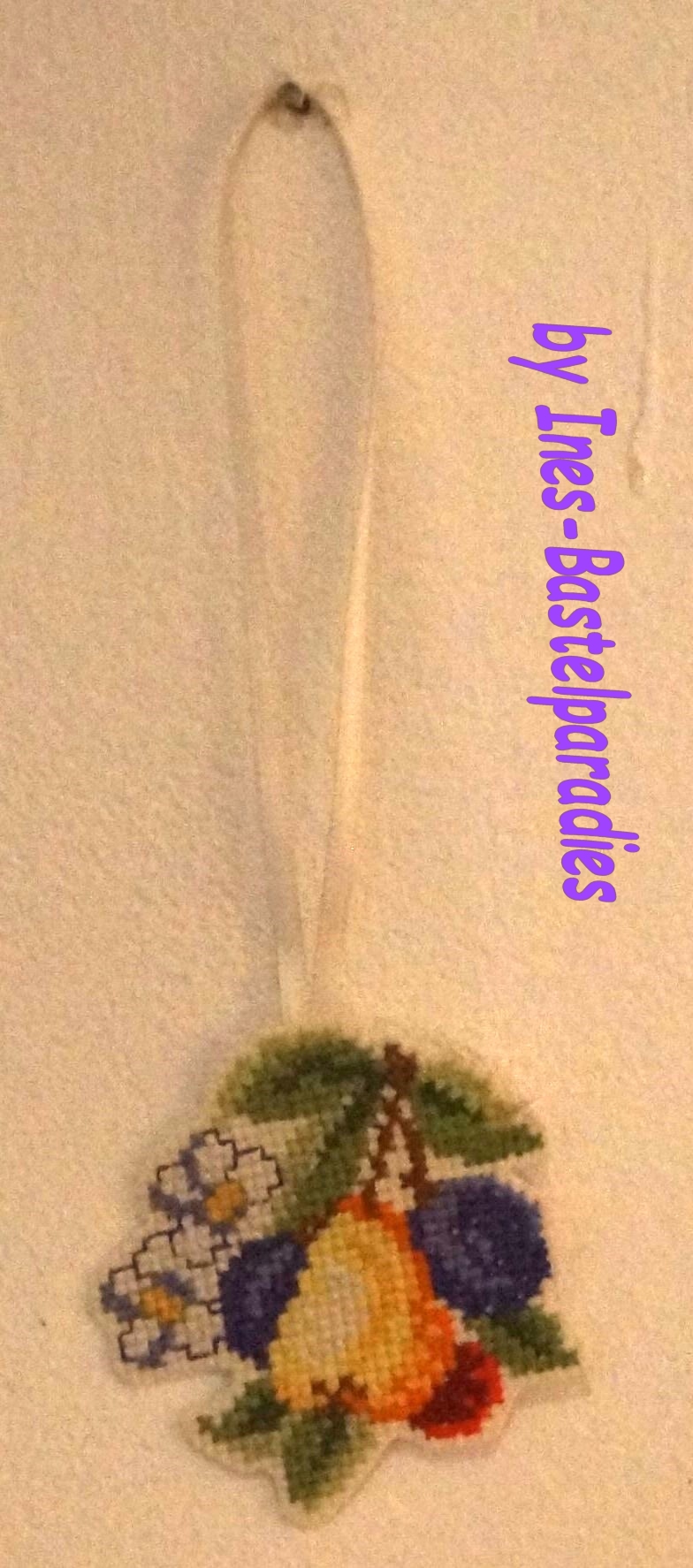 der Rückseite wurde Bügelflies gebügelt und damit man das Obst aufhängen kann, wurde creme farbiges Satin-Band mit