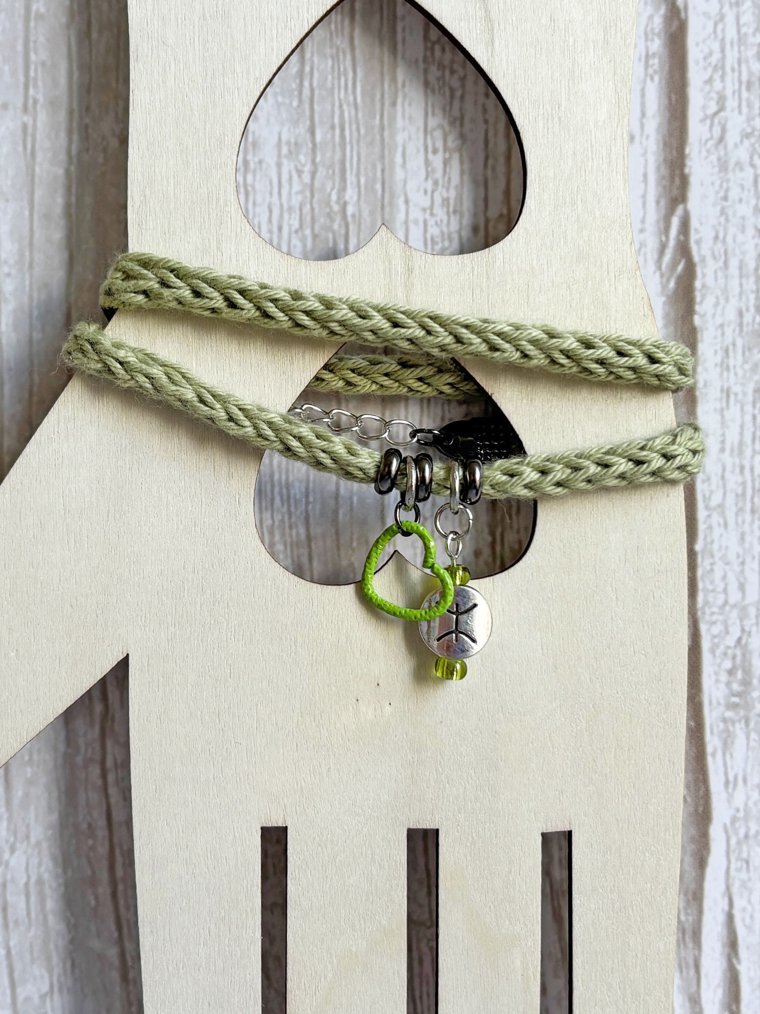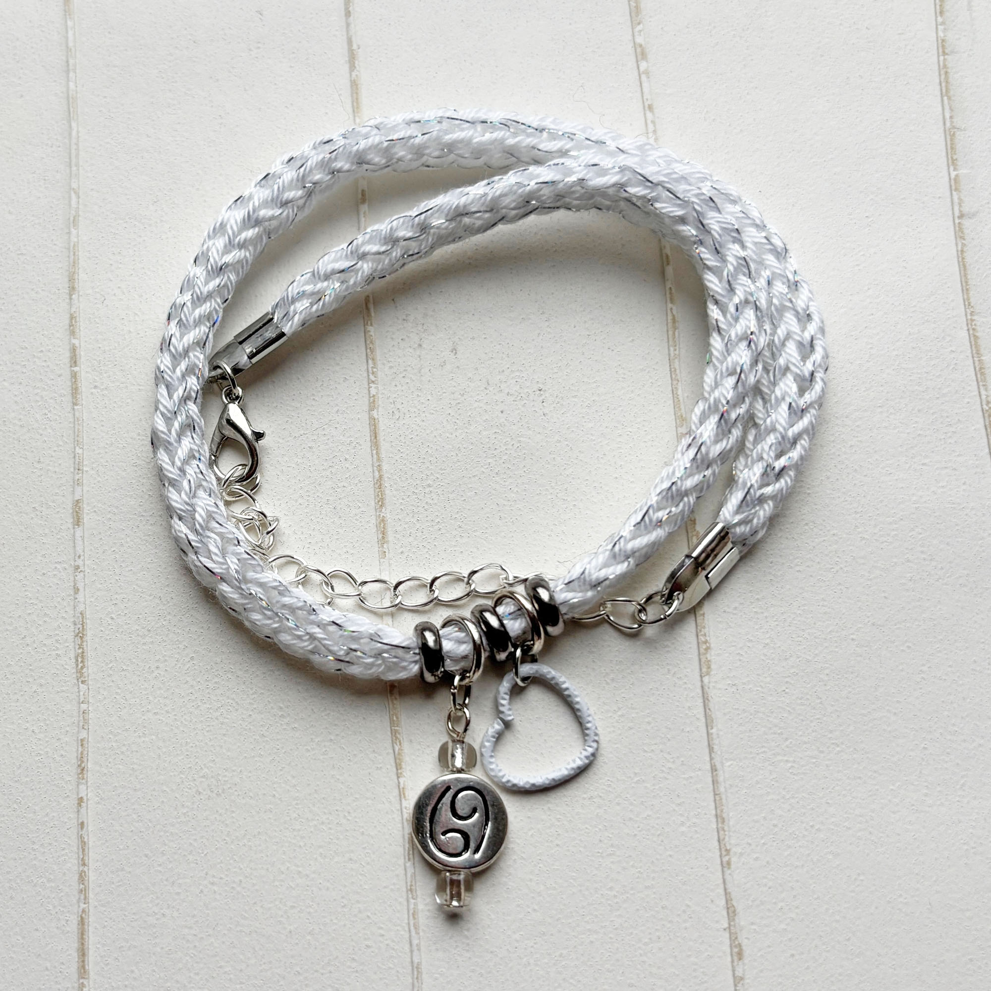Wickelarmband aus Baumwollkordel mit einem Sternzeichenanhänger und einem kleinen Herz.