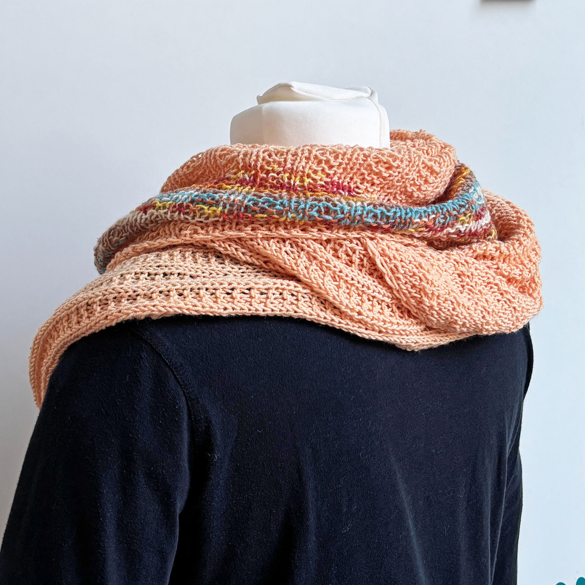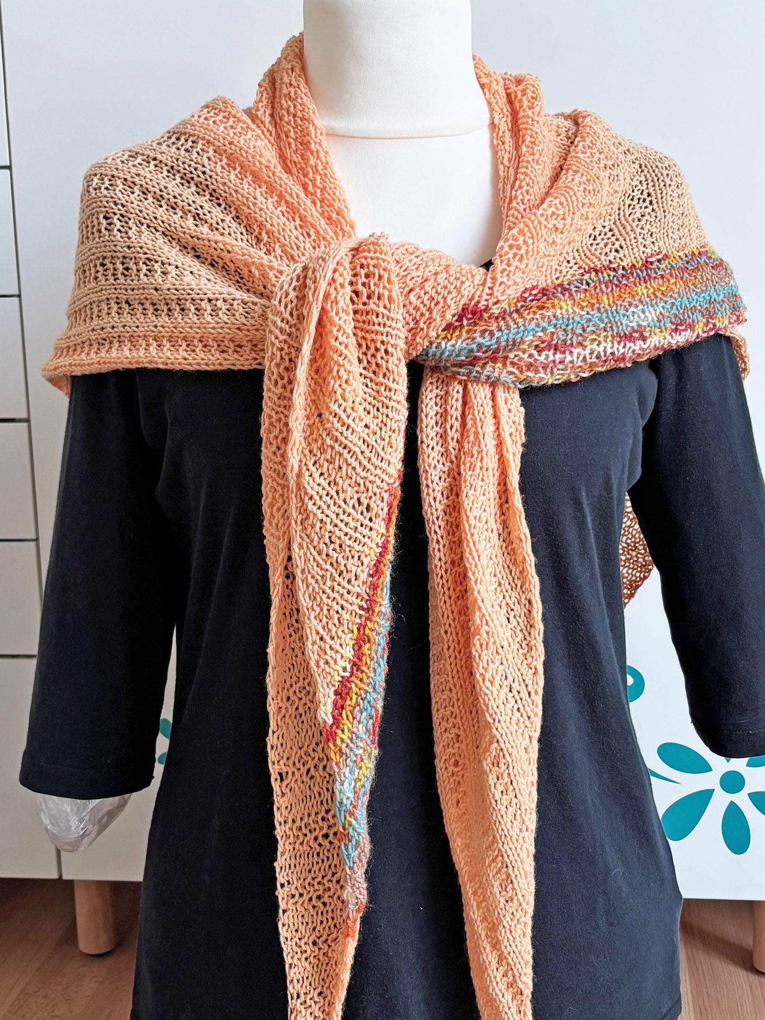 Die Farbe ist ein zartes Pastellorange, als besonderen Hingucker hat das Tuch einen farblich passenden Streifen in Rost und Graublau.