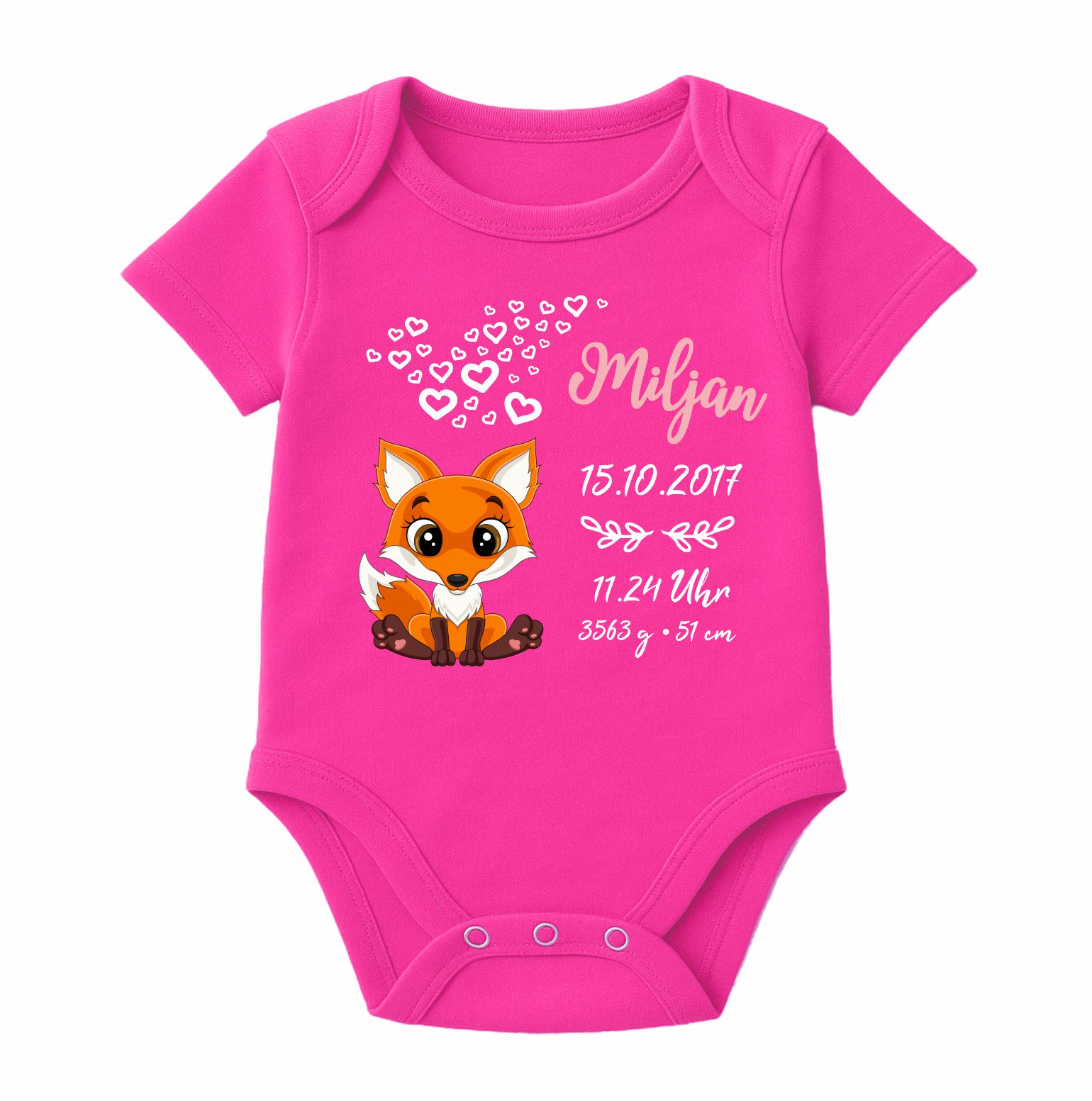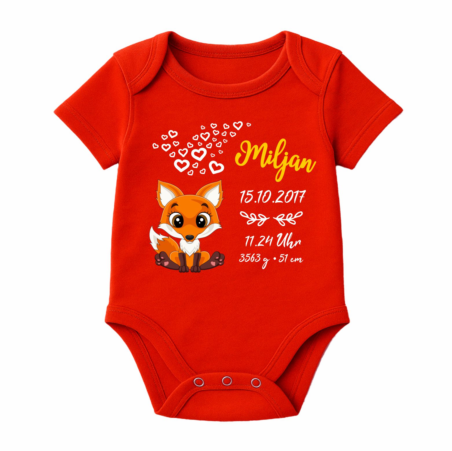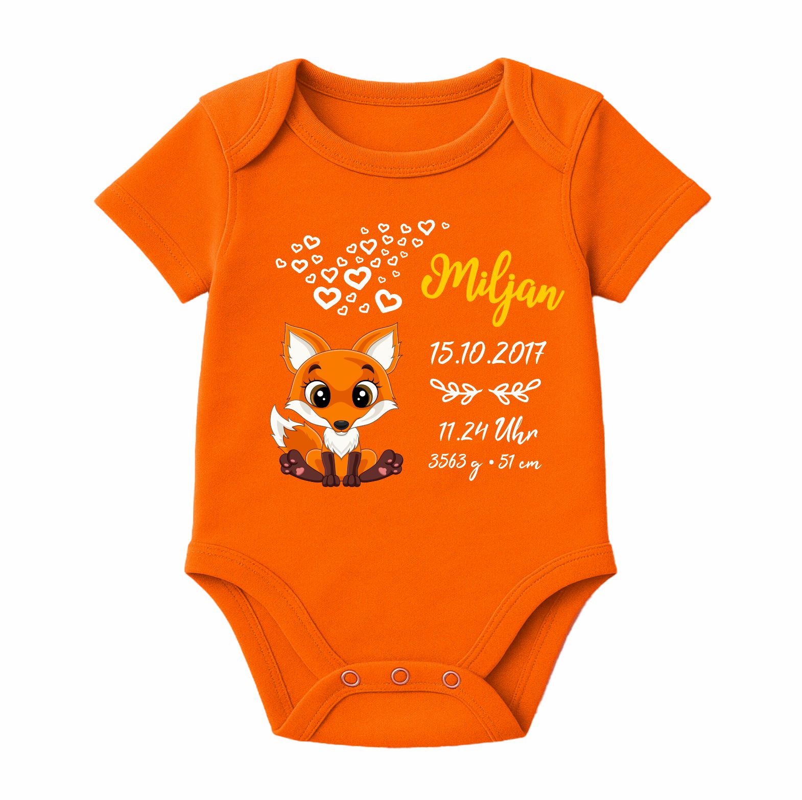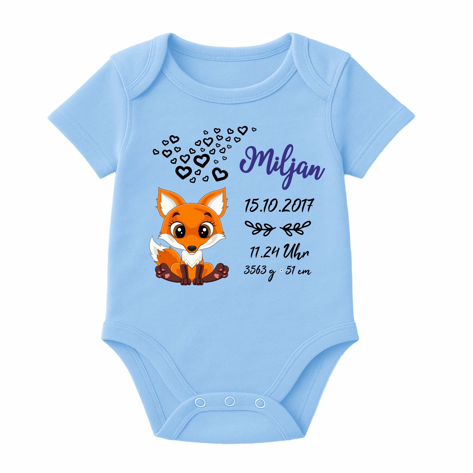 Der Kurzarm Baby Body wird mit dem abgebildeten Motiv und den Geburtsdaten deines Kindes bedruckt.