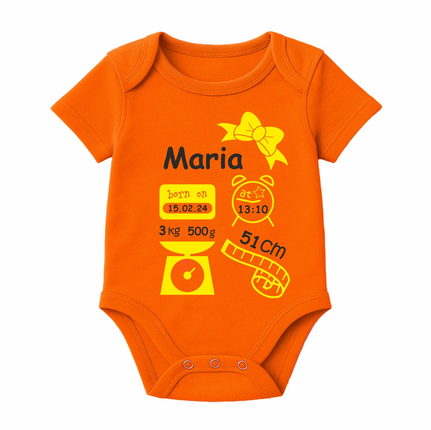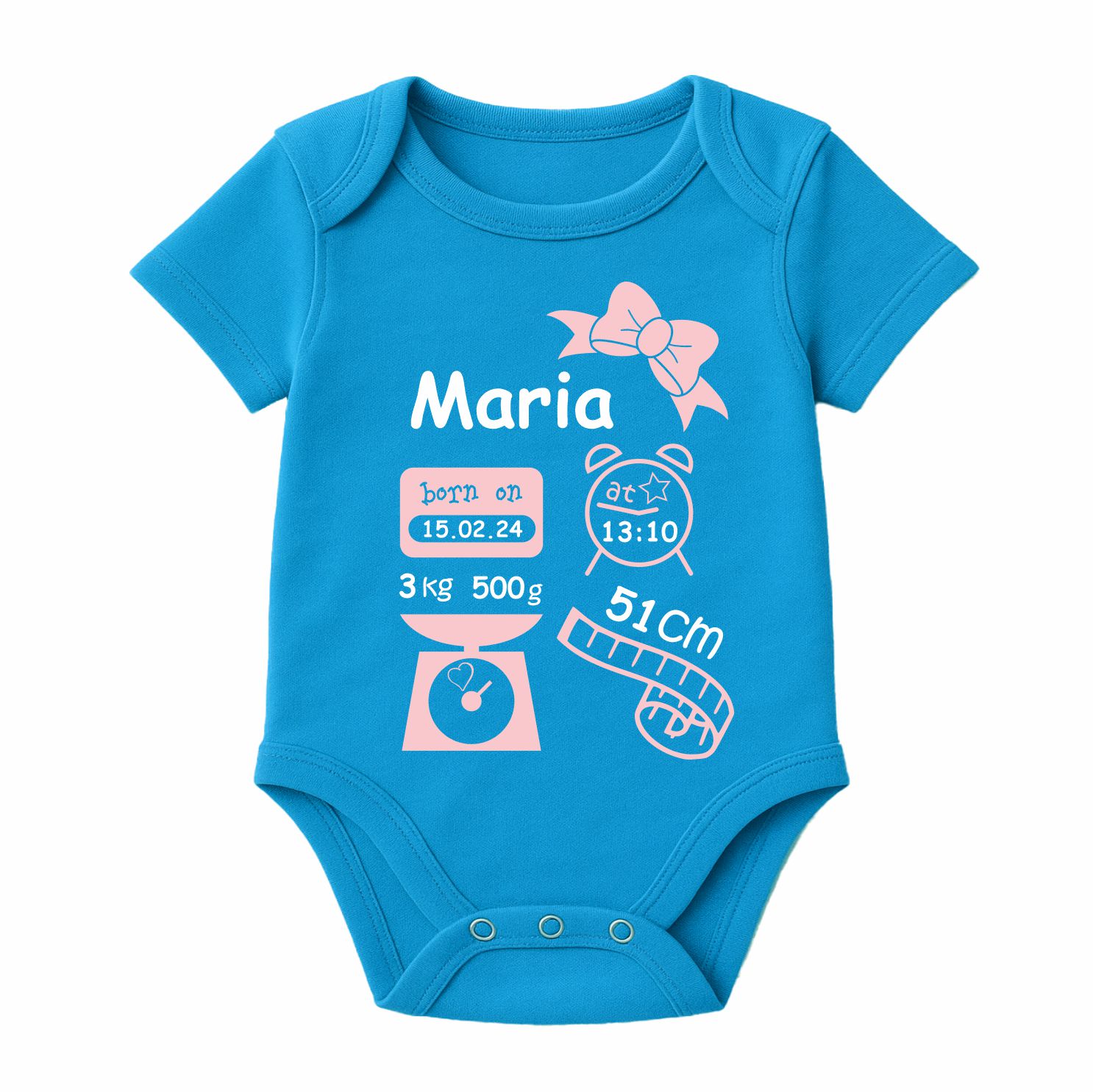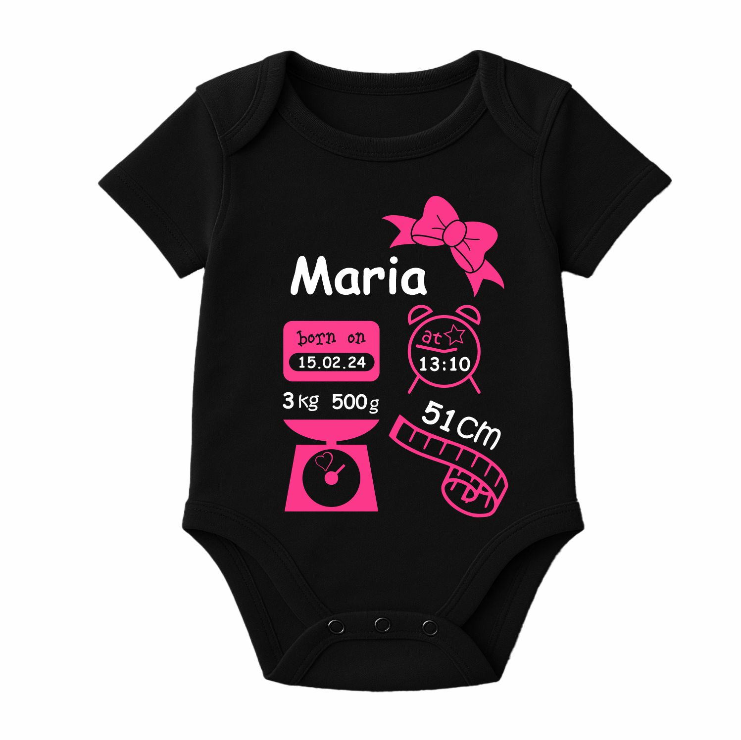 Der Kurzarm Baby Body wird mit dem abgebildeten Motiv und den Geburtsdaten deines Kindes bedruckt.