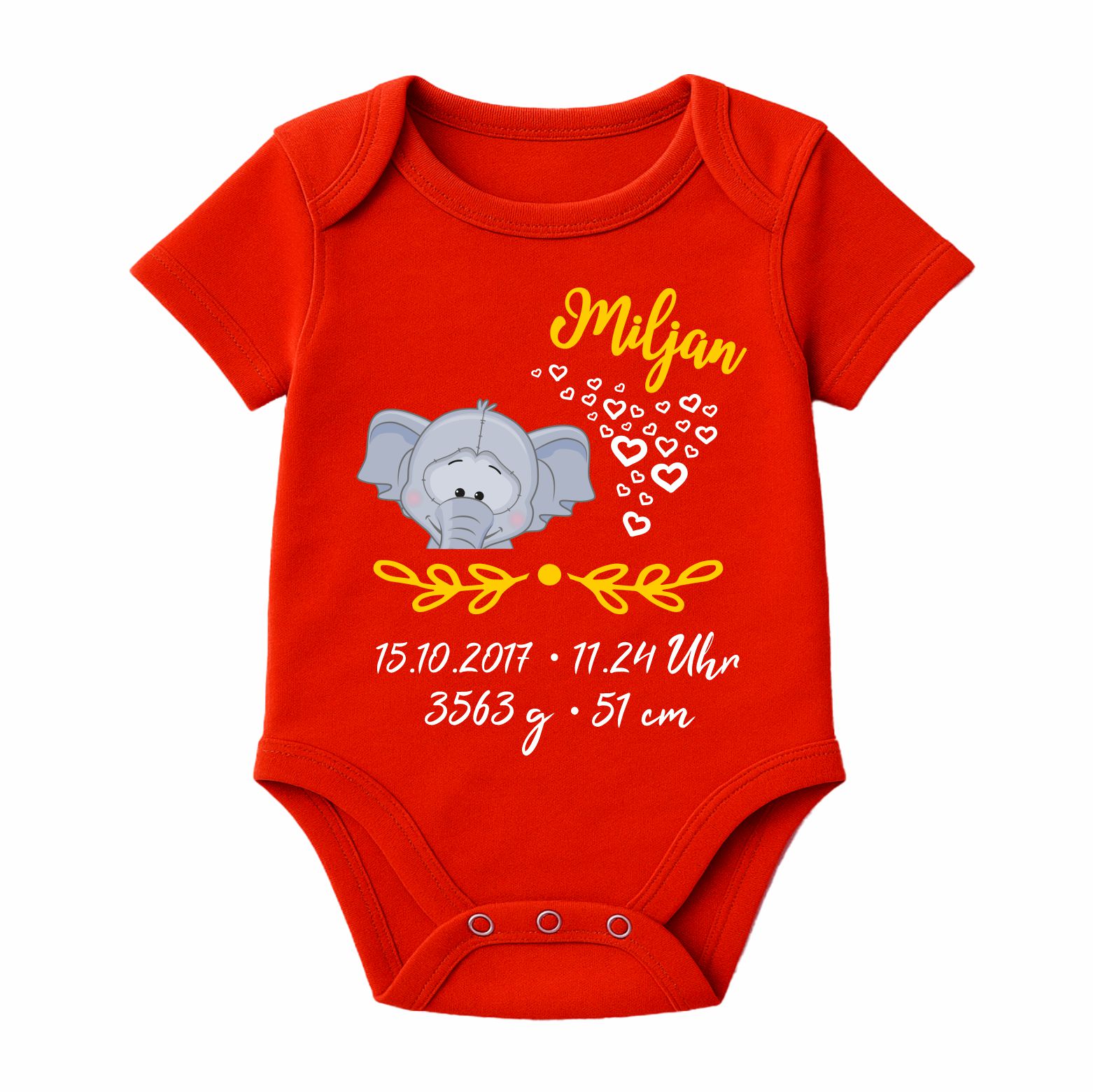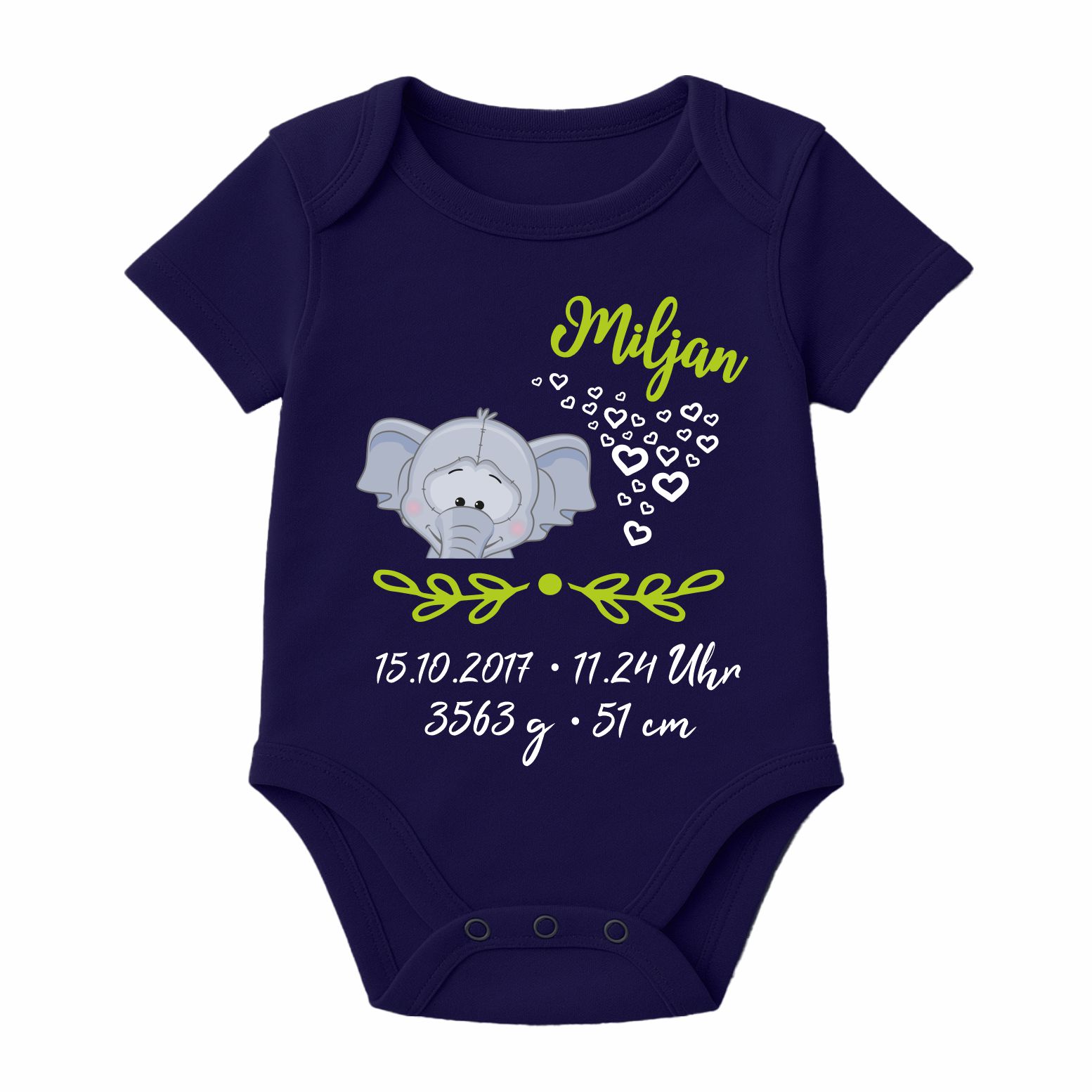 Der Kurzarm Baby Body wird mit dem abgebildeten Motiv und den Geburtsdaten deines Kindes bedruckt.