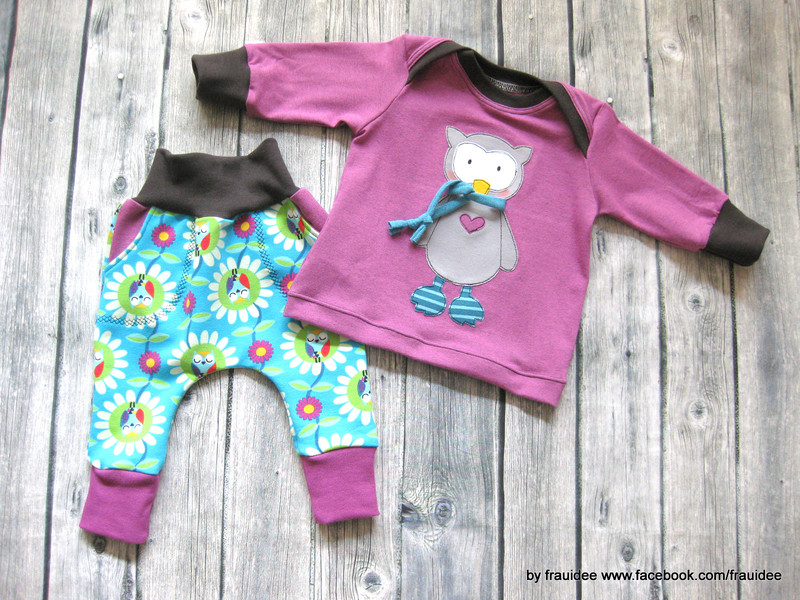 Die Hose habe ich aus kuschelig weichem Sweatstoff mit ganz vielen Eulen gefertigt. Sie ist sehr bequem und hat am Bauch und an den Beinen weiche Bündchen. Somit lässt die Hose genug Bewegungsfreiheit für kleine Strampelbeinchen. Süße Taschen und der tiefere Schnitt runden den lässigen Look ab.