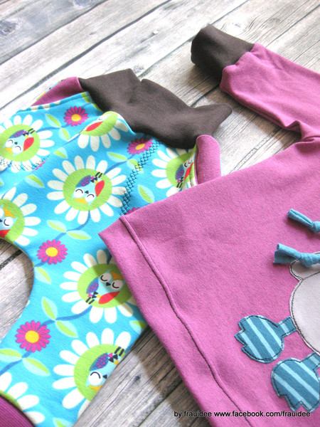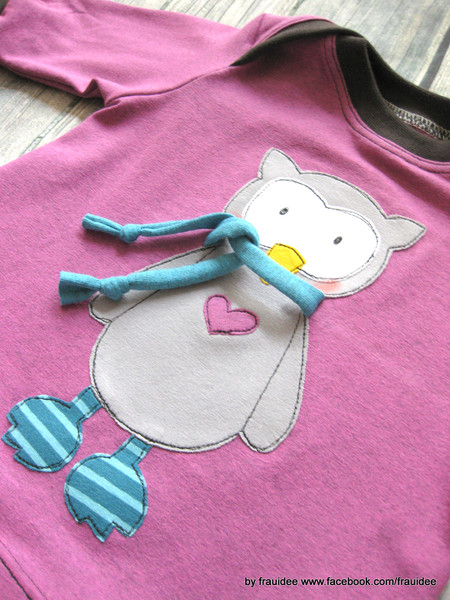 Passend dazu habe ich das Shirt aus orchideefarbenem Bio-Baumwolljersey genäht. Es hat einen sogenannten "amerikanischen Ausschnitt", so dass Baby´s Köpfchen ohne Probleme durchpasst. Vorne habe ich eine Eule mit Schal appliziert, nach der Vorlage von Gänsefüsse.