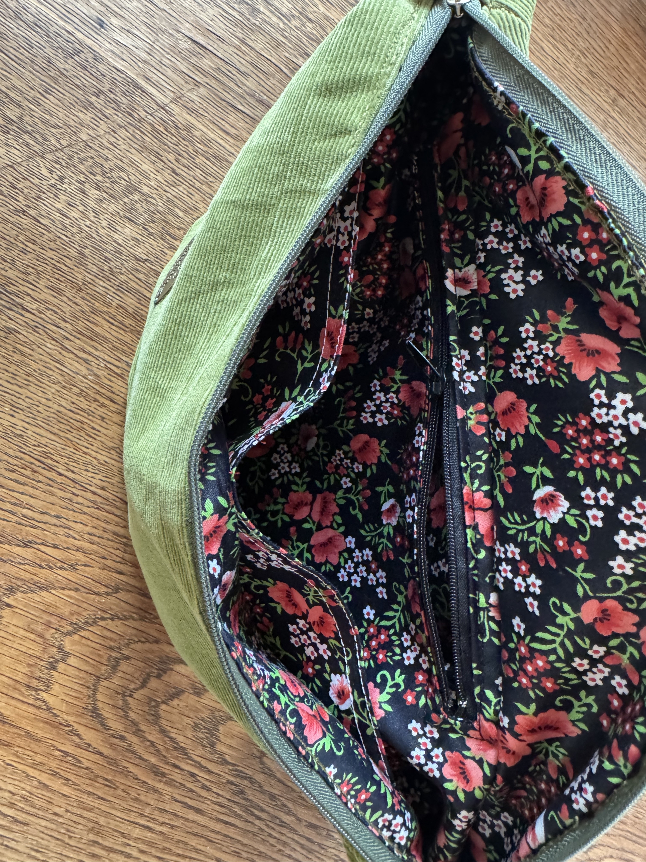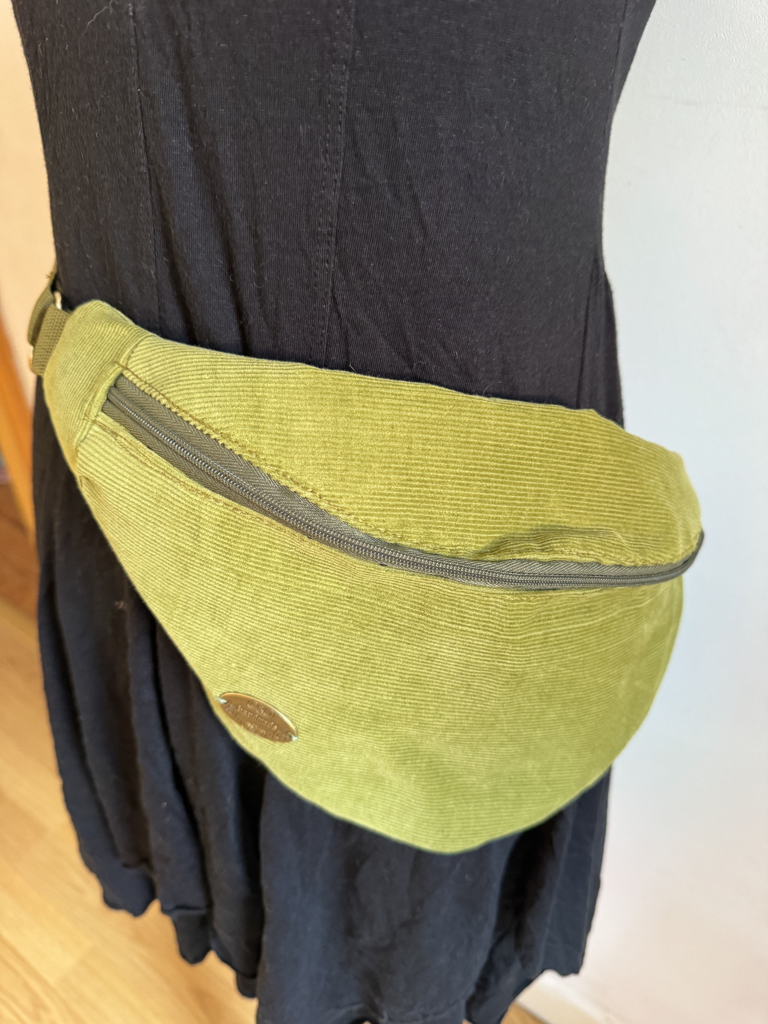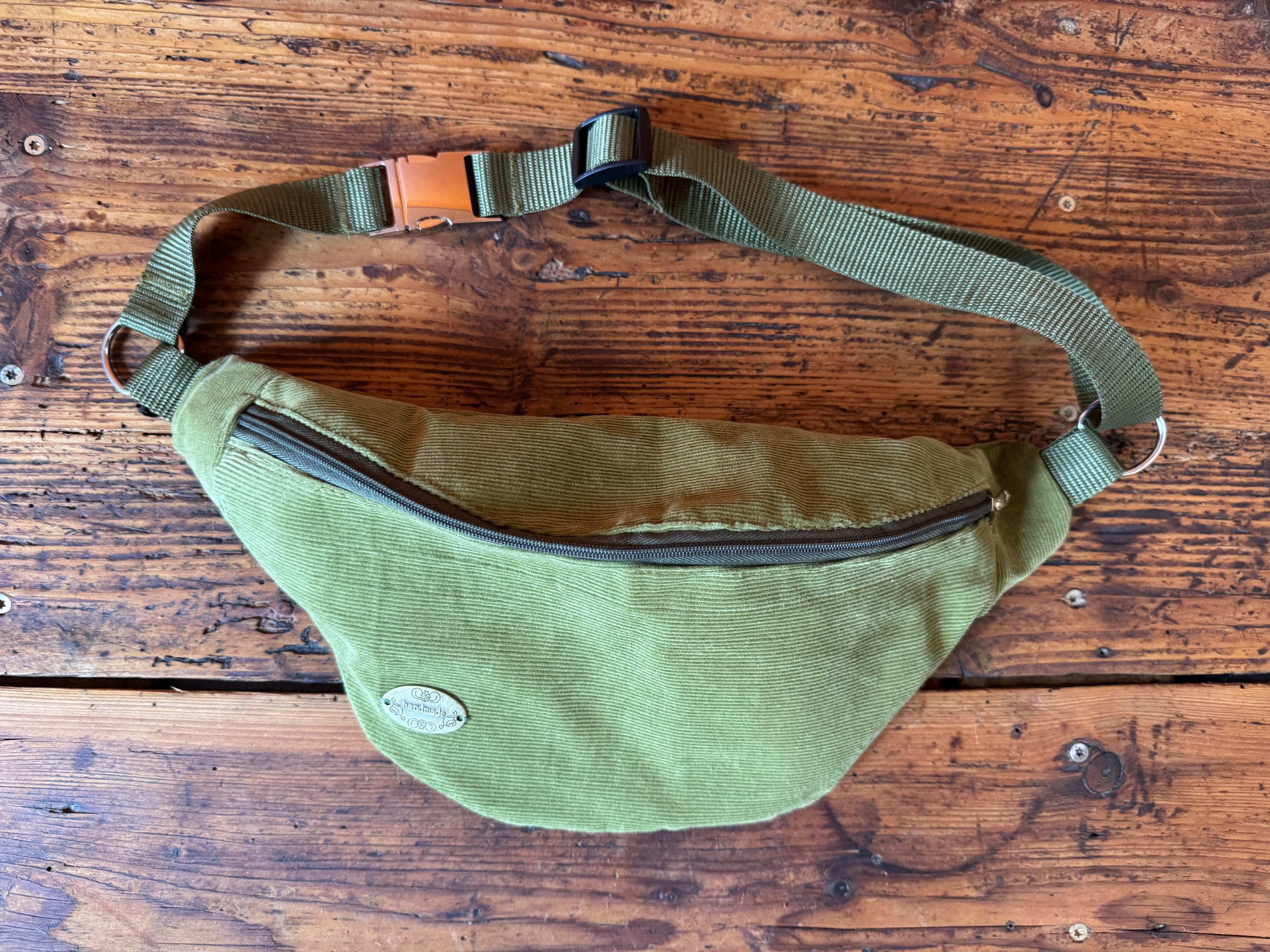 Praktische Bauchtasche aus hochwertigem, grünem Feincord mit farblich angepasstem, geblümten Baumwollstoff in so richtig schönen Farben.