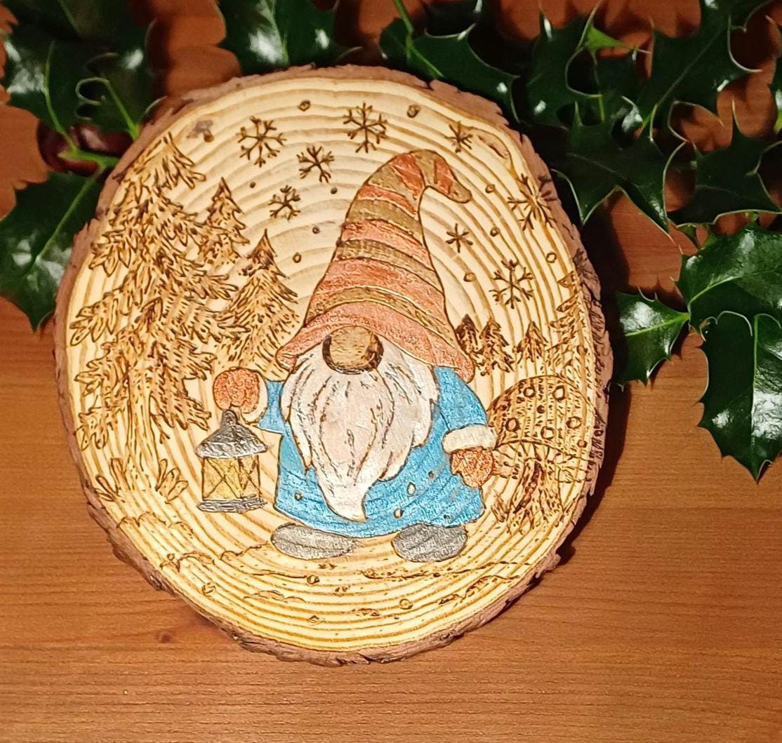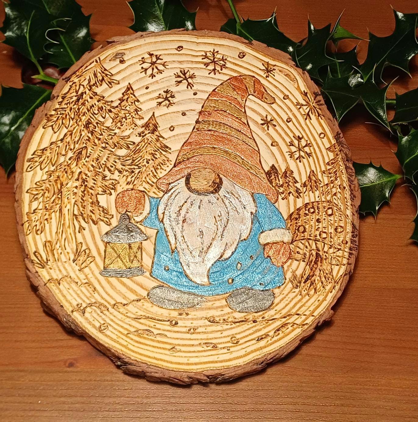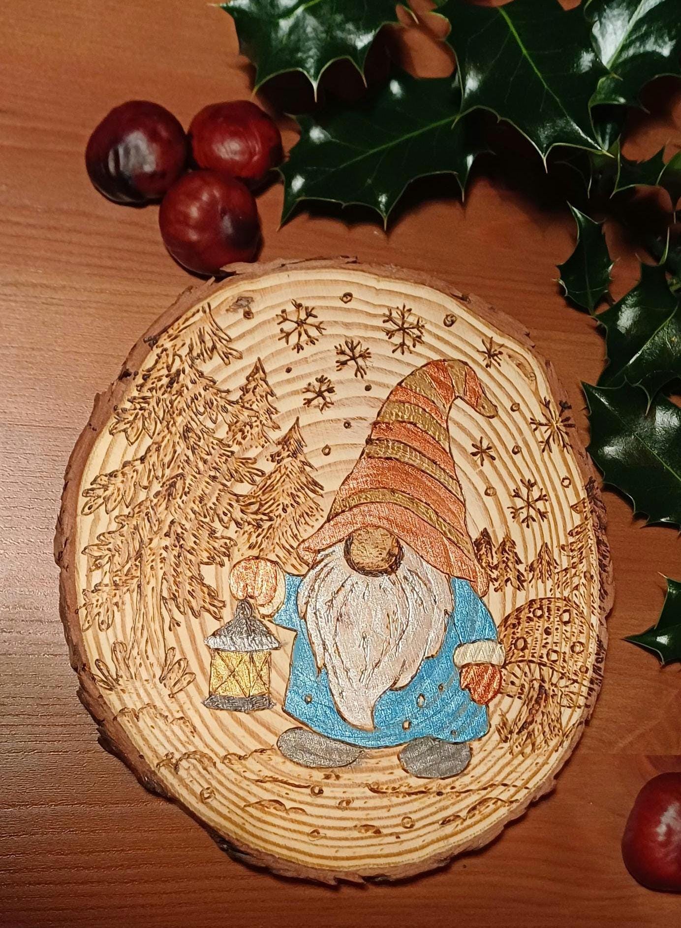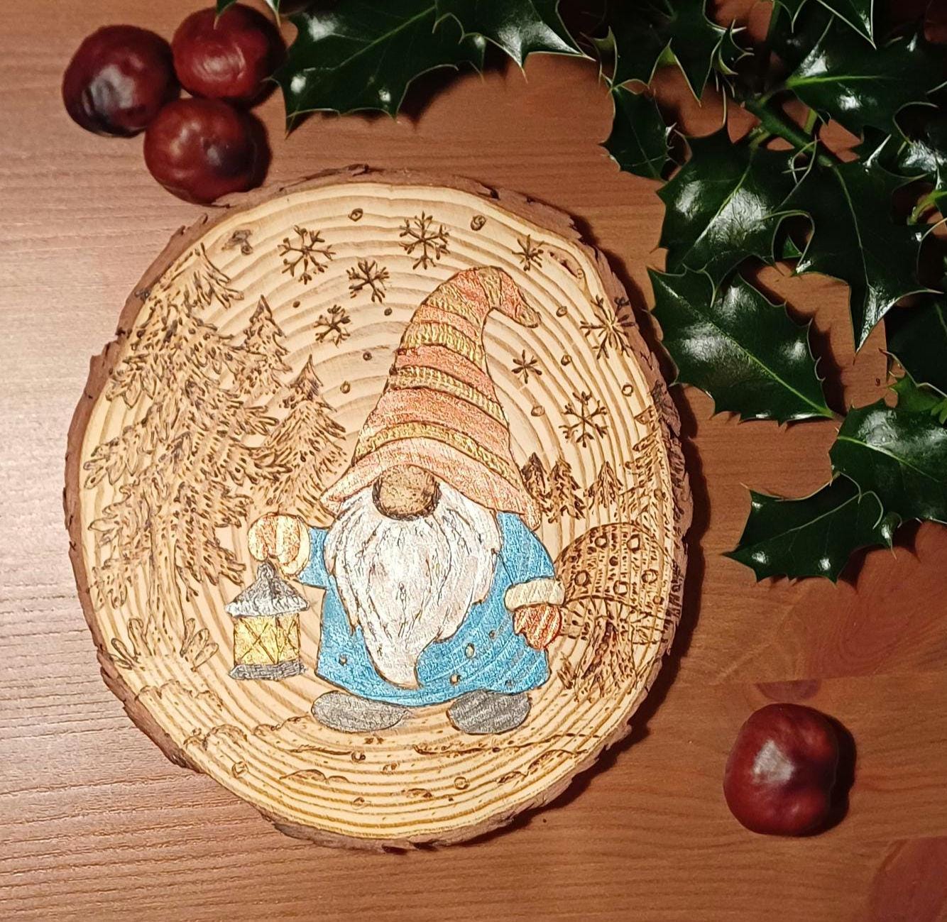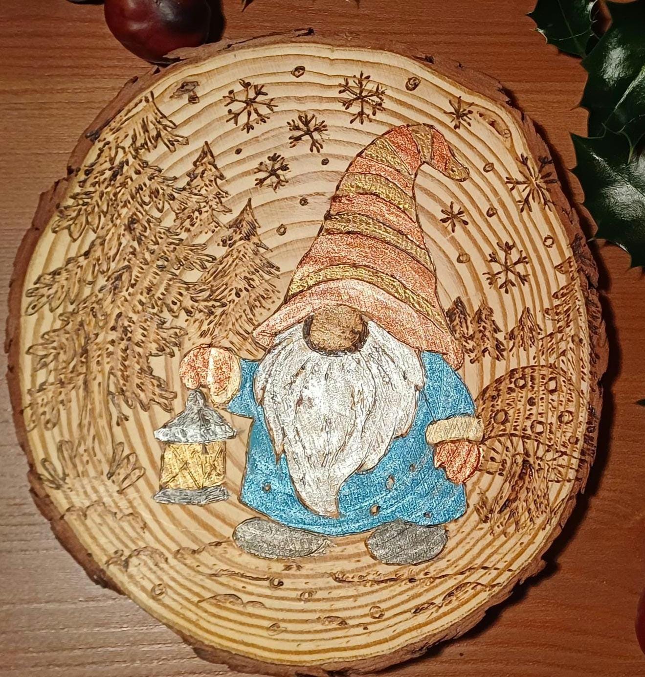 Diese detailreich gebrannte und bemalte Baumscheibe wurde in liebevoller Handarbeit gefertigt.