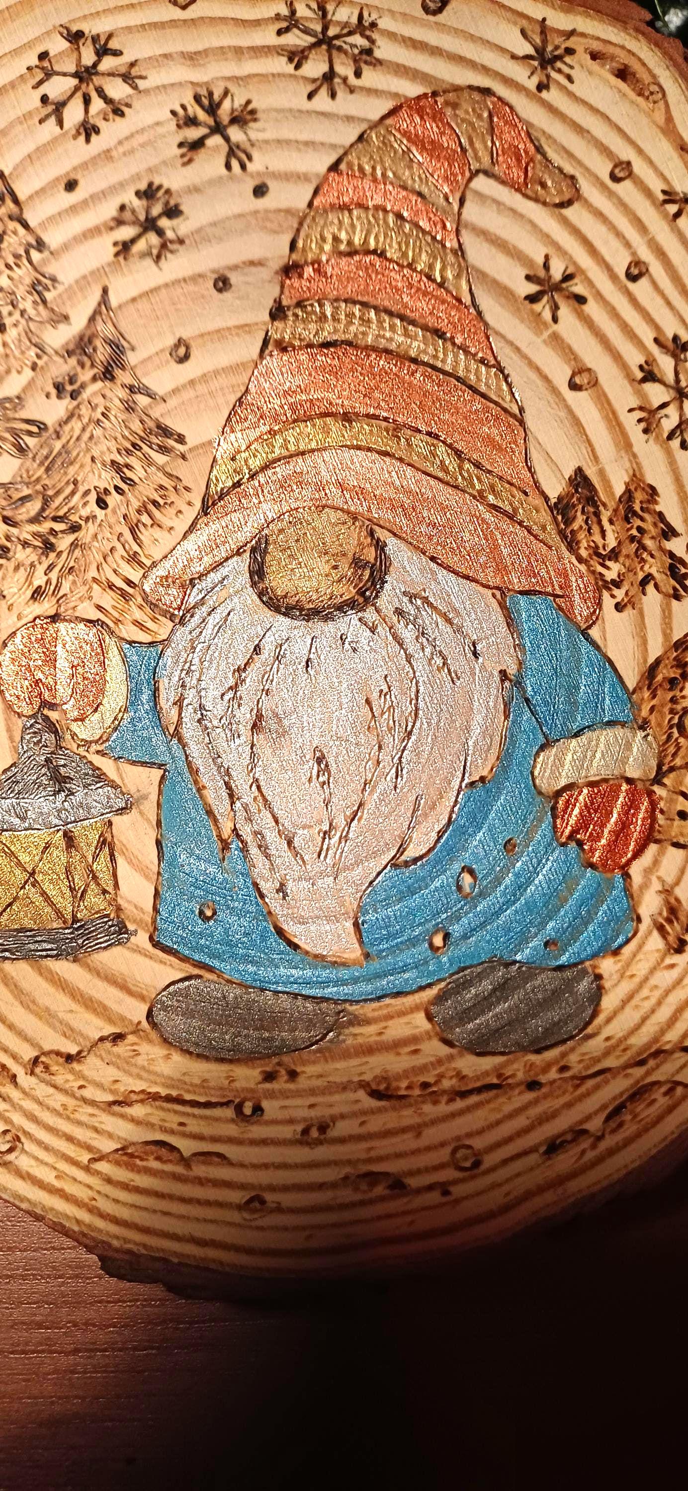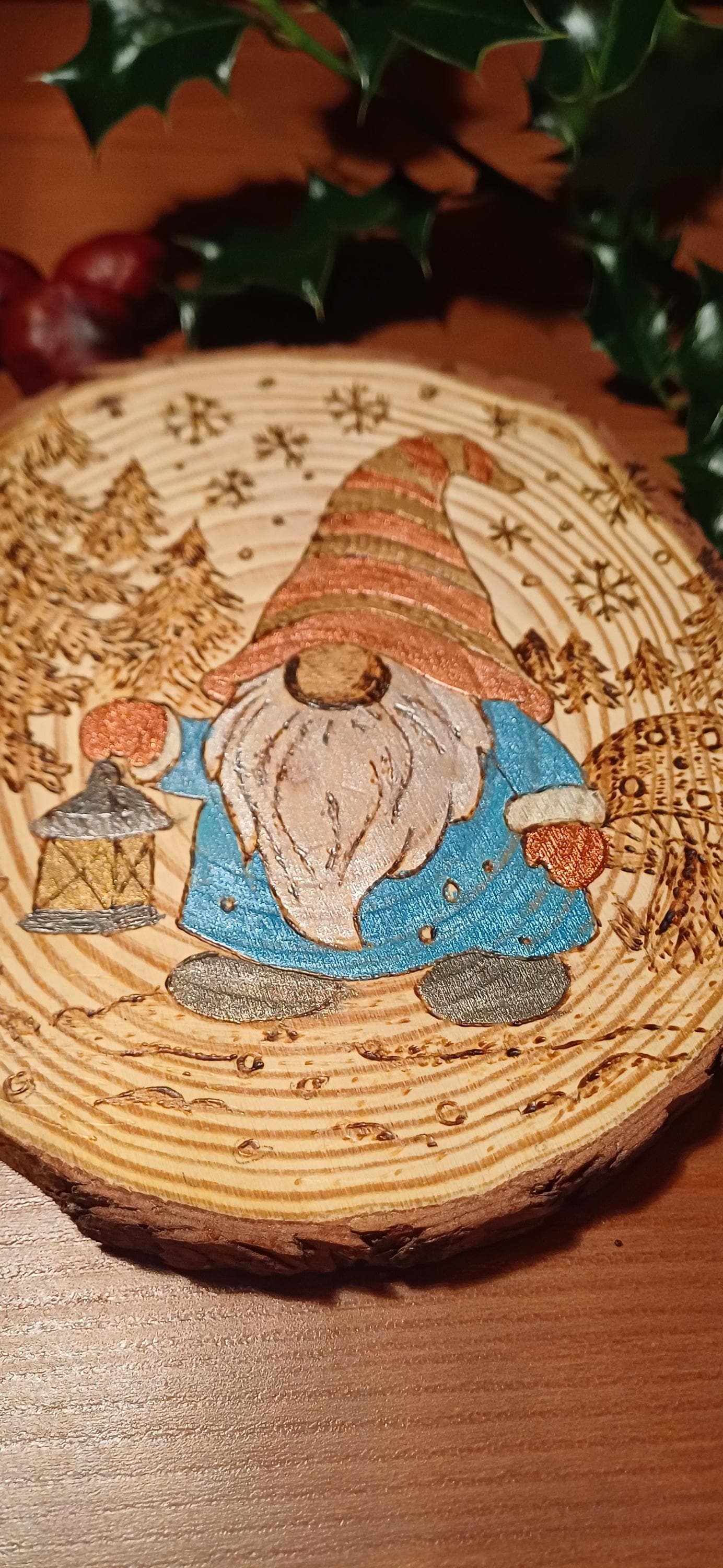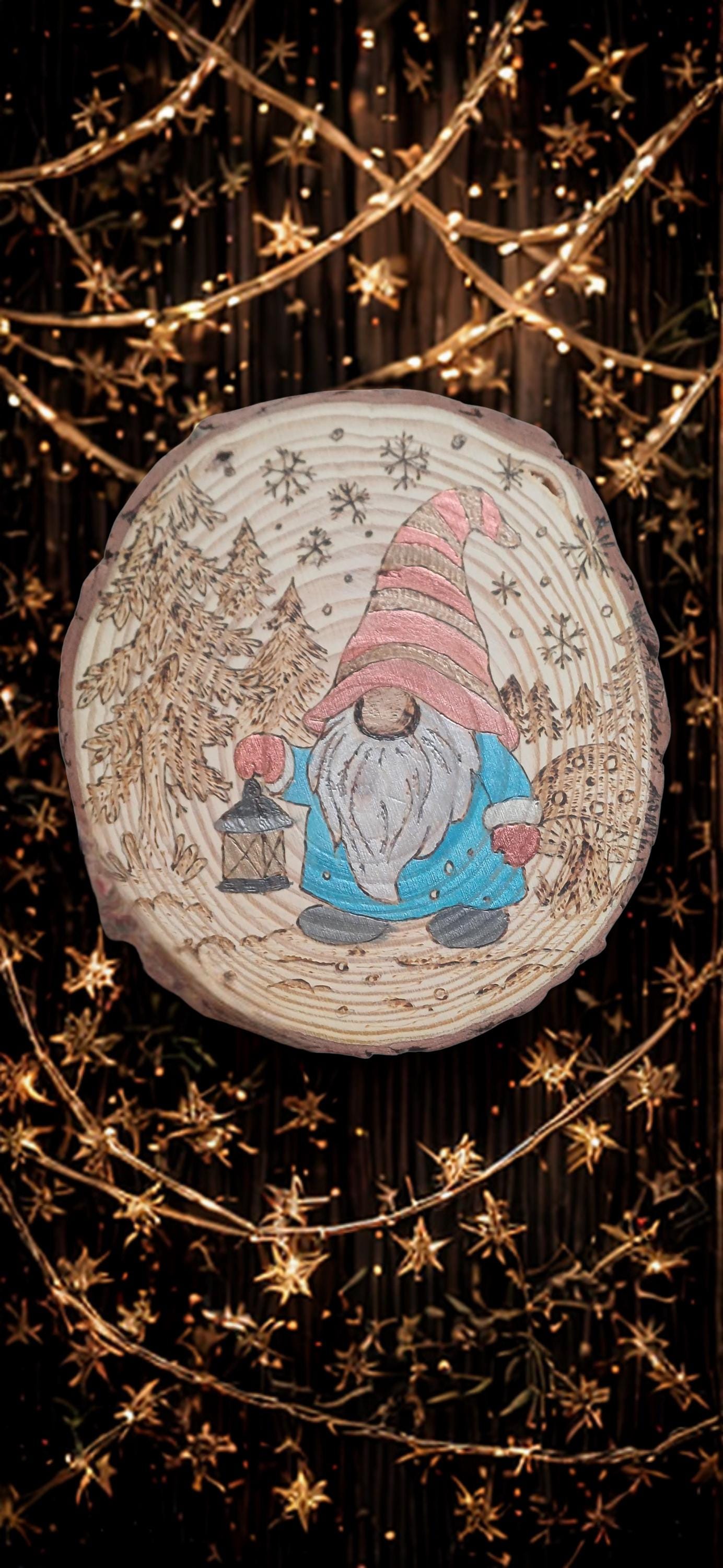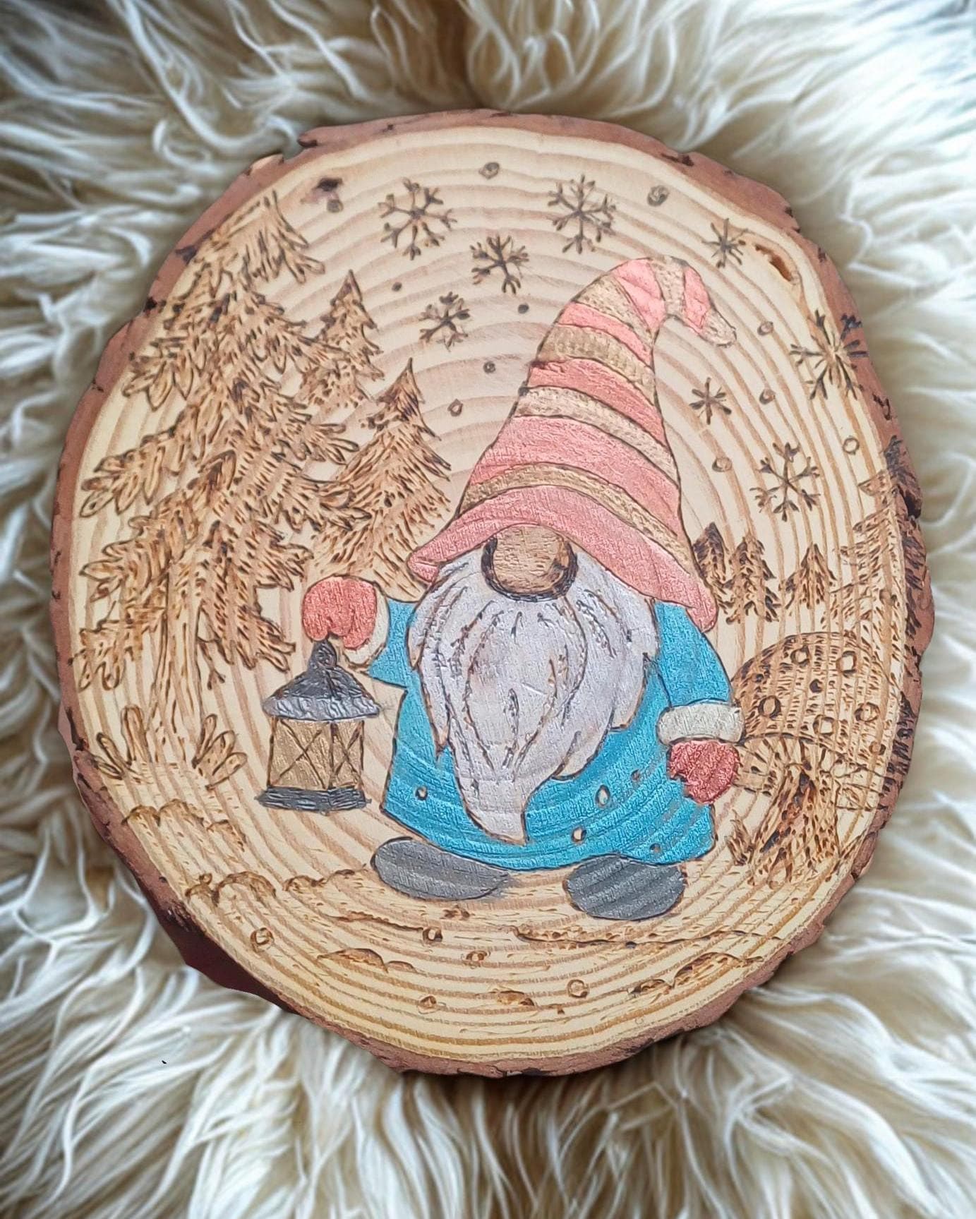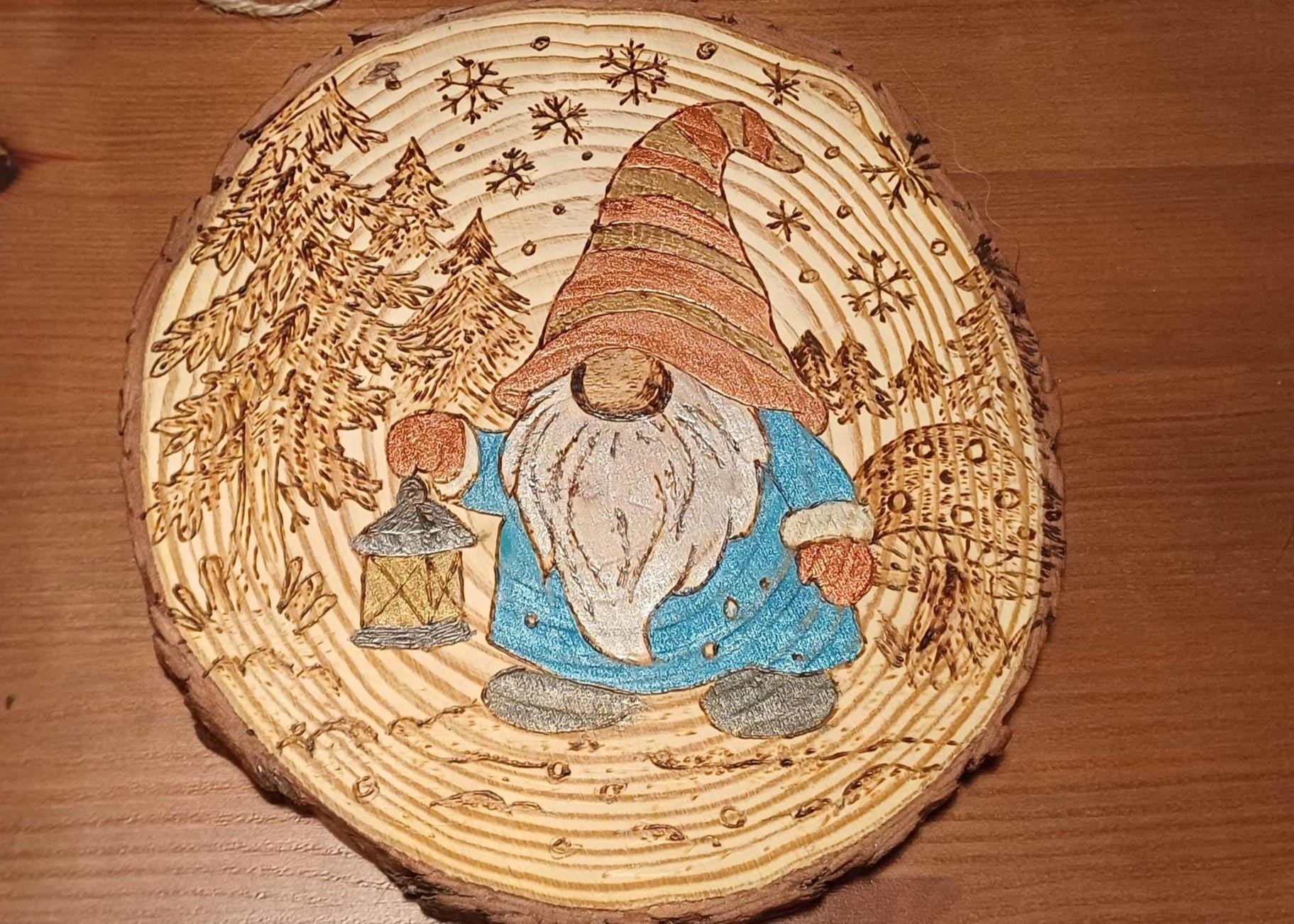 Diese detailreich gebrannte und bemalte Baumscheibe wurde in liebevoller Handarbeit gefertigt.