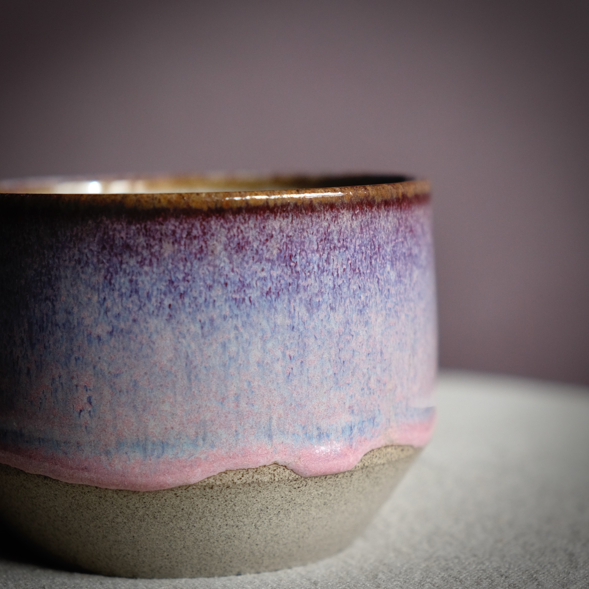 Dieser handgefertigter Becher besteht aus betongrauem Ton und ist mit meiner Glasur Nala glasiert – einem sanften Spiel aus Flieder, Rosa und blauen Nebeltönen.
