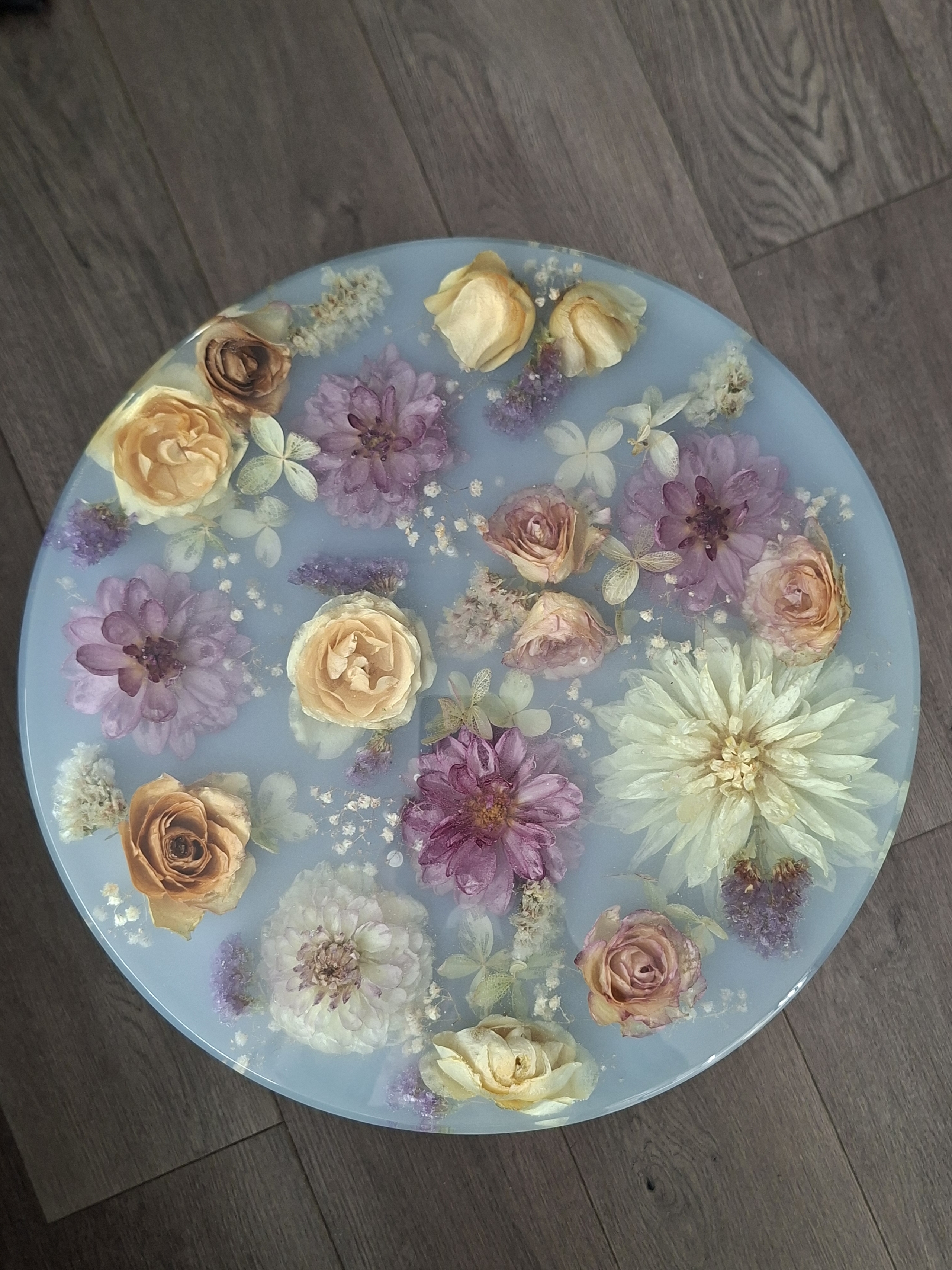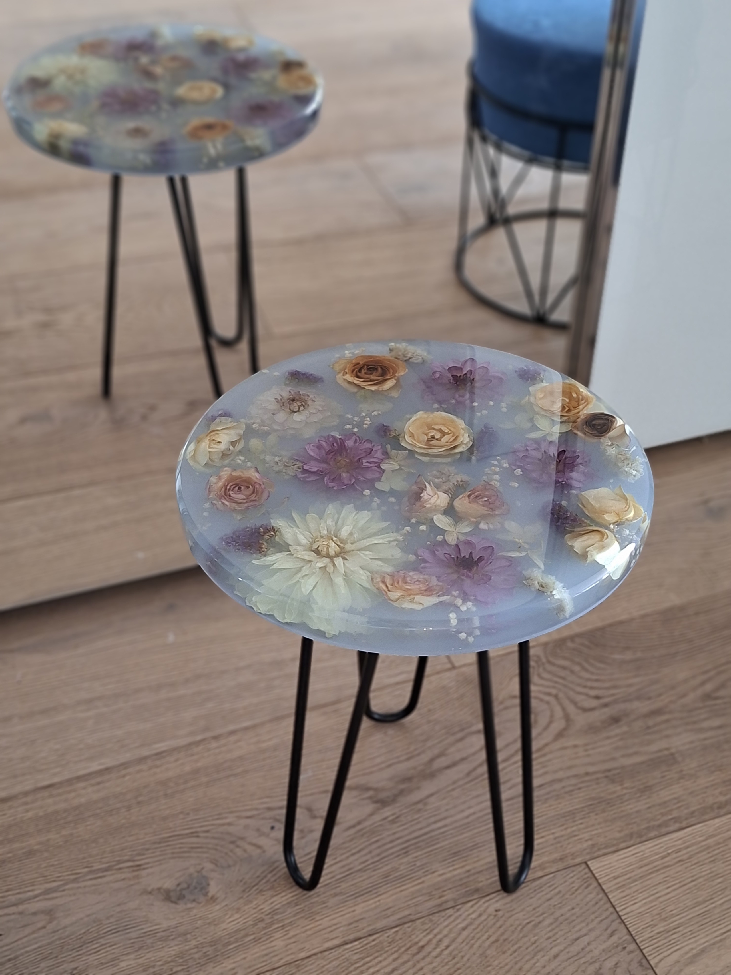Beistelltisch aus Epoxidharz mit echten getrockneten Blumen in hell blau