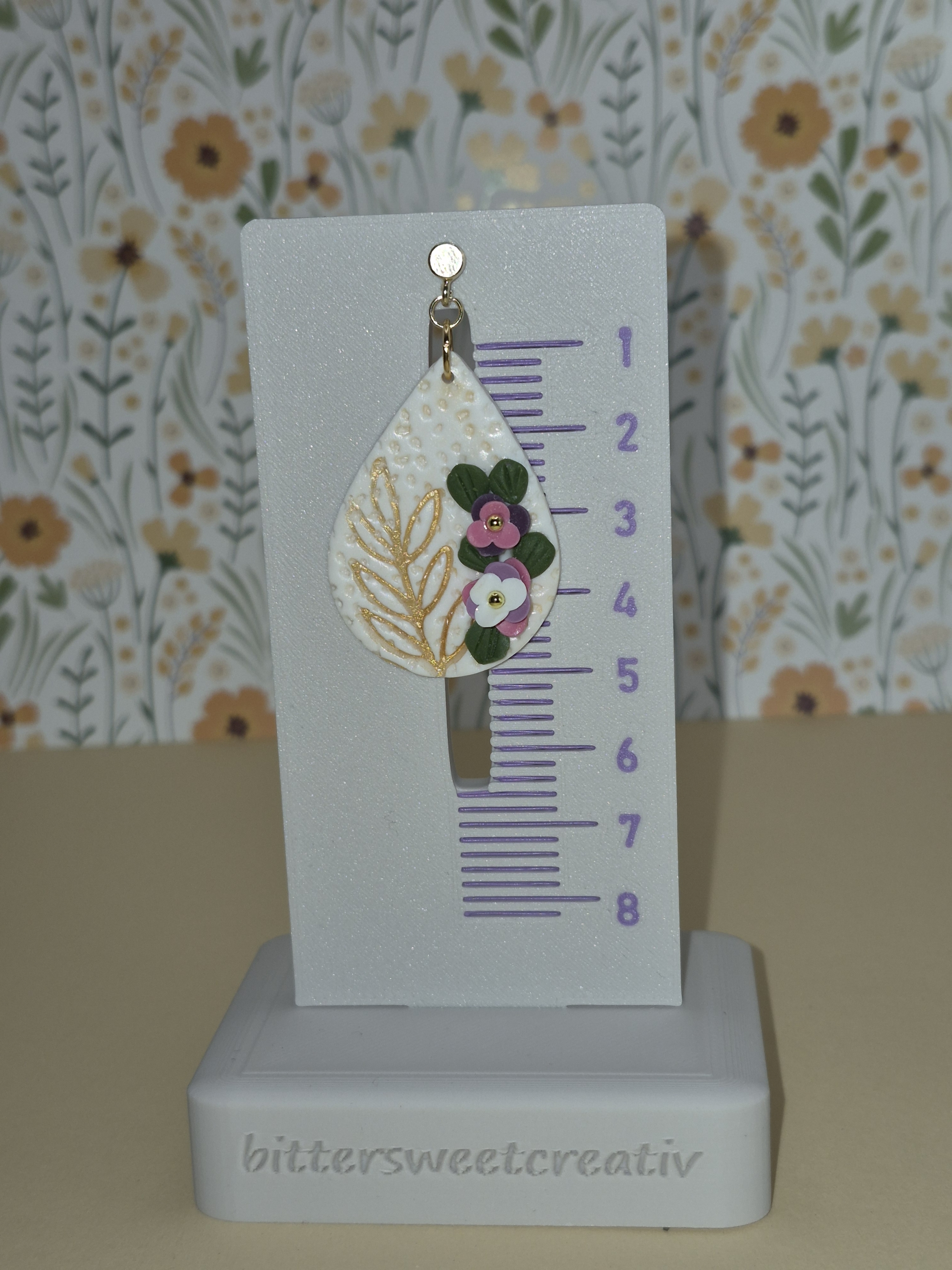 Design: Elegante Tropfenform in Weiß, verziert mit einem floralen Stempelmotiv in Gold.