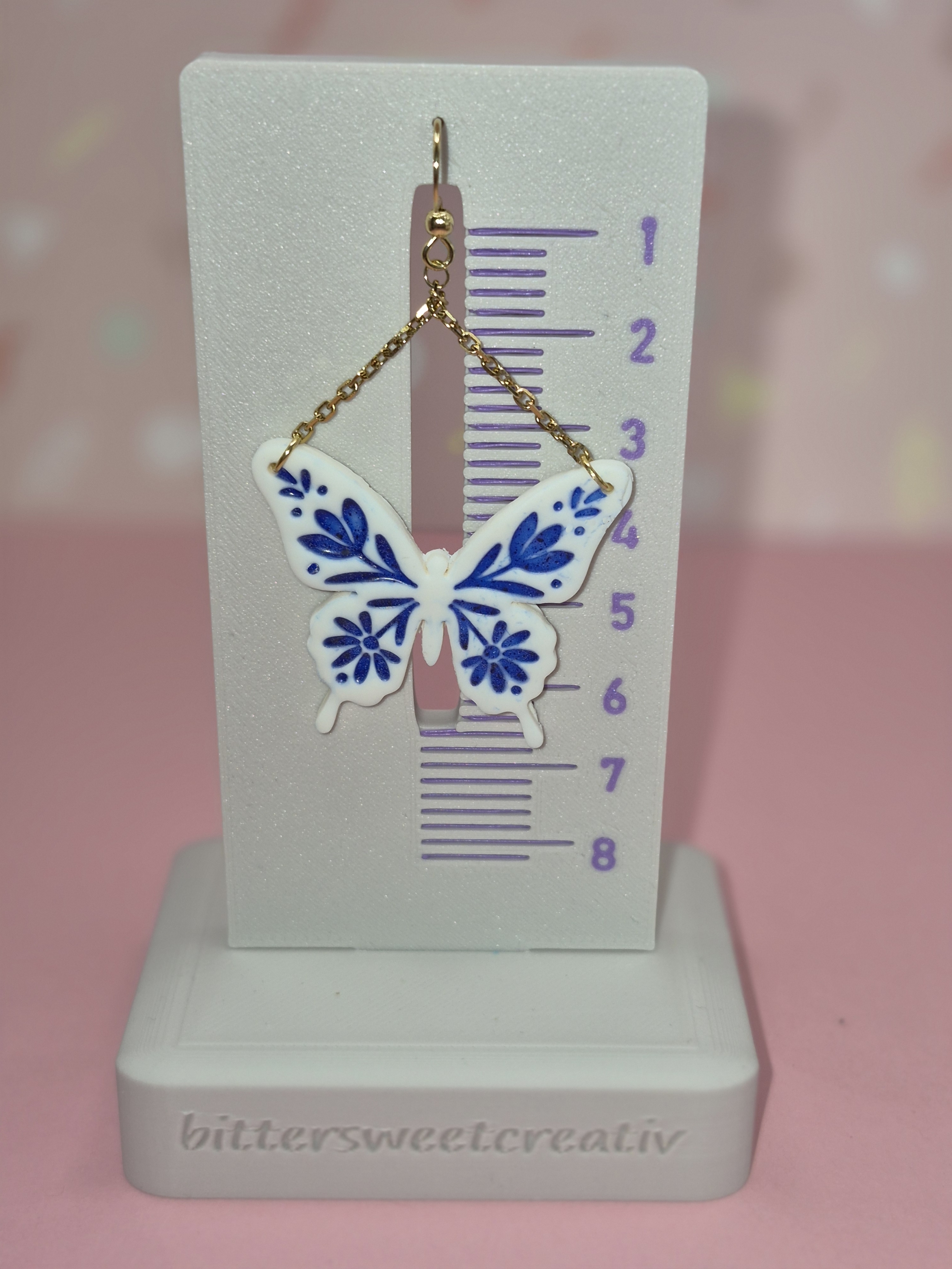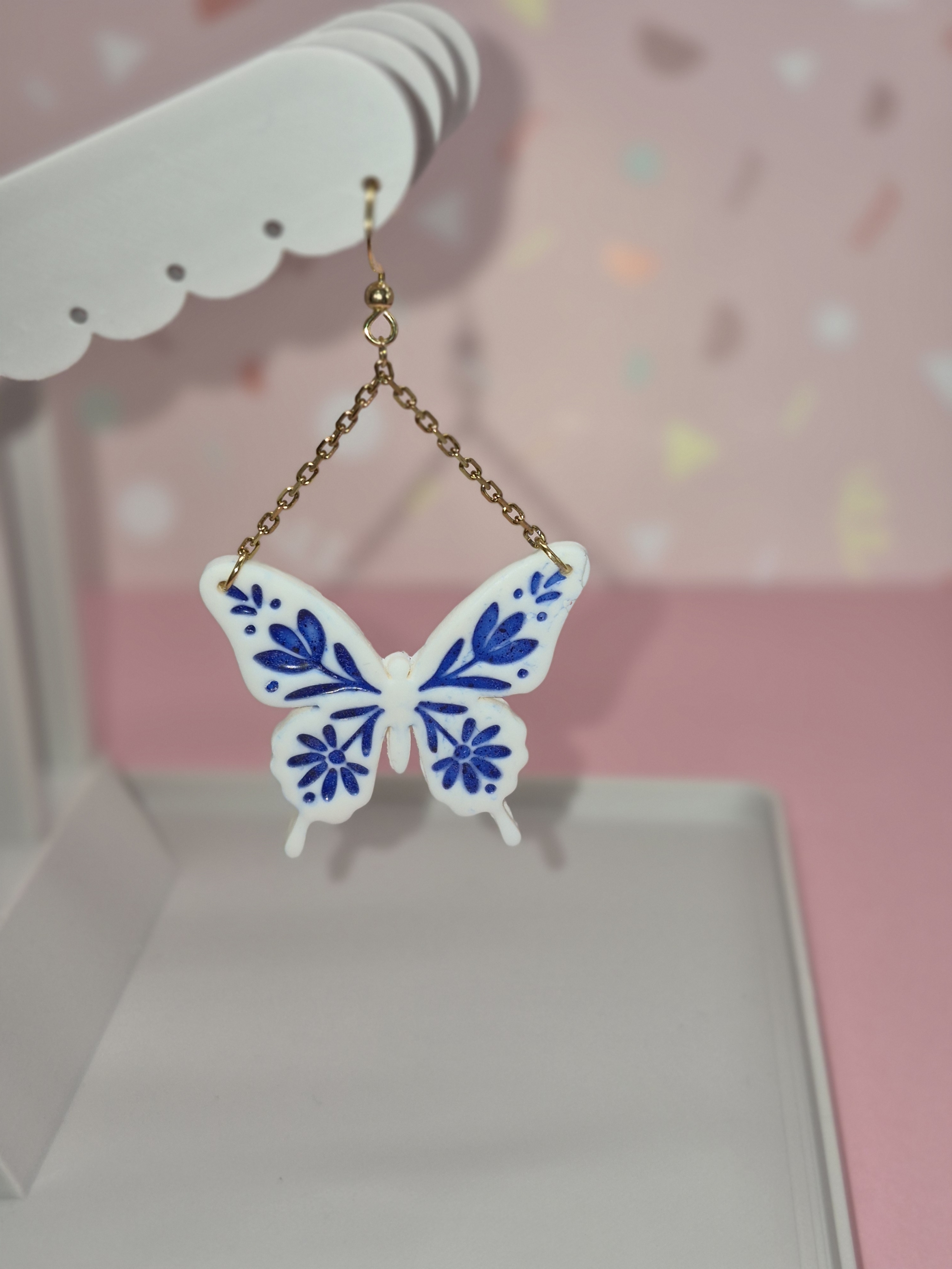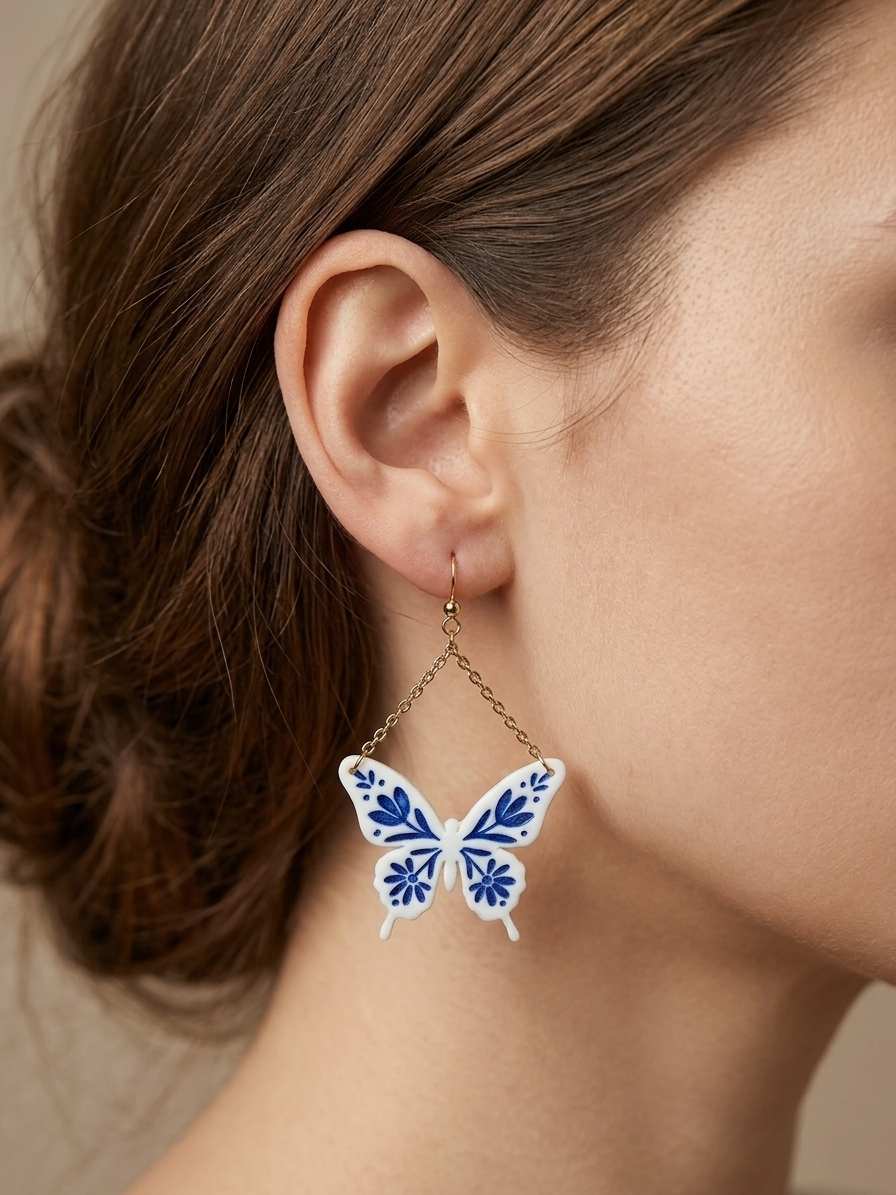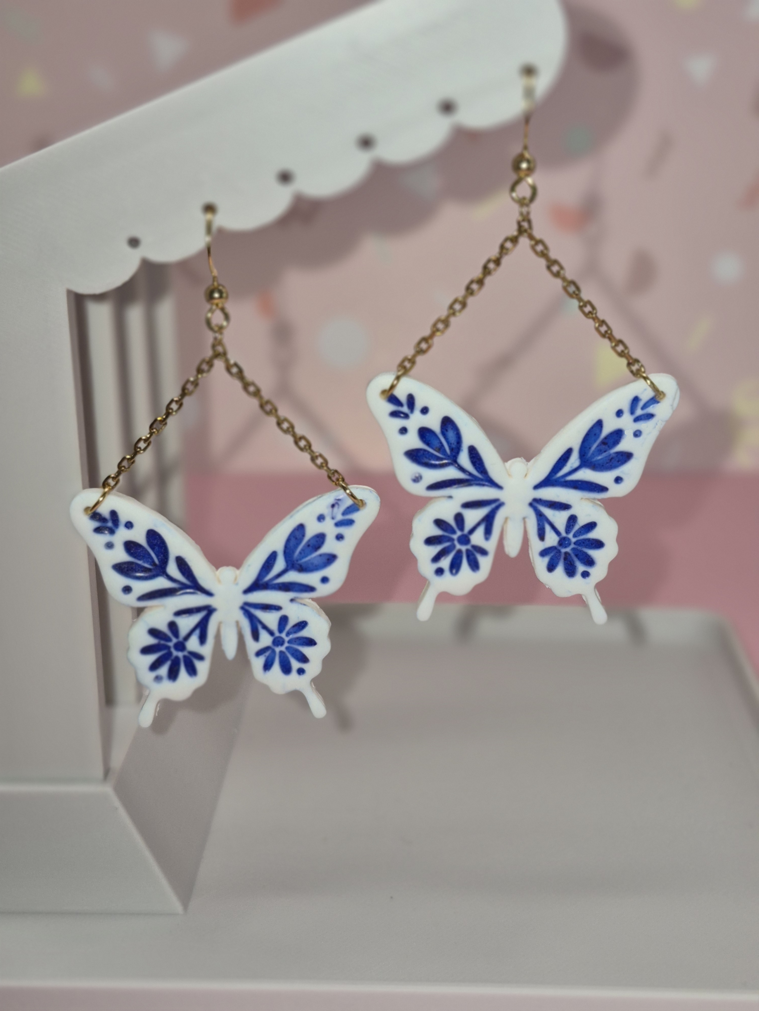 Verleihen Sie Ihrem Outfit einen Hauch von Leichtigkeit und zeitloser Eleganz! Diese wunderschönen Statement-Ohrringe kombinieren filigrane Goldketten mit einem kunstvollen Schmetterlings-Anhänger, der an klassisches Delfter Blau oder edles Porzellan erinnert.