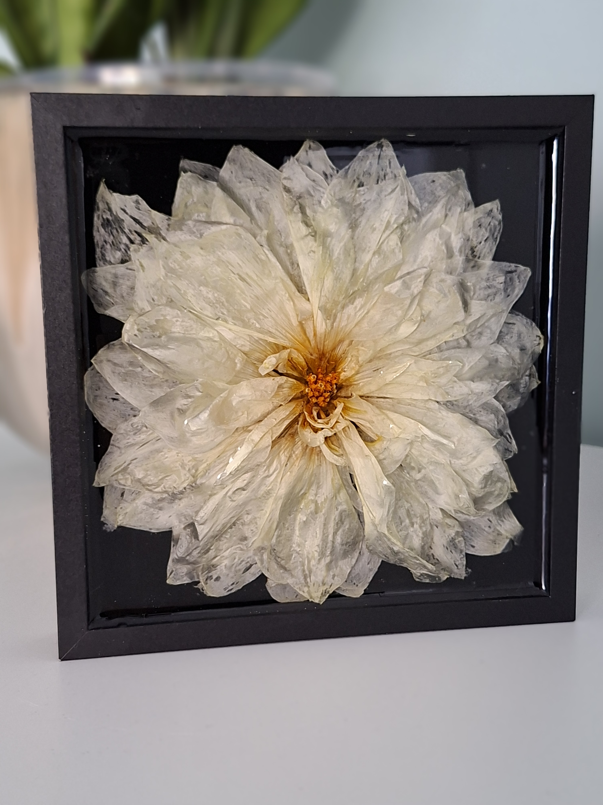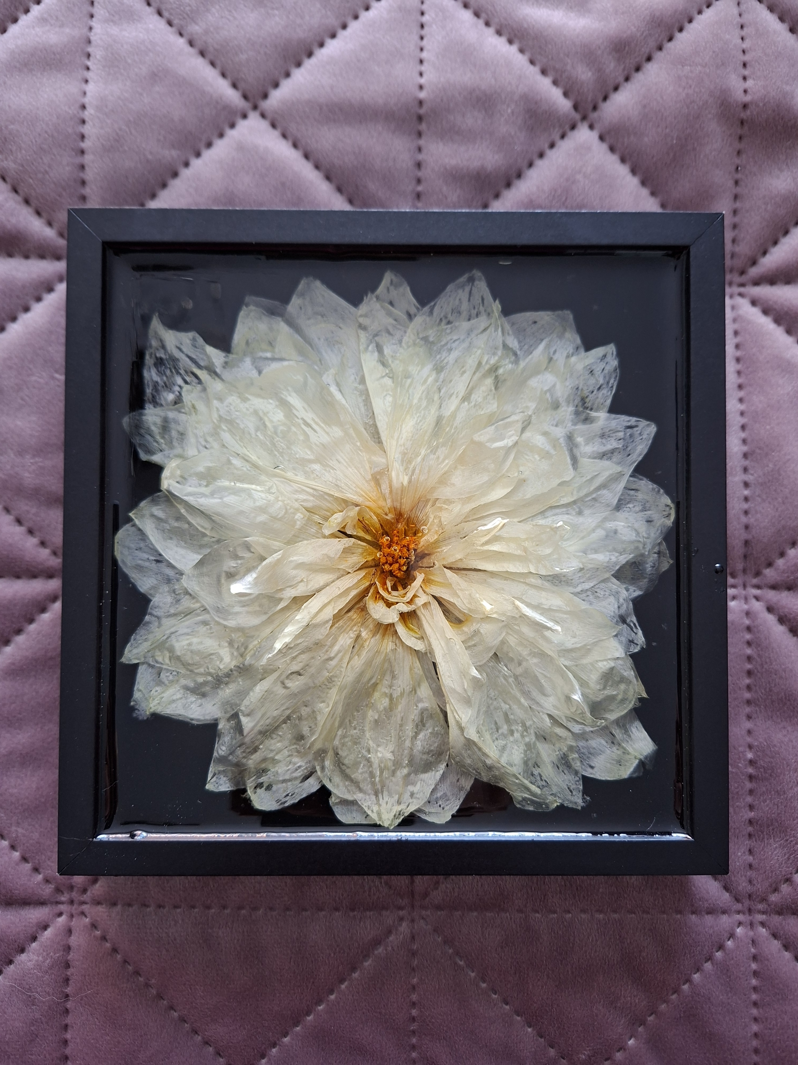 Echte getrocknete weise Dahlie in Epoxidharz eingegossen