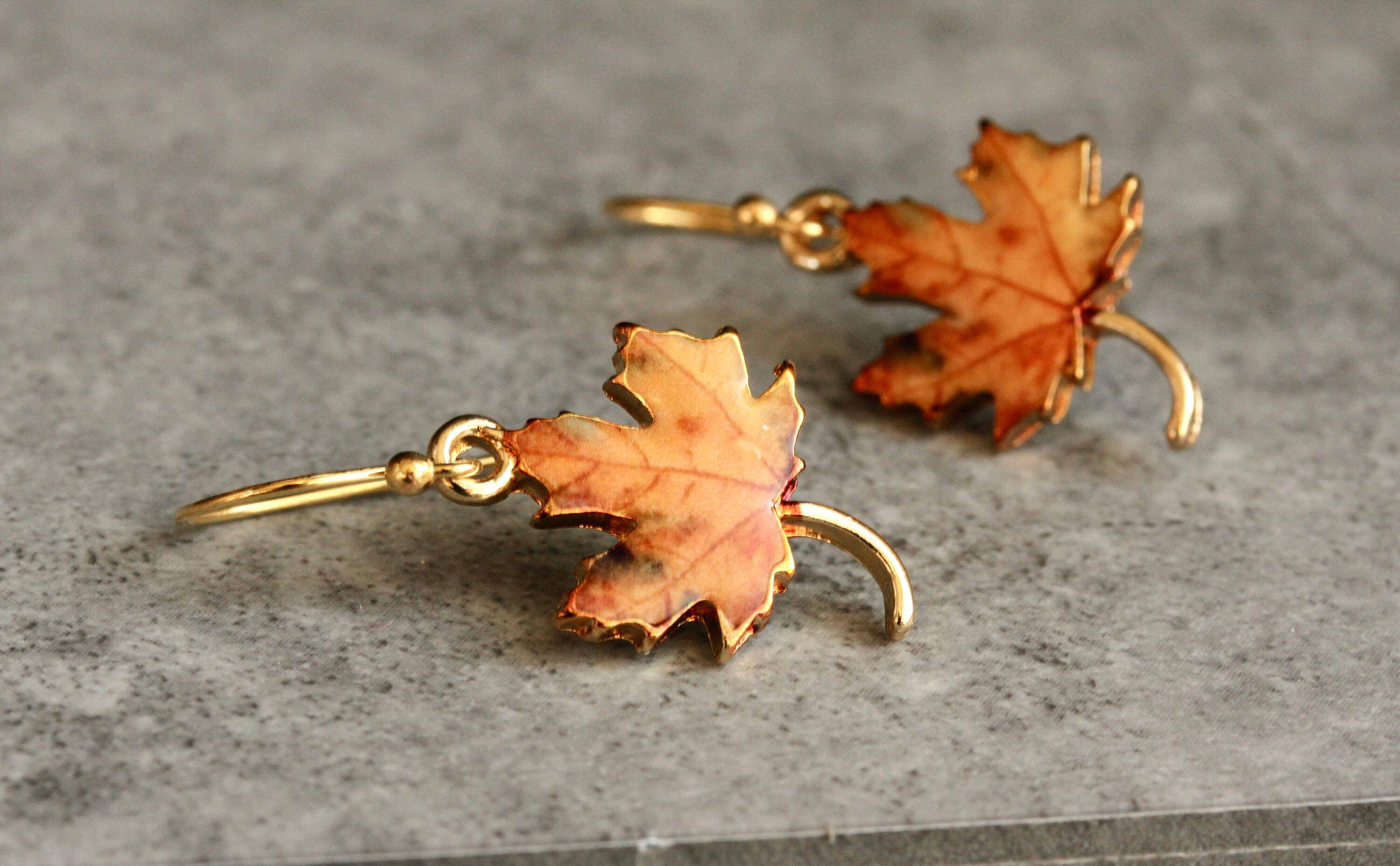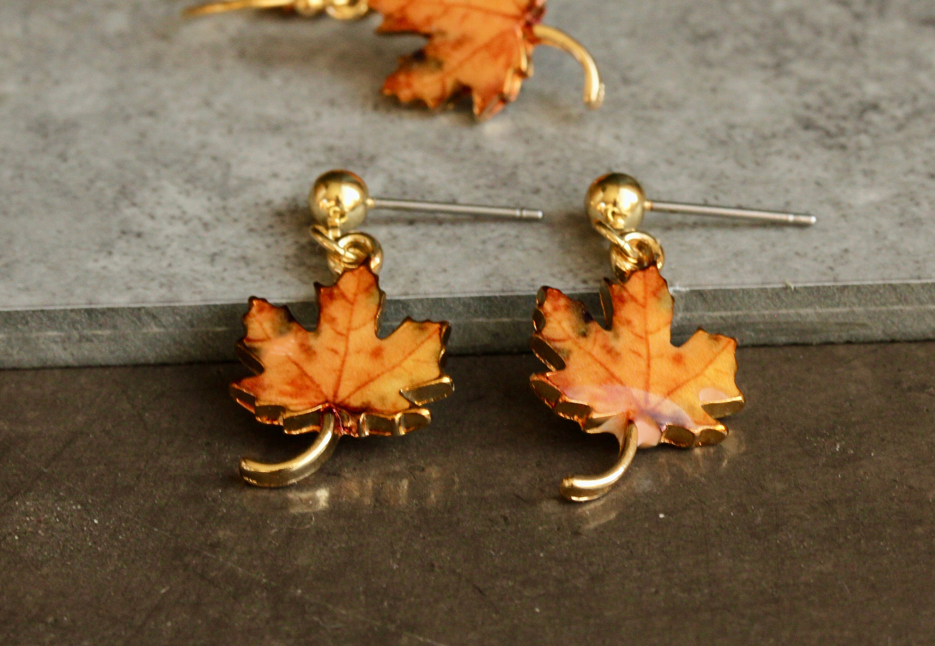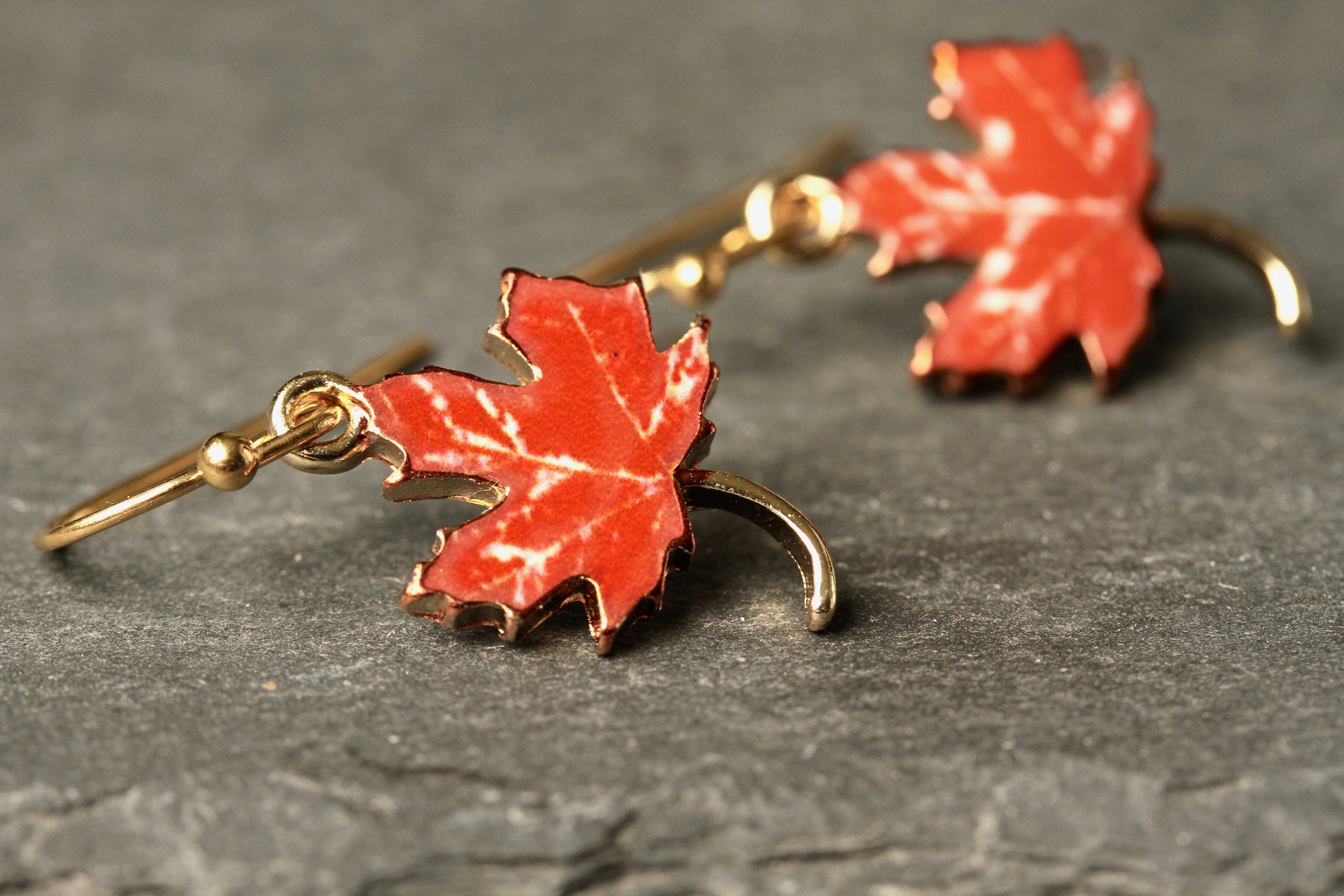 Wunderschöne fein ausgearbeitete Ohrringe mit emaillierten Ahorn Blättern in zwei verschiedenen Varianten. Einmal als Ohrstecker aus Edelstahl oder mit echt vergoldeten Ohrhaken aus Messing. Einfach die gewünschte Variante auswählen.