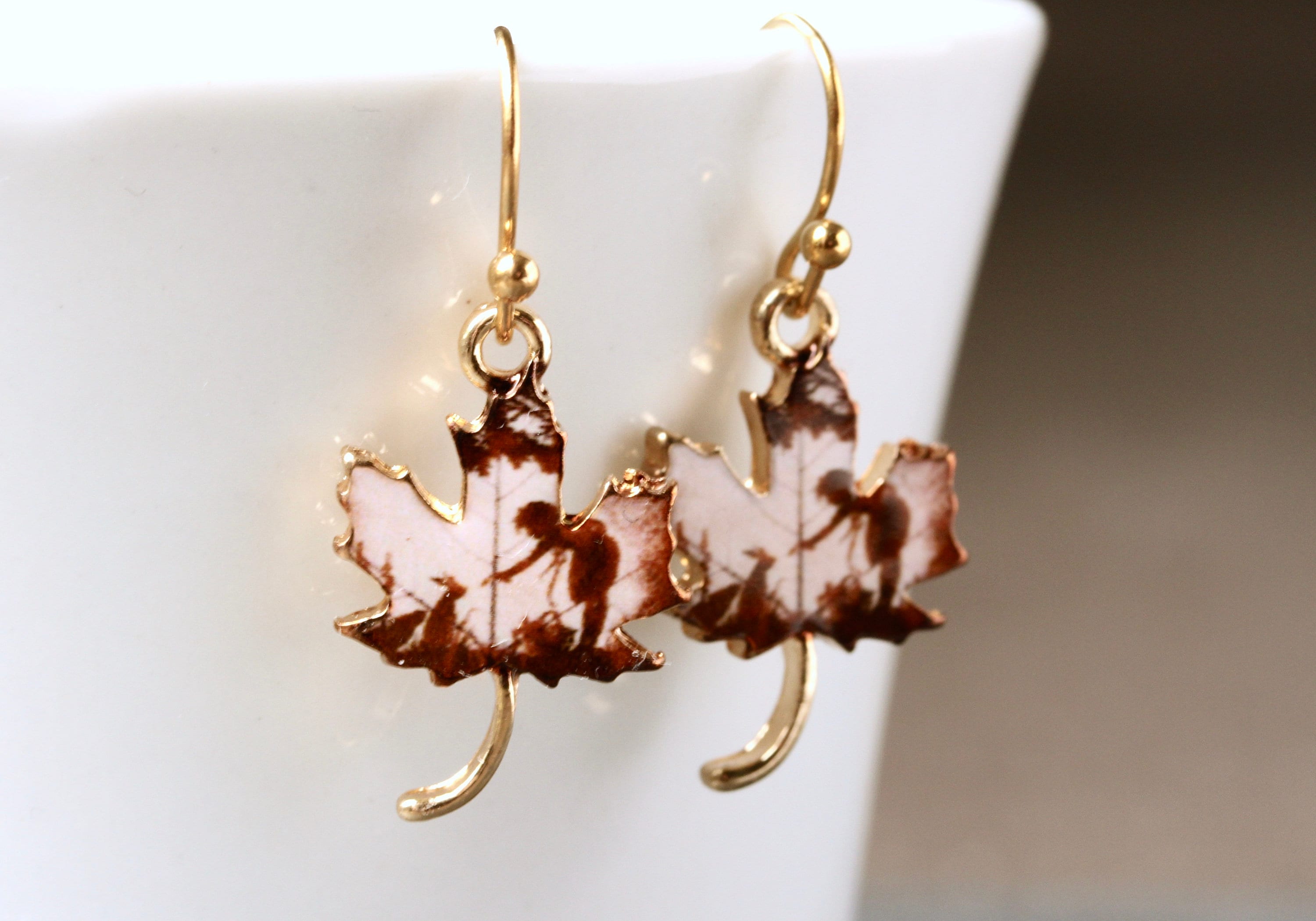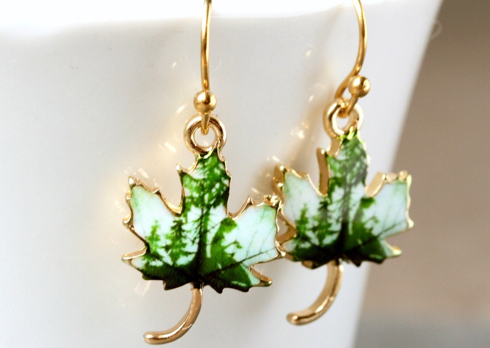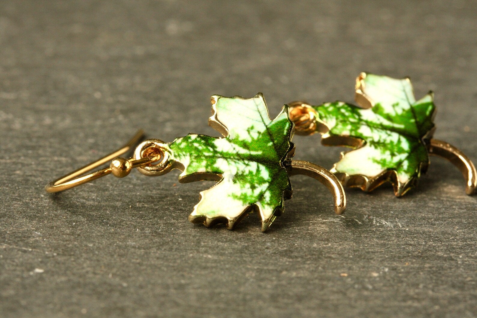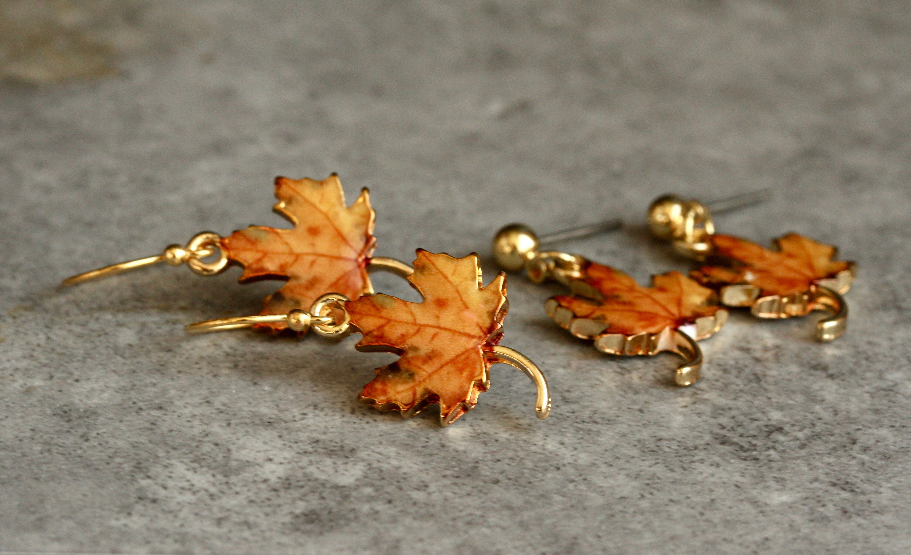 Wunderschöne fein ausgearbeitete Ohrringe mit emaillierten Ahorn Blättern in zwei verschiedenen Varianten. Einmal als Ohrstecker aus Edelstahl oder mit echt vergoldeten Ohrhaken aus Messing. Einfach die gewünschte Variante auswählen.