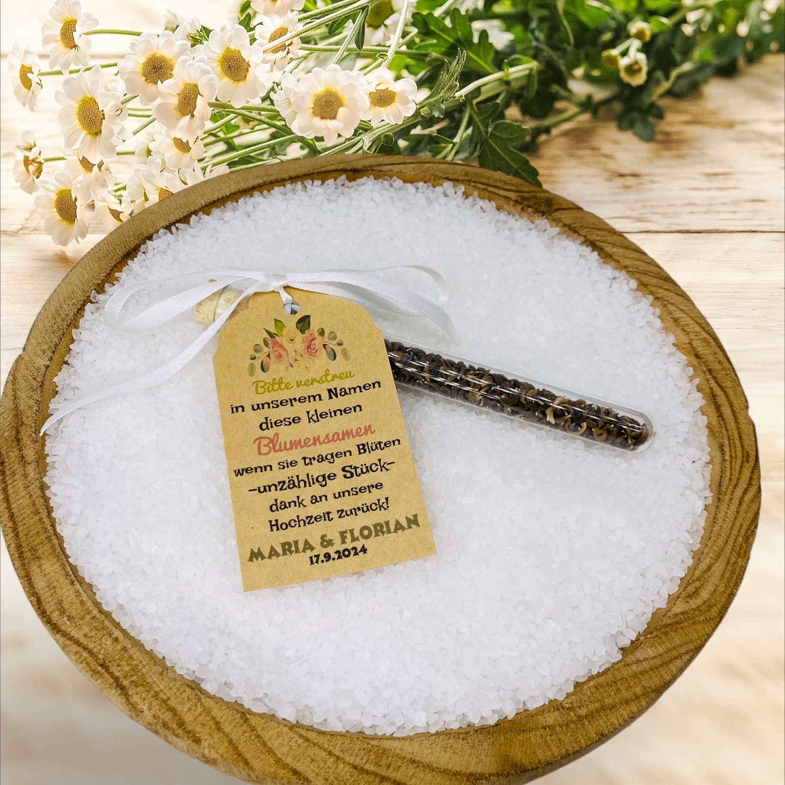 - **Formvollendetes Reagenzglas:** Mit den Maßen 160 mm mal 16 mm präsentiert sich das Reagenzglas als stilvolles Gefäß, das nicht nur die Blumensamen, sondern auch die Liebe des Paares beherbergt.