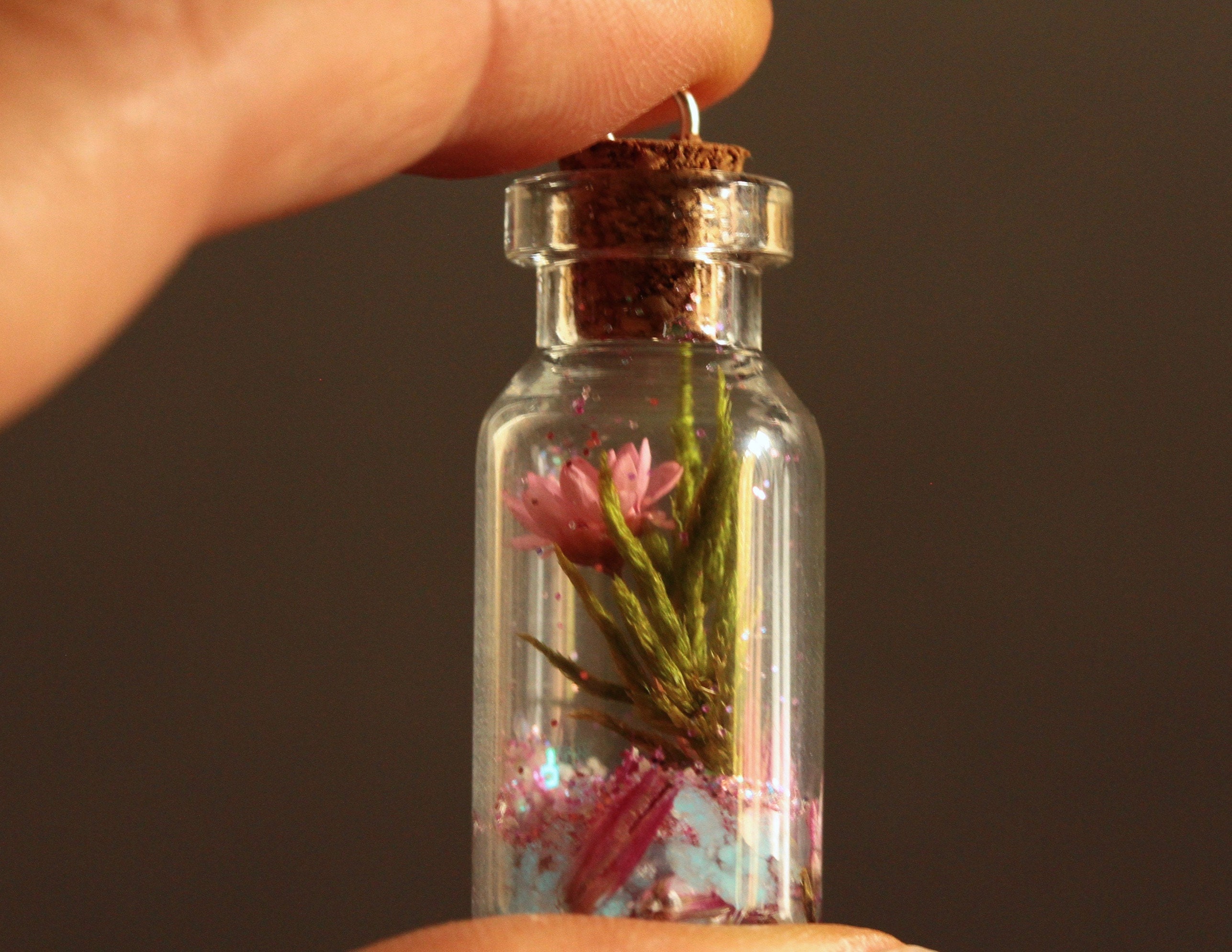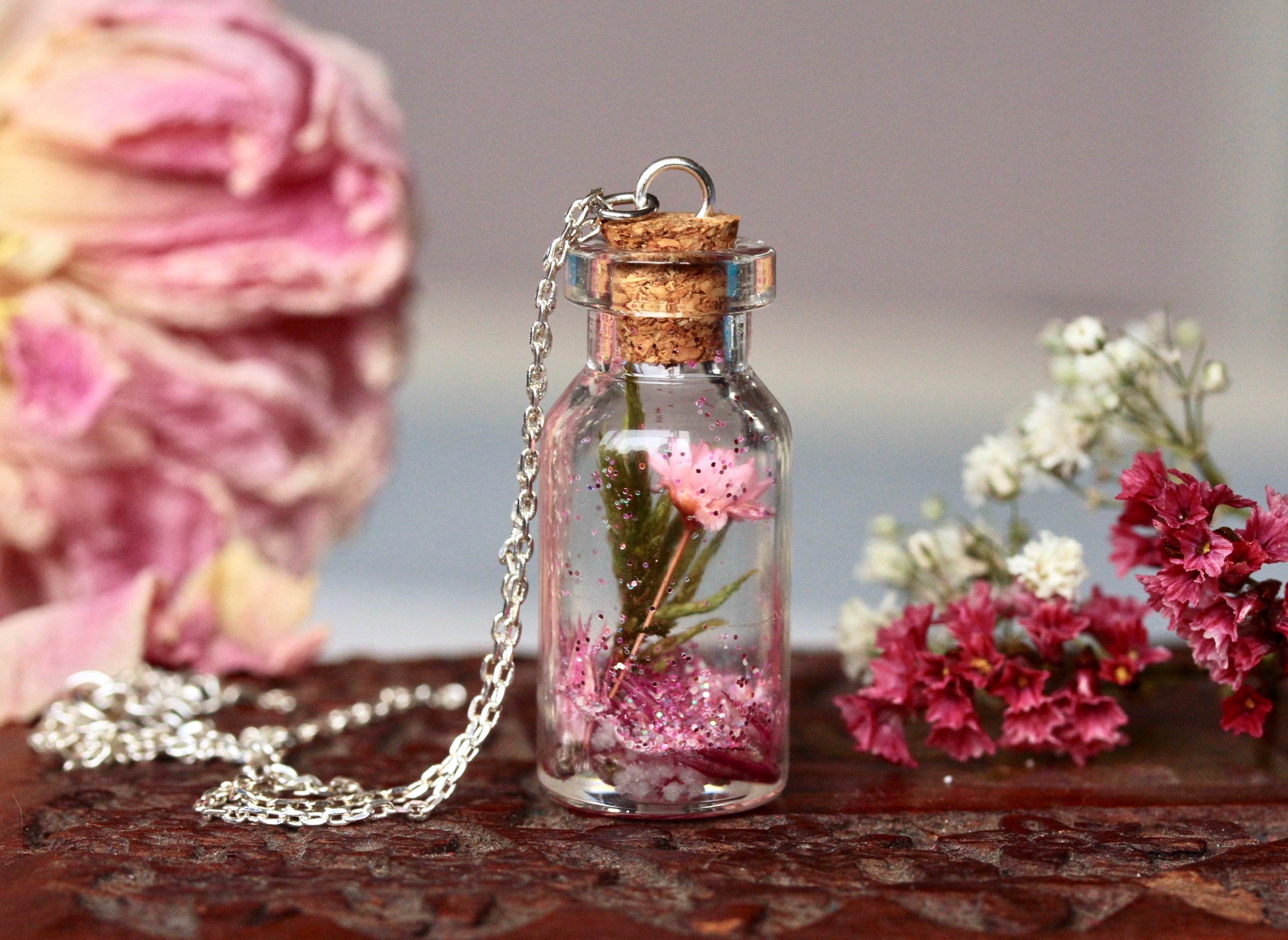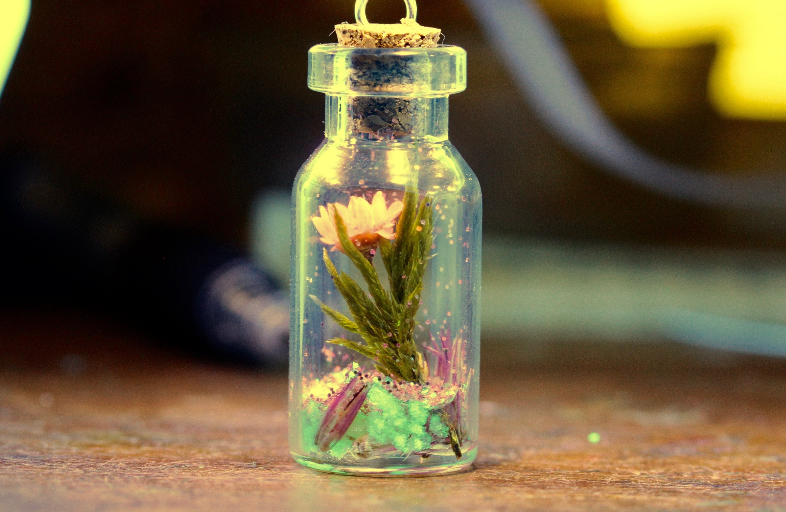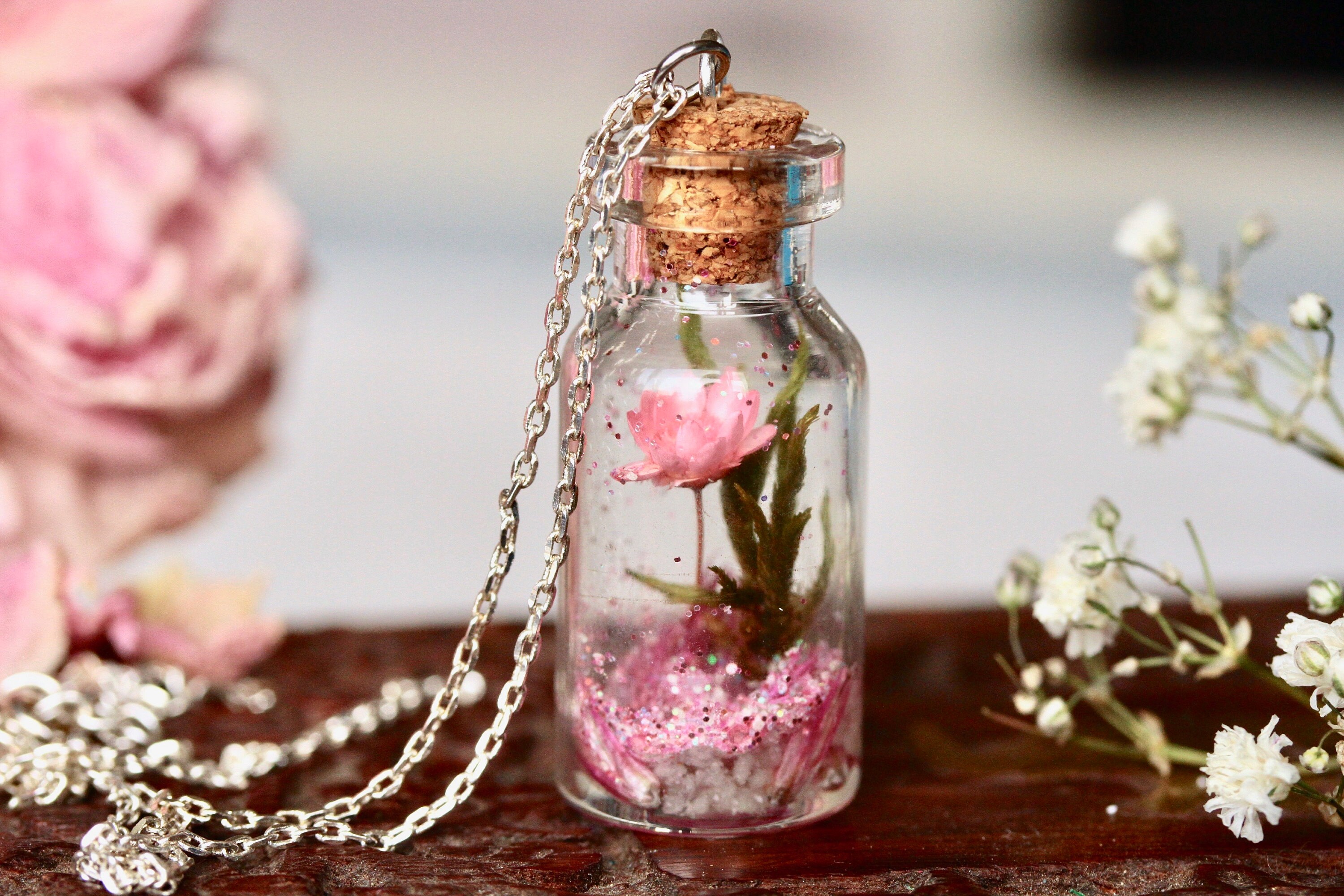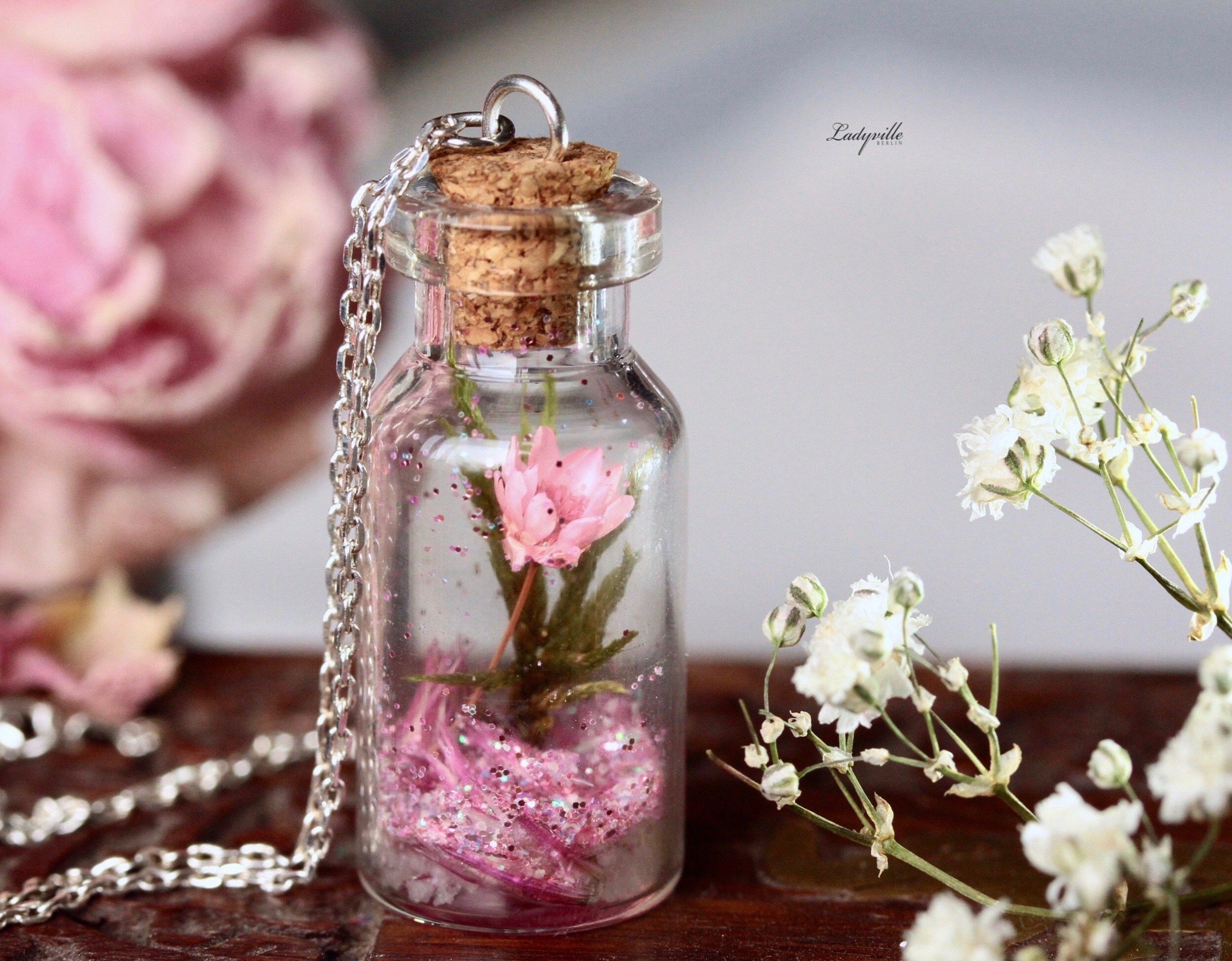 Echte Blumen Kette in Harz gegossen, nachtleuchtend, Terrarium Kette mit getrockneten Pflanzen, wie ein botanischer Garten der im Dunklen leuchtet. Ein außergewöhnliches Geschenk für Naturliebhaber, zum Muttertag, Geburtstag oder einfach statt einem Blumenstrauß. Wie ein Stück Wiese mit Blumen in einer Glasvase, kommt diese kleine Kette daher. Mit rosa Blüte, Moos, Kiesel, Glitzer und etwas nachtleuchtenden Steinchen - diese einfach unter einer Lampe aufladen. Damit nicht alles hin und her wirbelt, wurde alles am Boden mit Gießharz sorgfältig fixiert. Außer der Glitzer, der darf sich frei bewegen. Ein wunderbar schönes Geschenk für alle Liebhaber der Natur, Blumen und Sommerwiesen. Vielleicht für eine passionierte Gärtnerin, oder jemanden, der nur die hübsche kleine Dinge im Leben zu schätzen weiß.Â